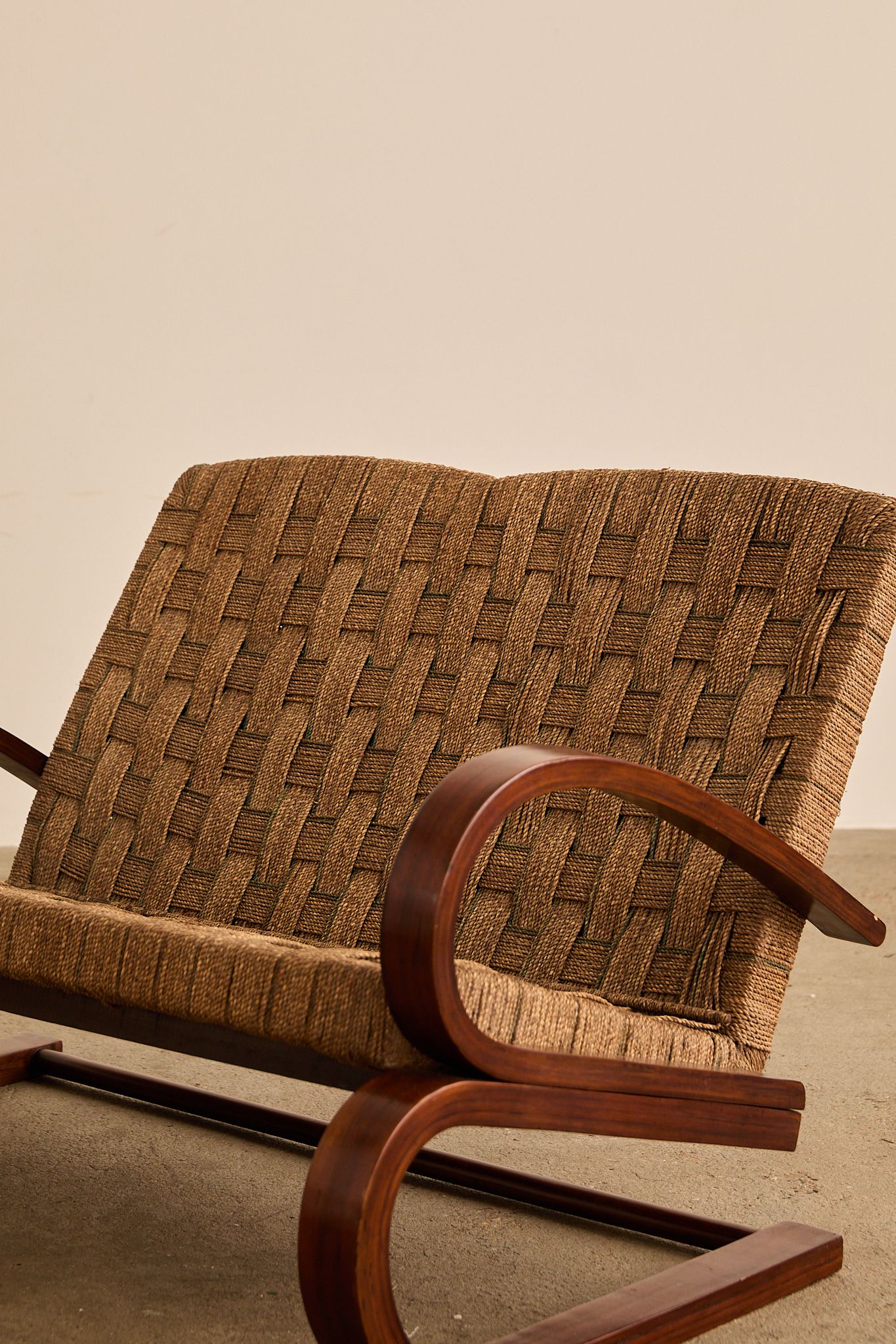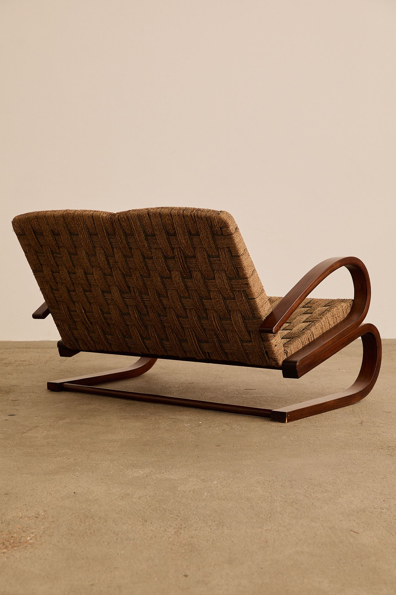1940s Italian lounge settee with a sculptural steam-bent wood frame and hand-woven rope/cord seat and back; attributed to Italian rationalist architect and designer Giuseppe Pagano.