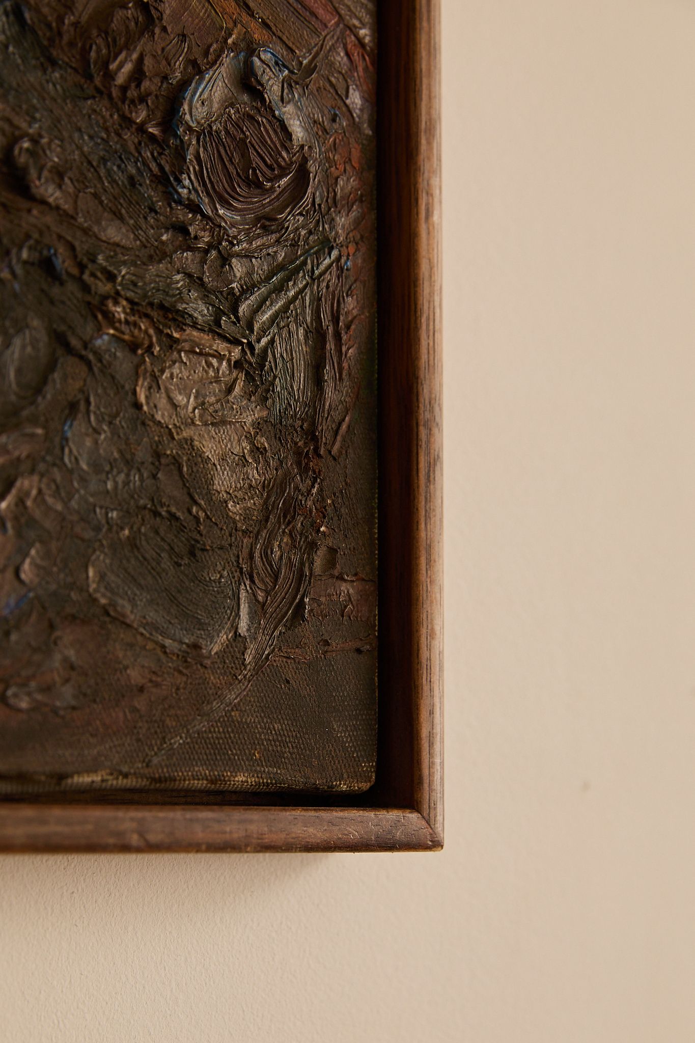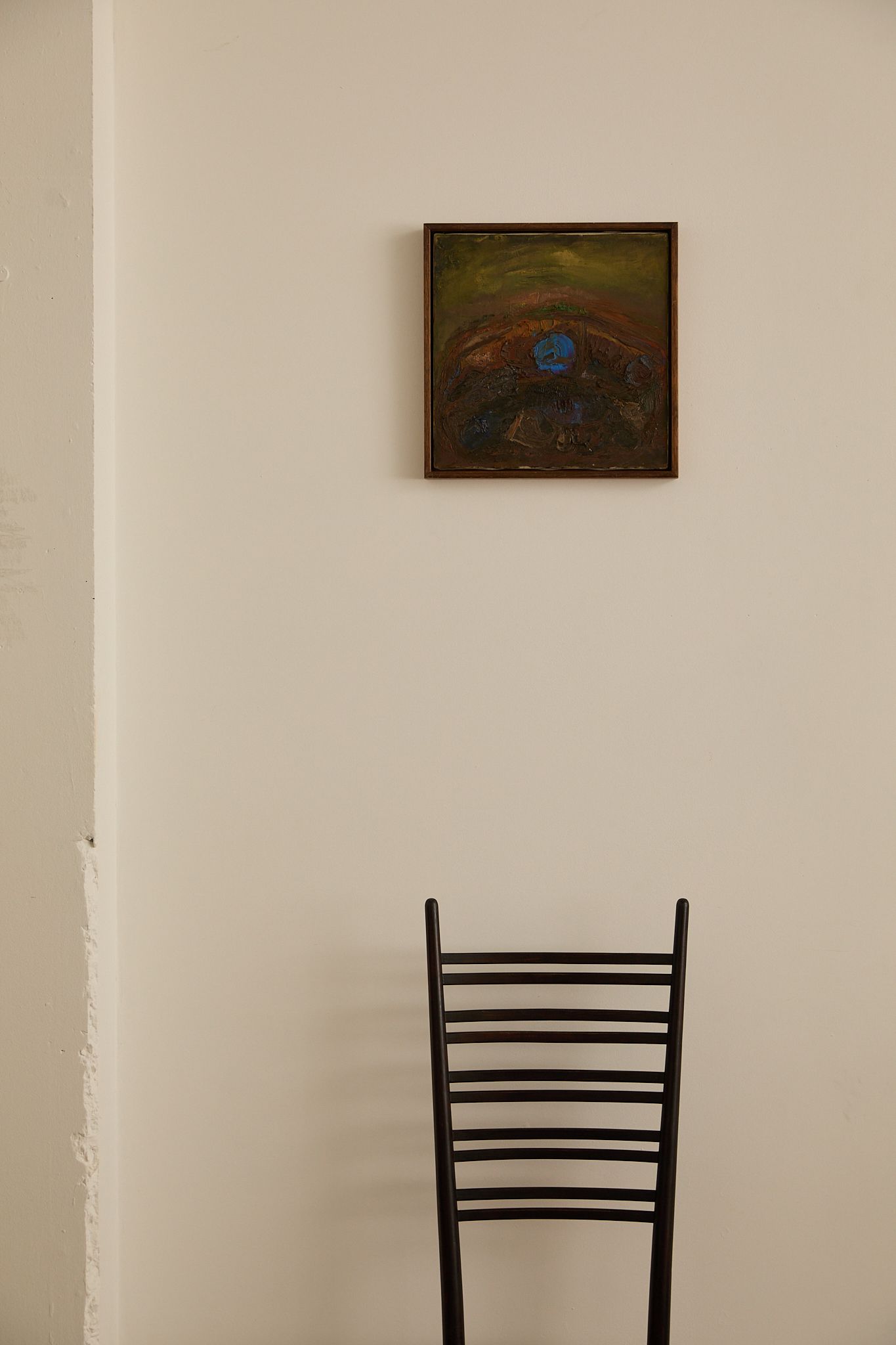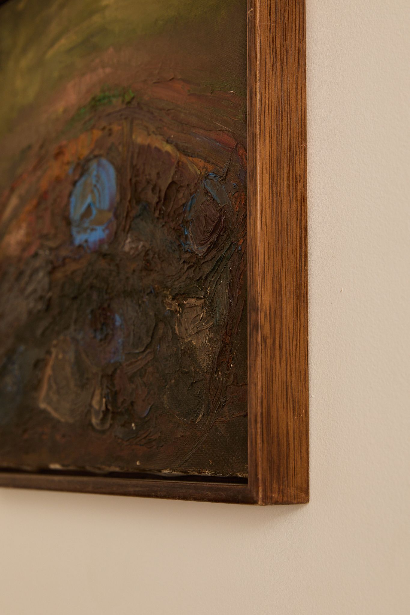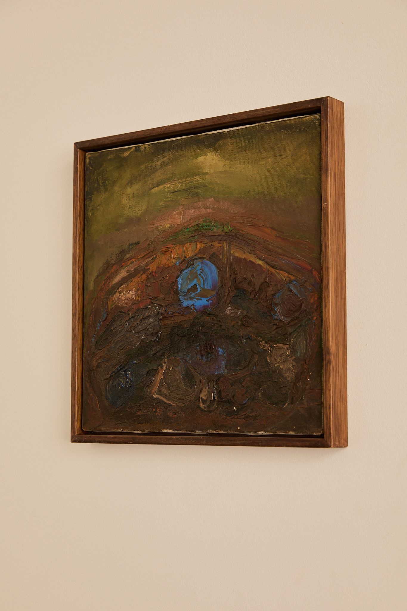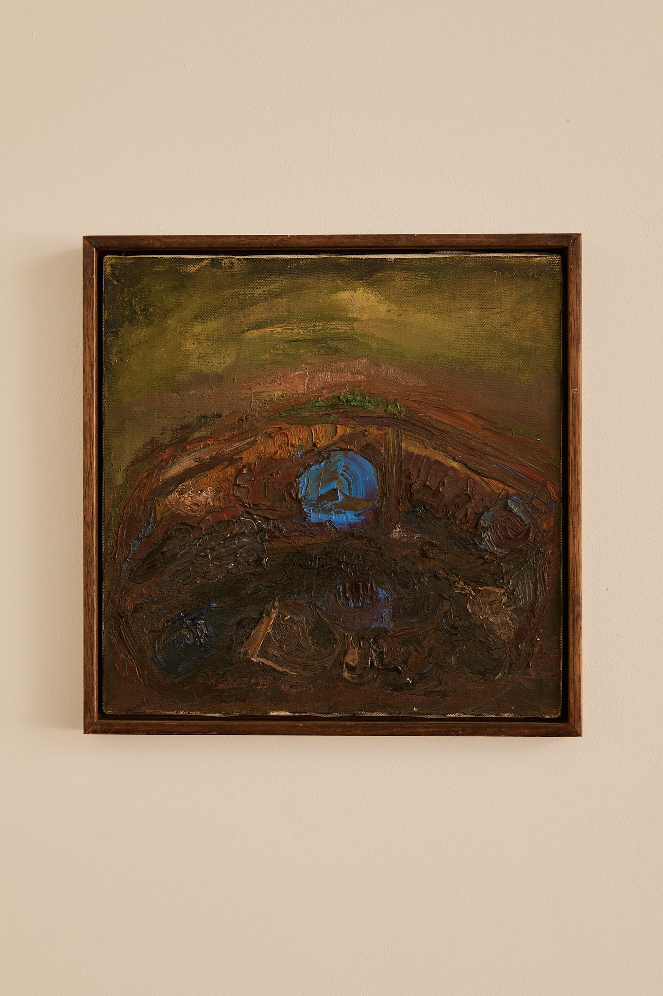 An abstract painting with rich, layered texture and an earthy palette of browns, greens, and deep blues. The composition suggests a buried horizon or inner landscape, with a subtle blue focal point emerging from the darker surface. Presented in its original wooden frame, which forms an integral part of the work. Italian painter Goliardo Padova (1909–1979) fused Po Valley lyricism with modern Milanese currents—from Chiarismo to Corrente—leaving a quietly radical, grain-lit body of work.