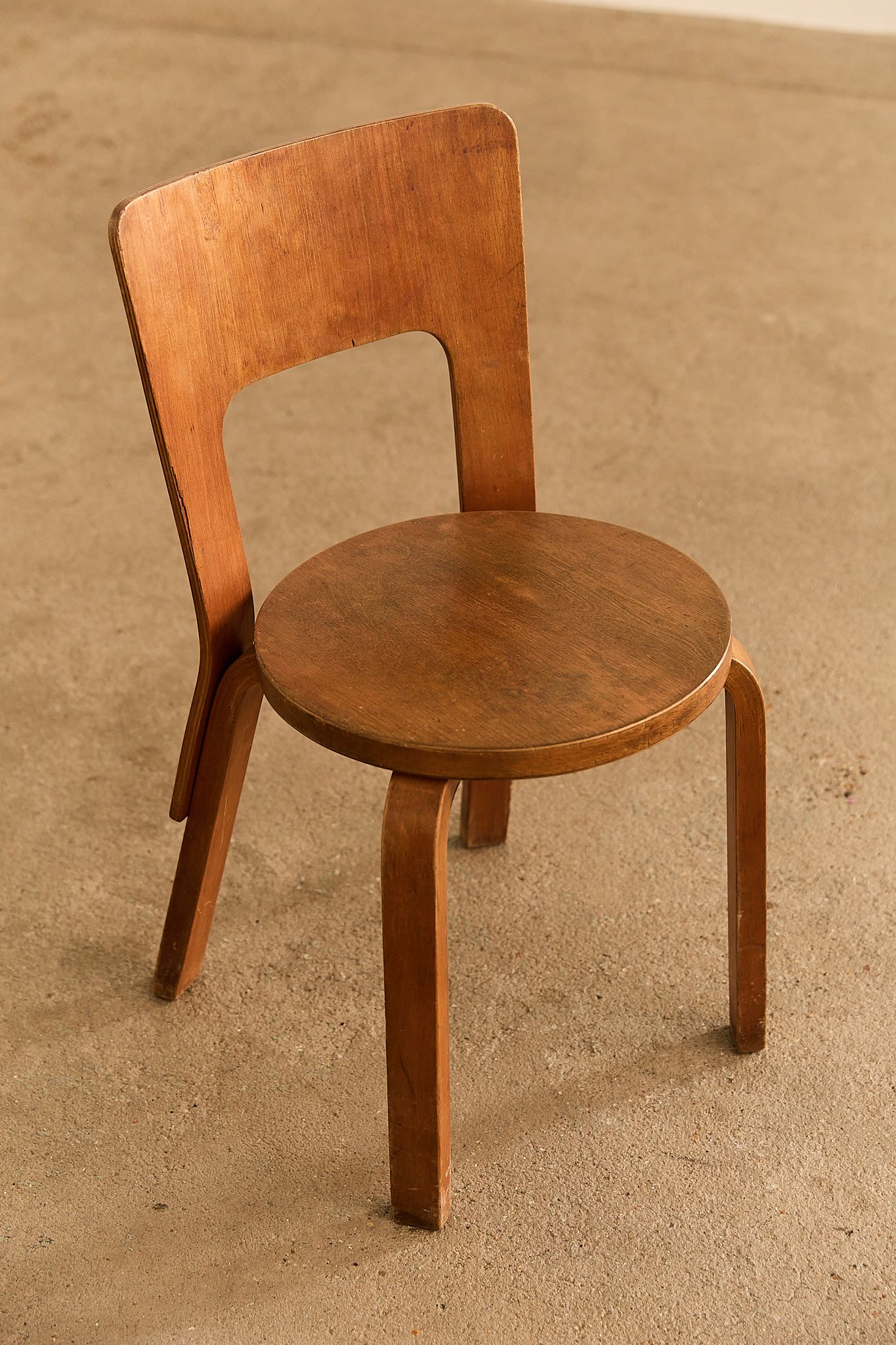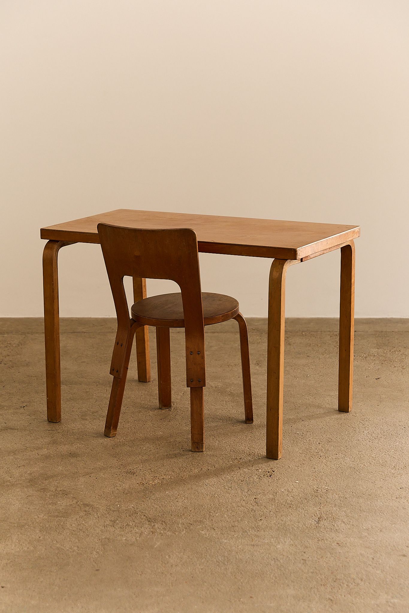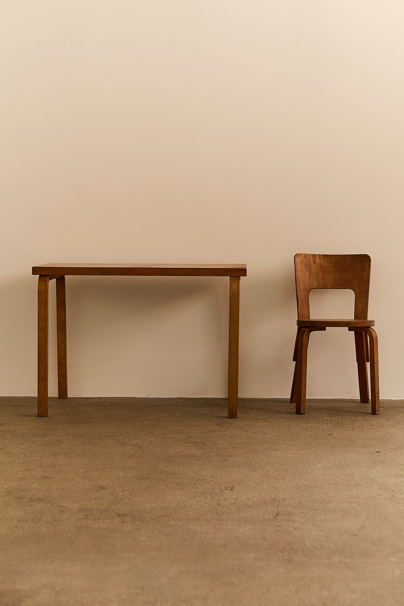 This is an early version of Alvar Aalto’s Chair 66 (1935) and Table 81B, designed in the 1930s. Crafted from birch with Aalto’s iconic L-leg construction, the set reflects his pioneering approach to modern design. Marked “Aalto Design Made in Finland”, these pieces are rare examples of early Finnish modernism.