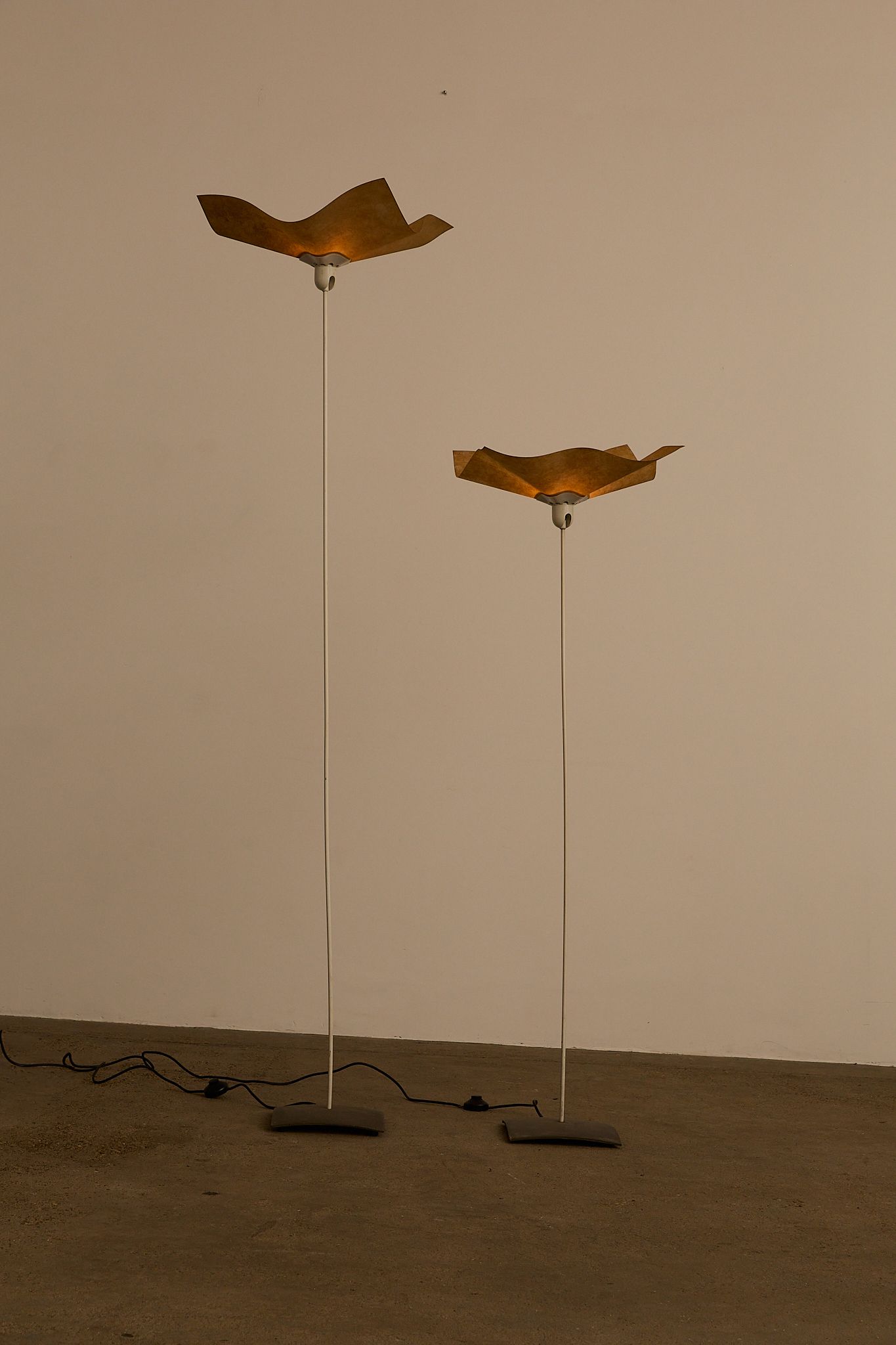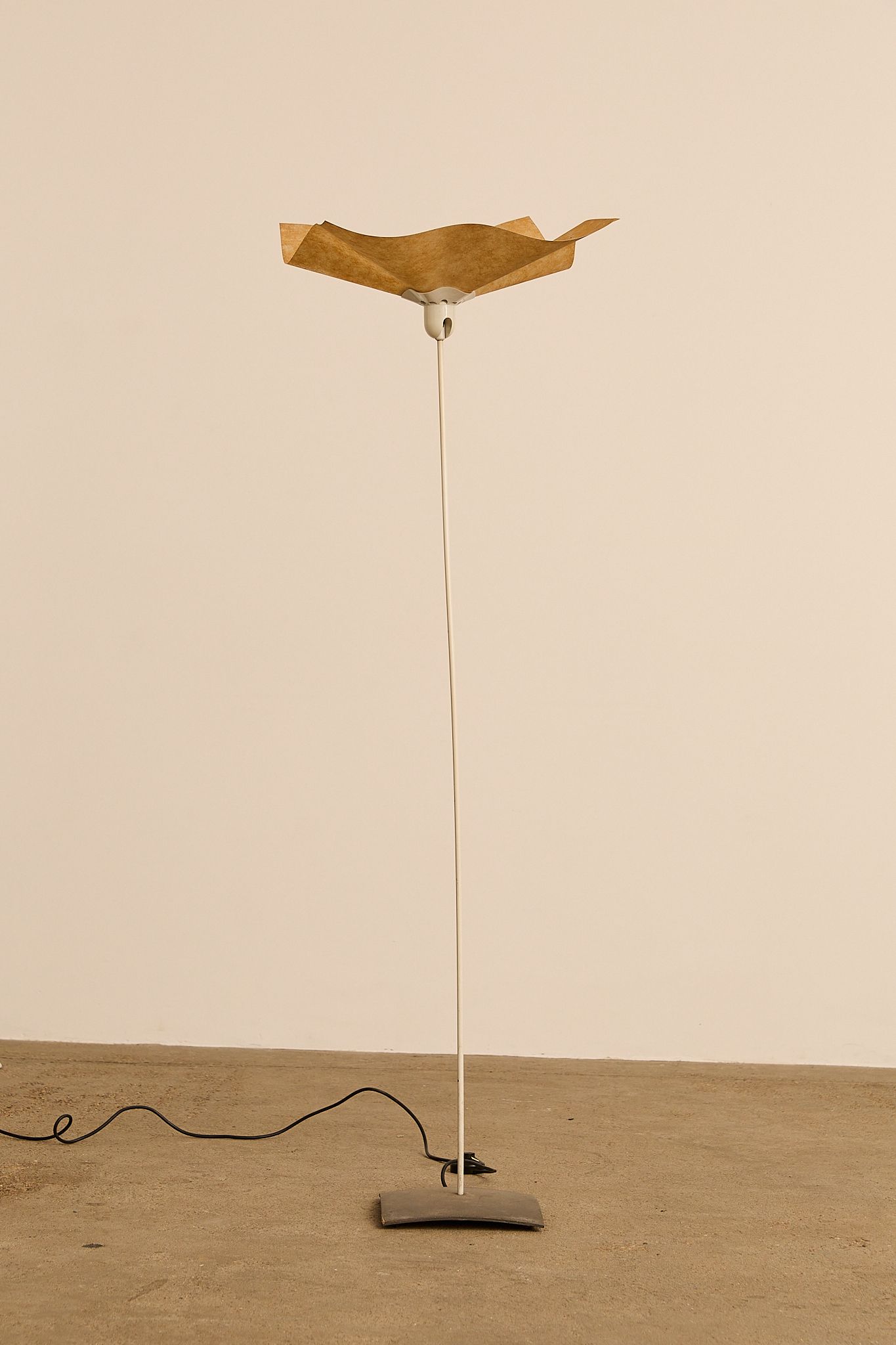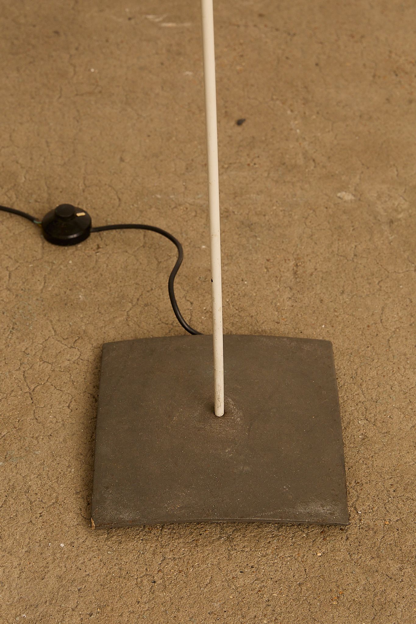 Designed by acclaimed Italian architect Mario Bellini (1935–) for Artemide, the Area floor lamp perfectly balances form and function. Its long, slender stem supports a sculptural, petal-like shade reminiscent of a flower in bloom. The adjustable head, mounted on a pivoting joint, allows for directional lighting. A taller version is available too, please enquire for the pair.
