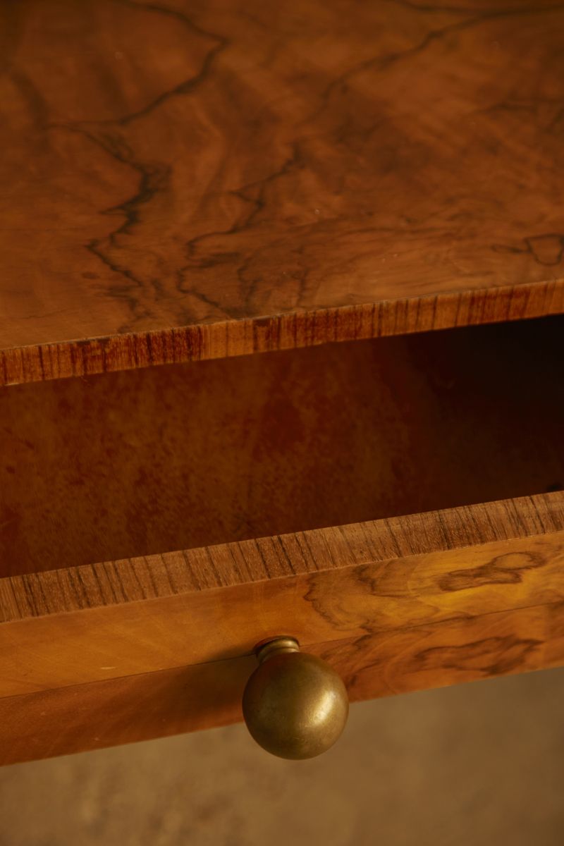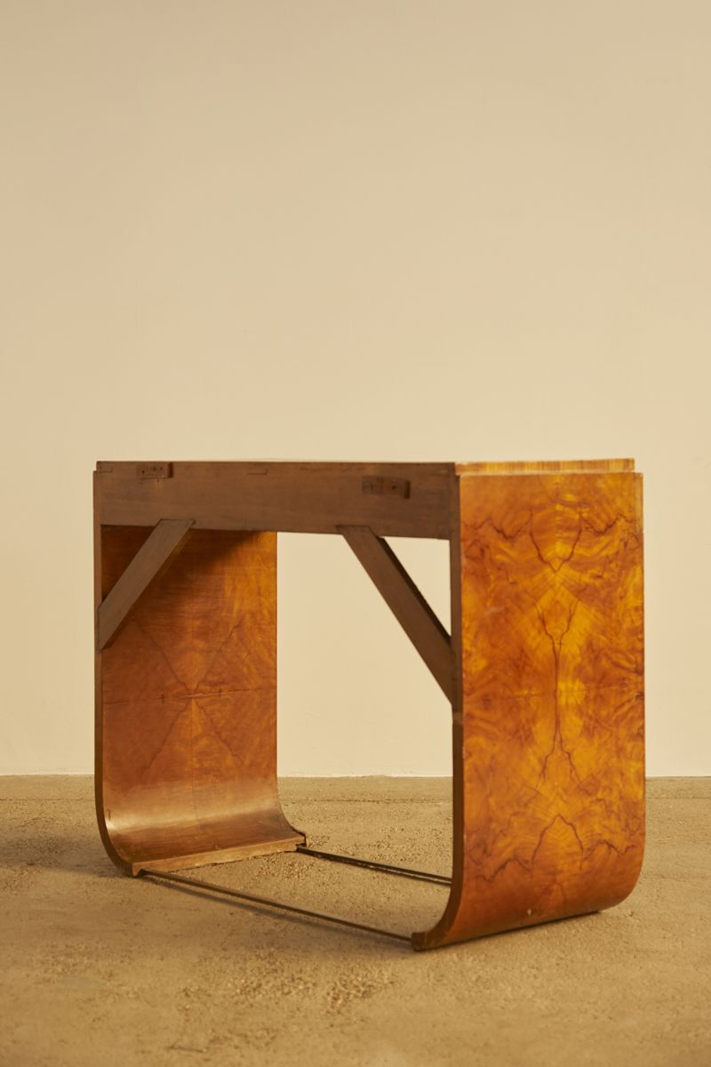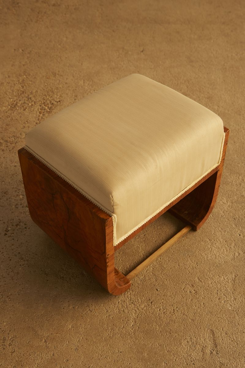 This elegant Art Deco desk features a rich burlwood veneer, brass knobs, and sleek geometric lines characteristic of the era. Accompanied by its matching ottoman, upholstered in the original fabric, this set exudes vintage charm and sophistication. The desk’s compact size and timeless design make it a perfect addition to a stylish workspace or bedroom.