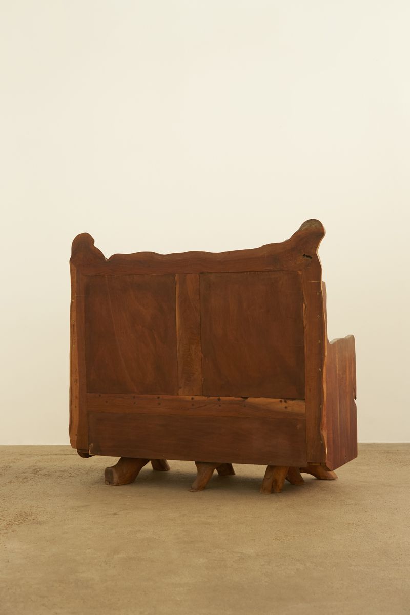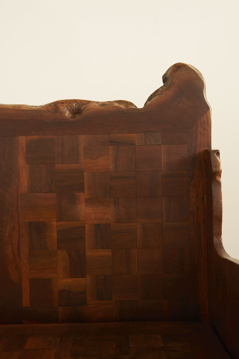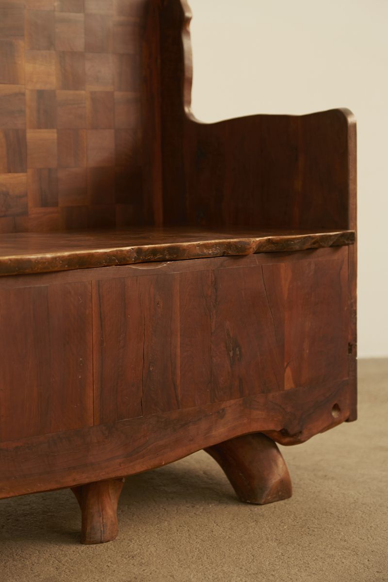 A very unique bench in olive wood with a handcrafted aesthetic, featuring a woven wood backrest, sculpted edges, and natural wood grain details. The sturdy design includes a storage compartment beneath the seat, making it both functional and decorative.