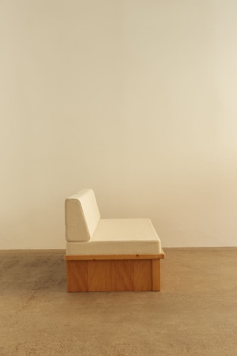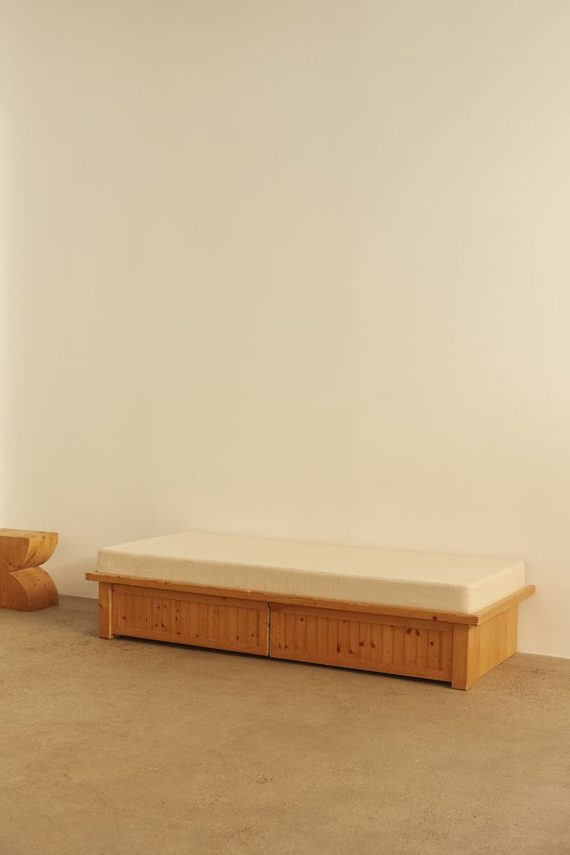 Originally part of the iconic Résidence Nova in Les Arcs, designed by Charlotte Perriand, this sofa bed features a pine slat structure with discreet rolling drawers hidden behind a drop-down front. The seat mattress and foam cushions are upholstered in luxurious Mont-Blanc wool by Nobilis, adding to its refined, timeless appeal.