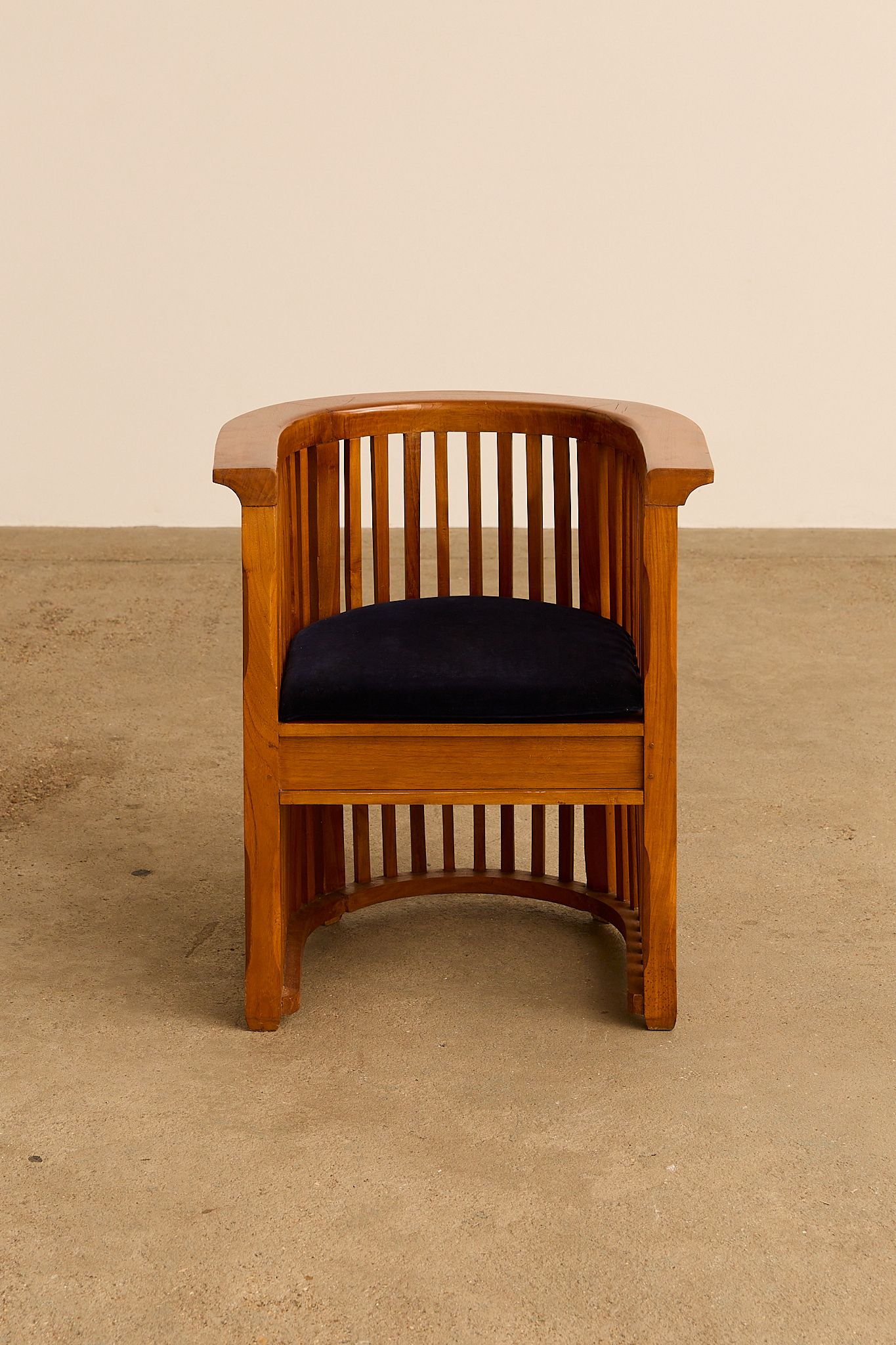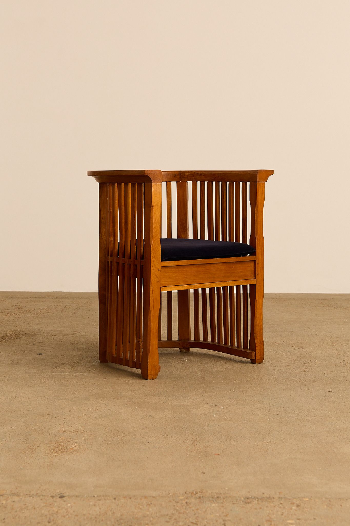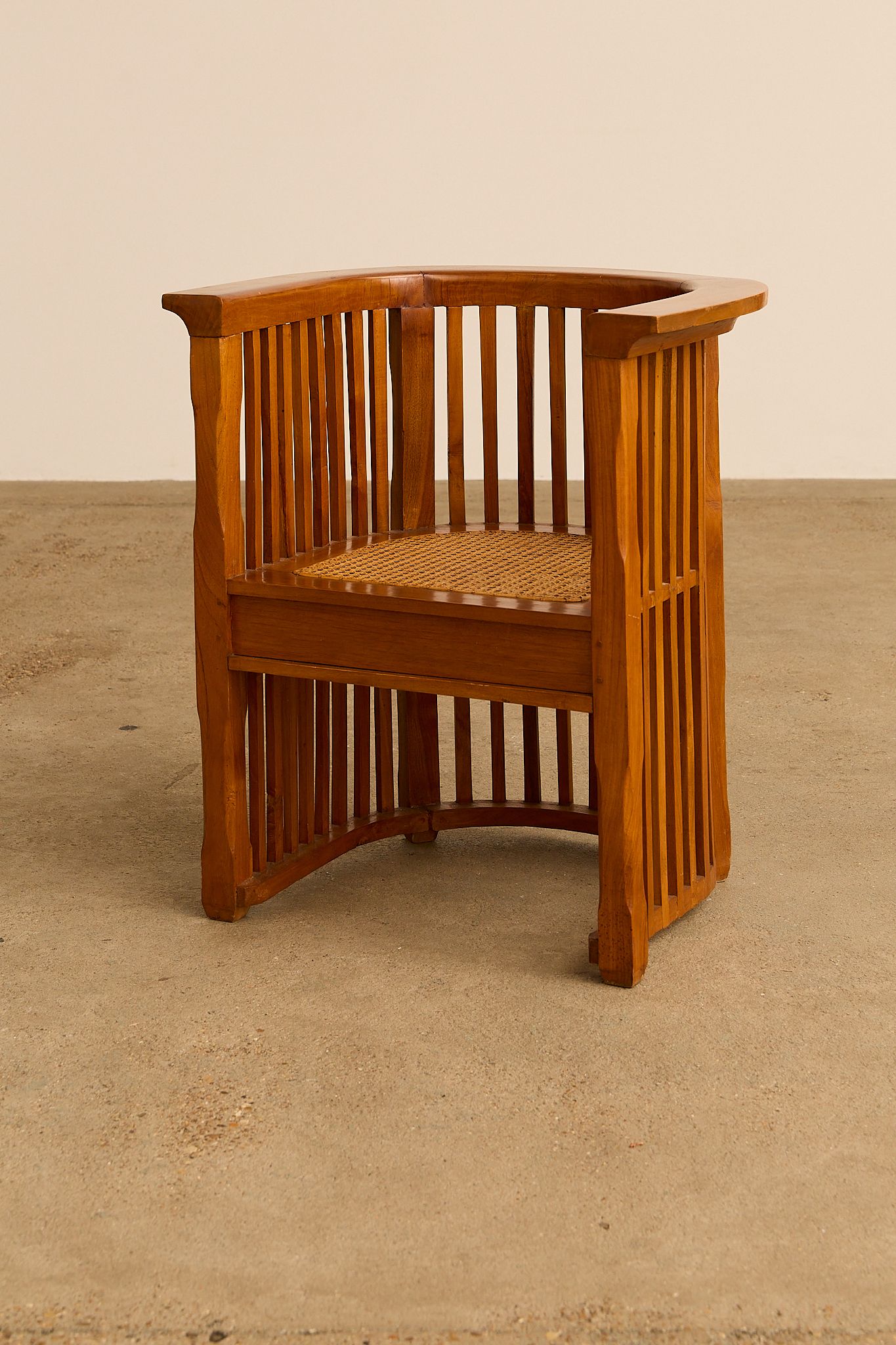 A barrel chair in the style of Josef Hoffmann, featuring a curved wooden frame with vertical slats and a woven wicker or loose upholstered seat. Combining geometric precision and craftsmanship, it reflects the elegance of Viennese modernism.