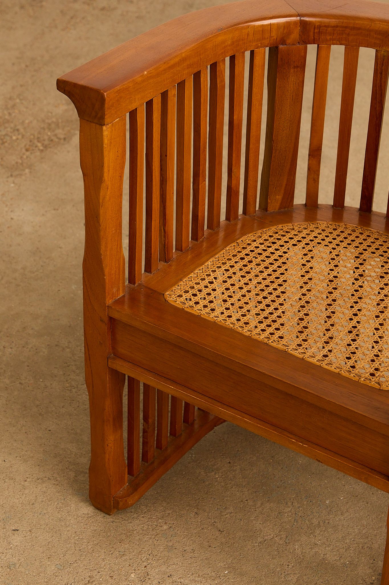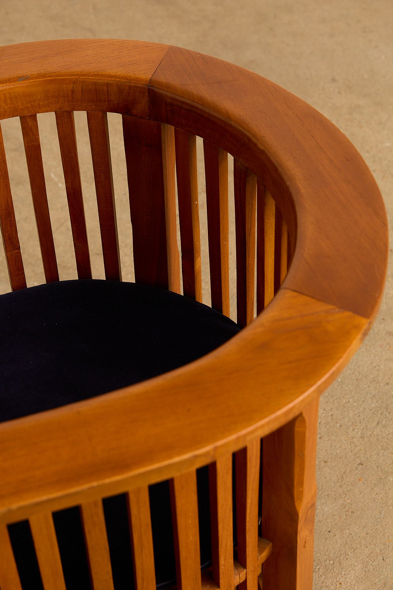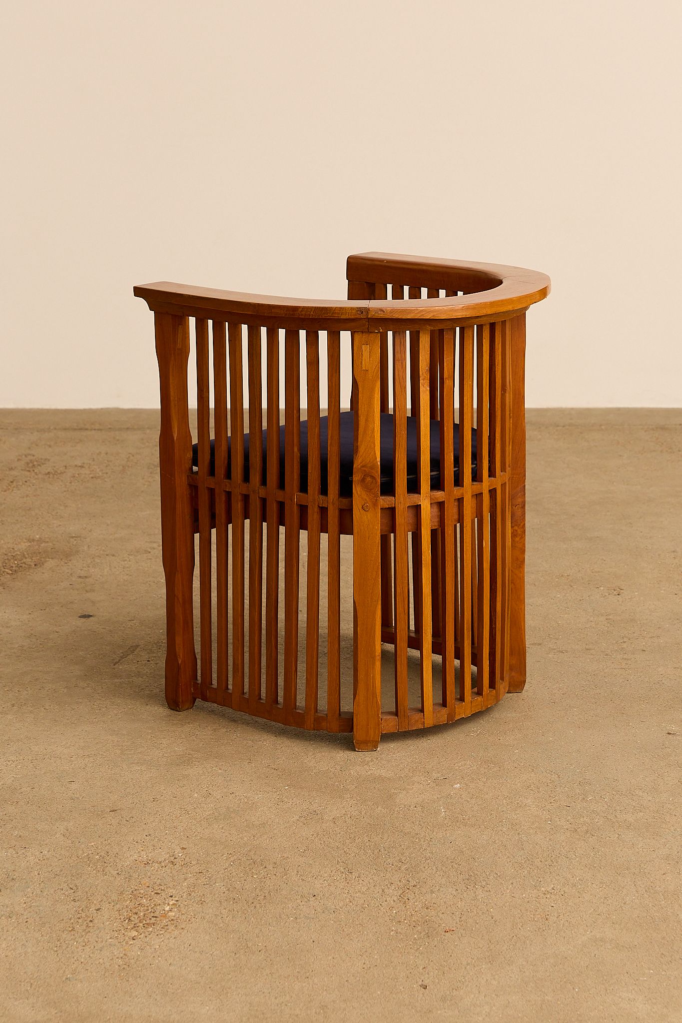 A barrel chair in the style of Josef Hoffmann, featuring a curved wooden frame with vertical slats and a woven wicker or loose upholstered seat. Combining geometric precision and craftsmanship, it reflects the elegance of Viennese modernism.