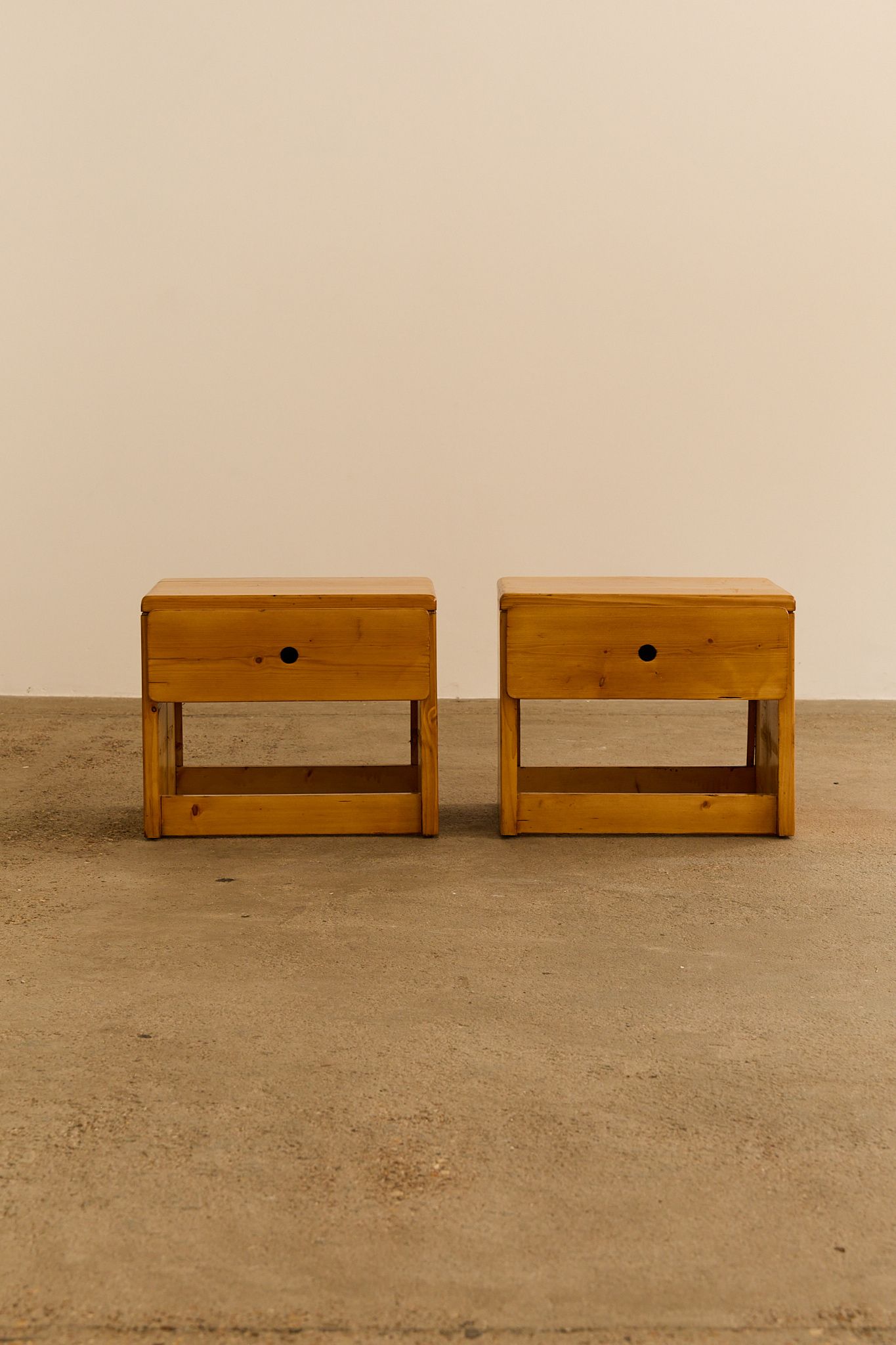 A pair of bedside tables with one drawer with circular pull handle, selected by Charlotte Perriand to furnish the Arcs 1800 apartments, a real estate project to which she devoted nearly 20 years of her life. Price is for the pair.