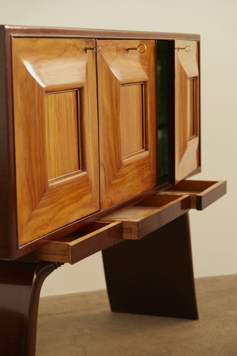 A sophisticated bar cabinet with a sculptural base and paneled wood doors. The mirrored interior, complete with a glass drop-down serving surface, enhances its elegance and functionality.