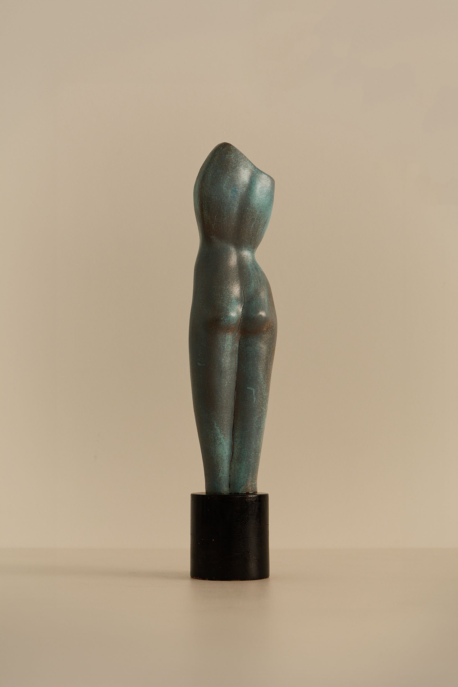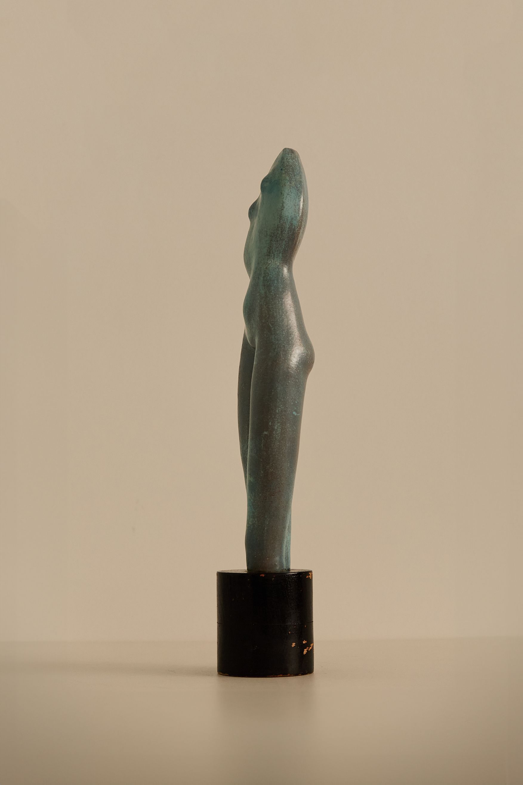 A minimalist ceramic sculpture of a female torso with flowing, abstracted curves and a mottled turquoise glaze; mounted on a black wooden base.
