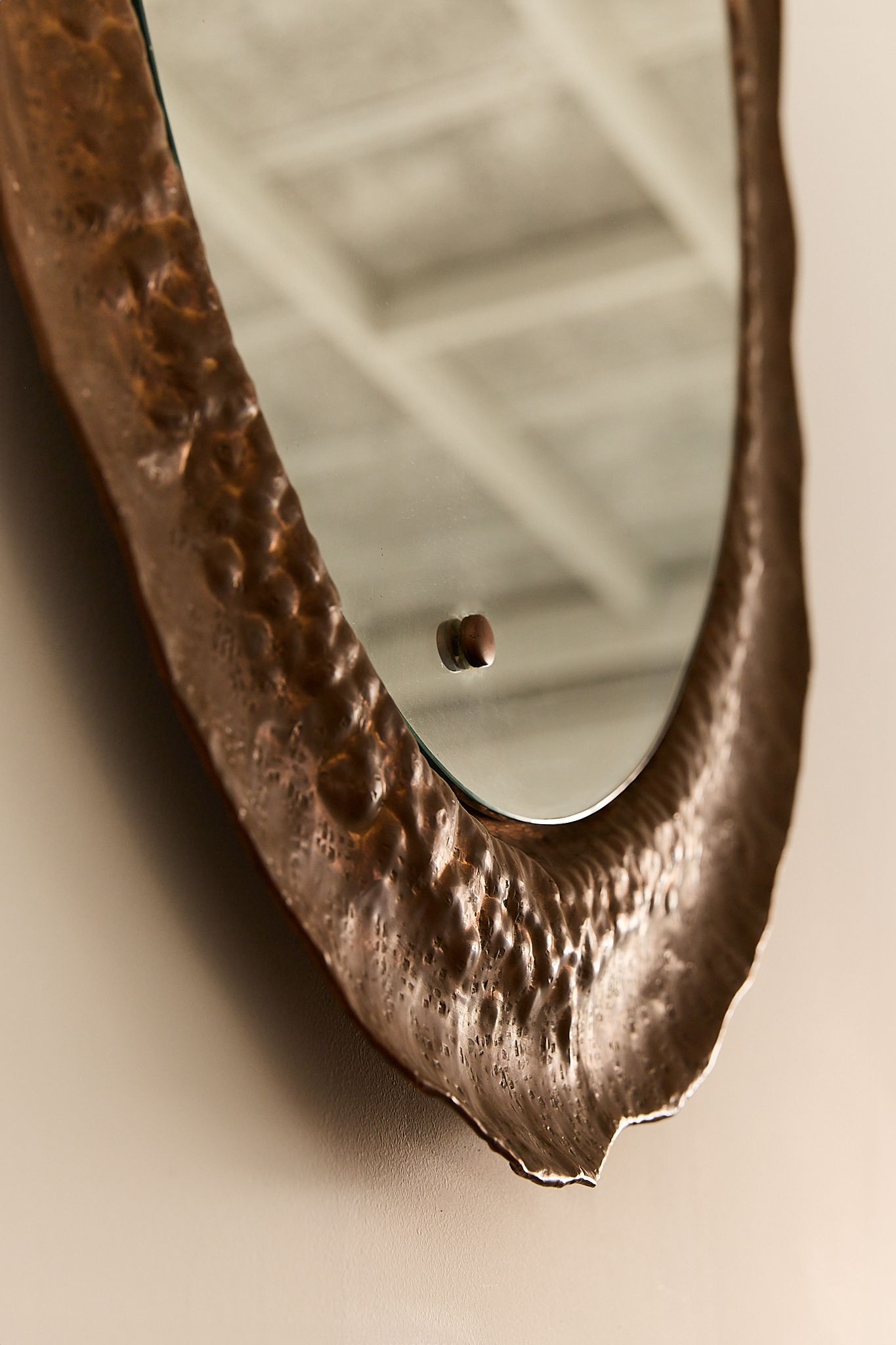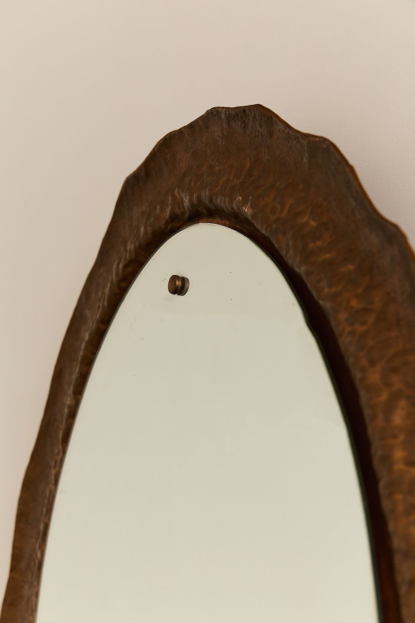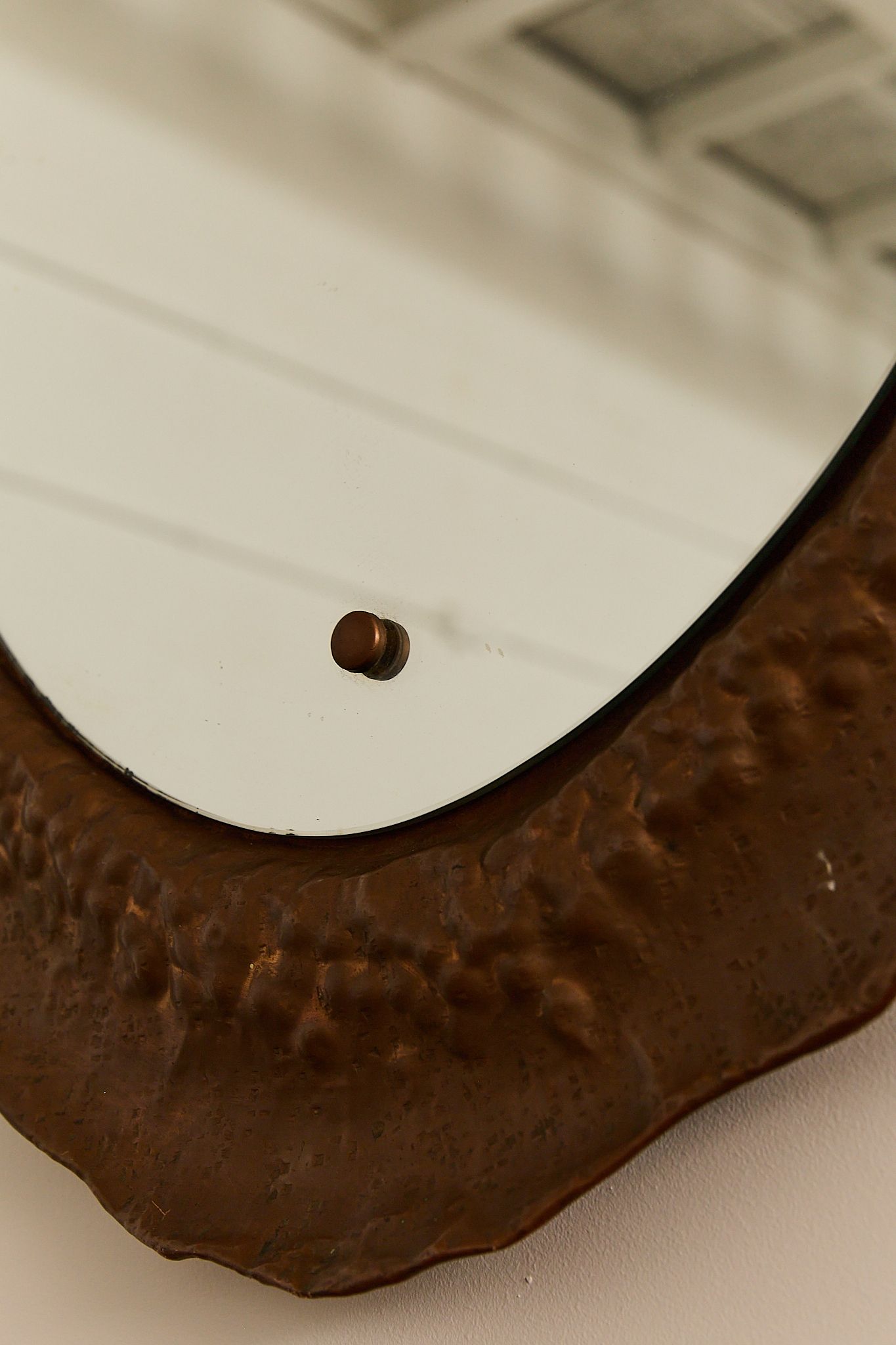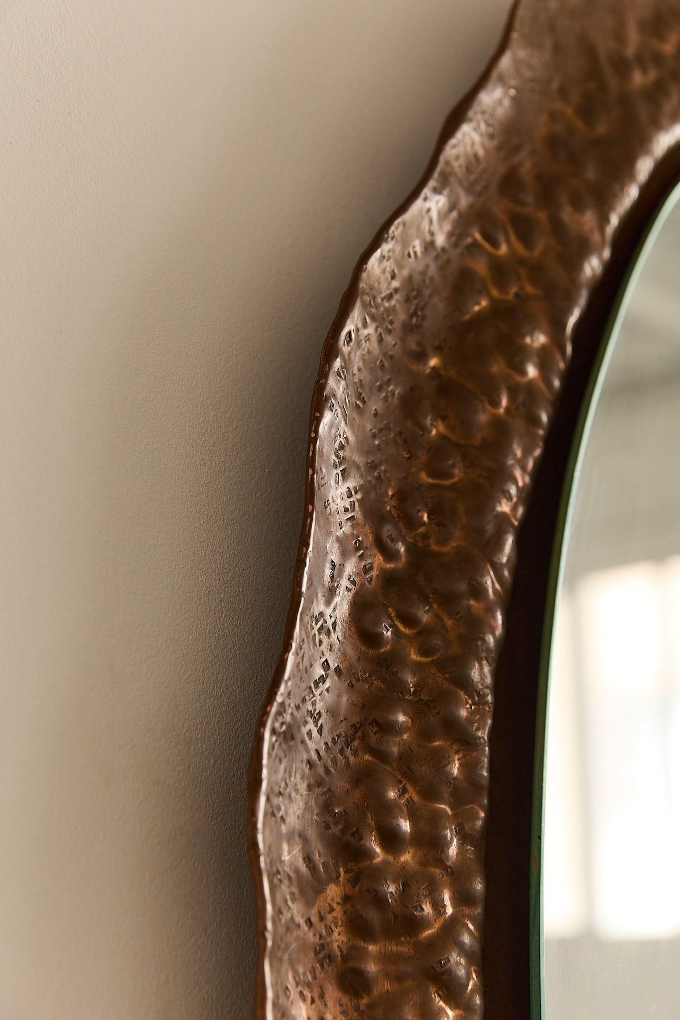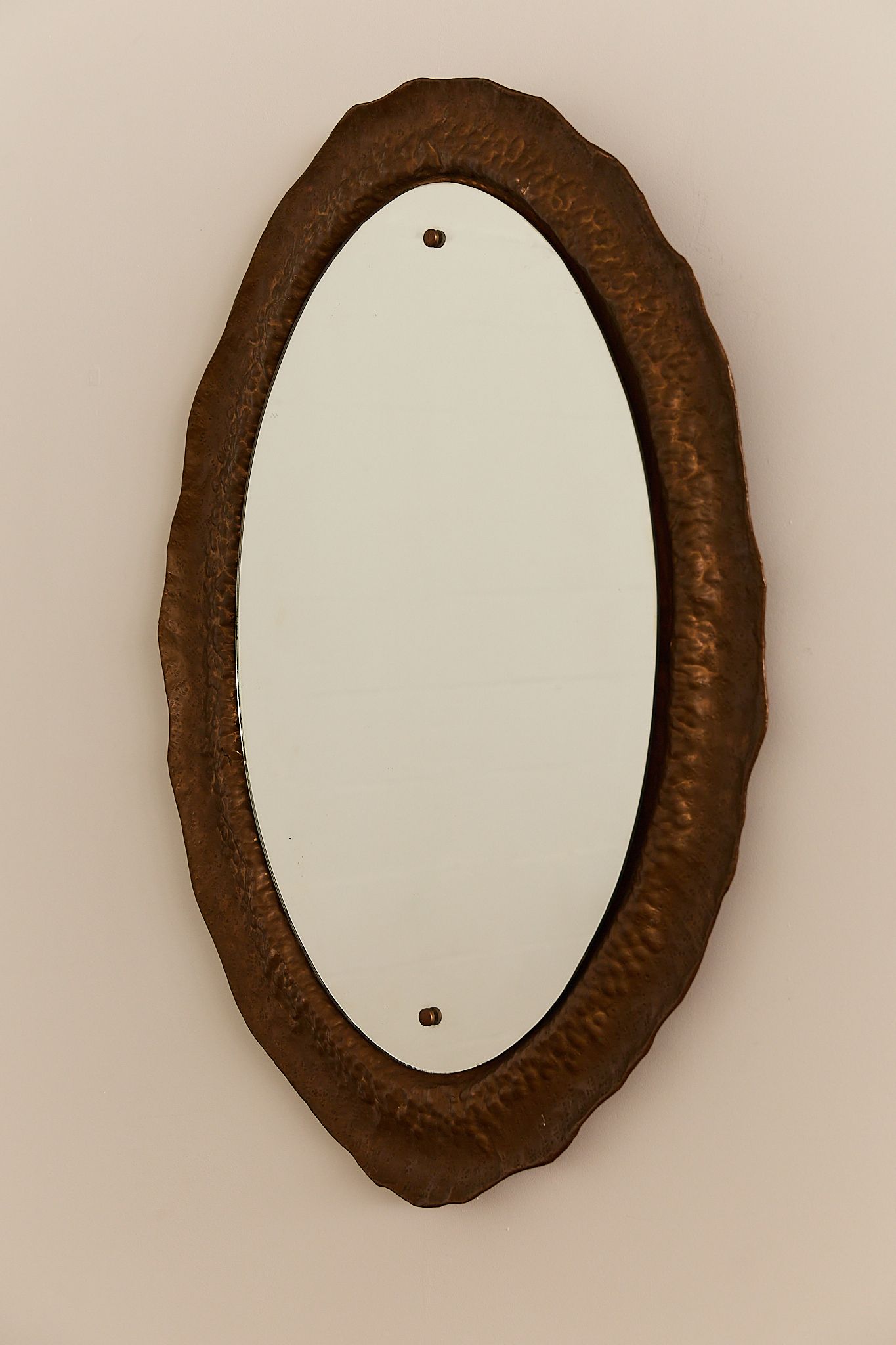 A distinctive oval wall mirror crafted in the 1960s. The hammered copper frame features an organic, undulating edge with richly textured detailing that beautifully catches the light.
