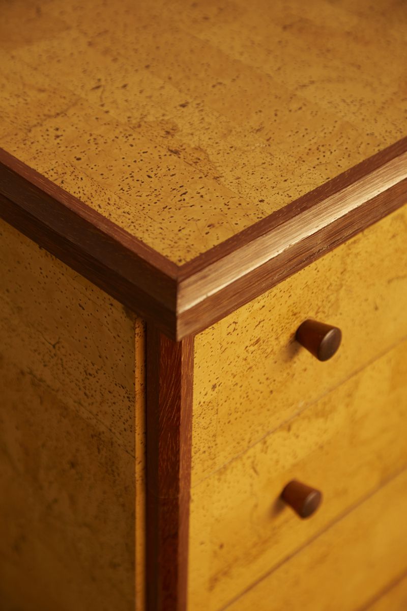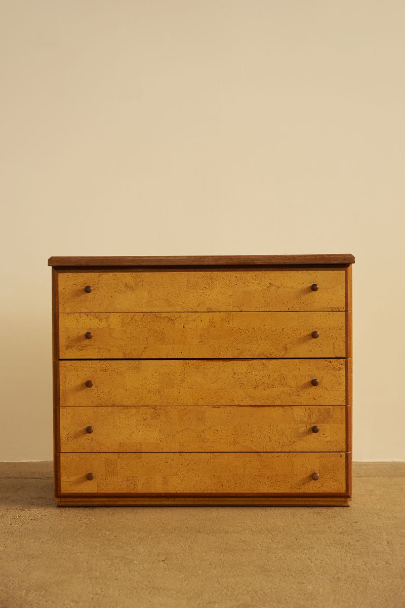 A unique Italian cork chest of drawers from the 1970s. Crafted with a cork exterior and a sturdy wooden structure, it features simple yet stylish wooden knobs. A distinctive and effortlessly cool statement piece.