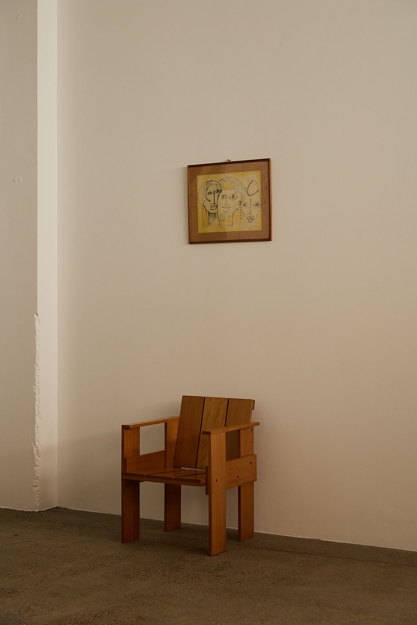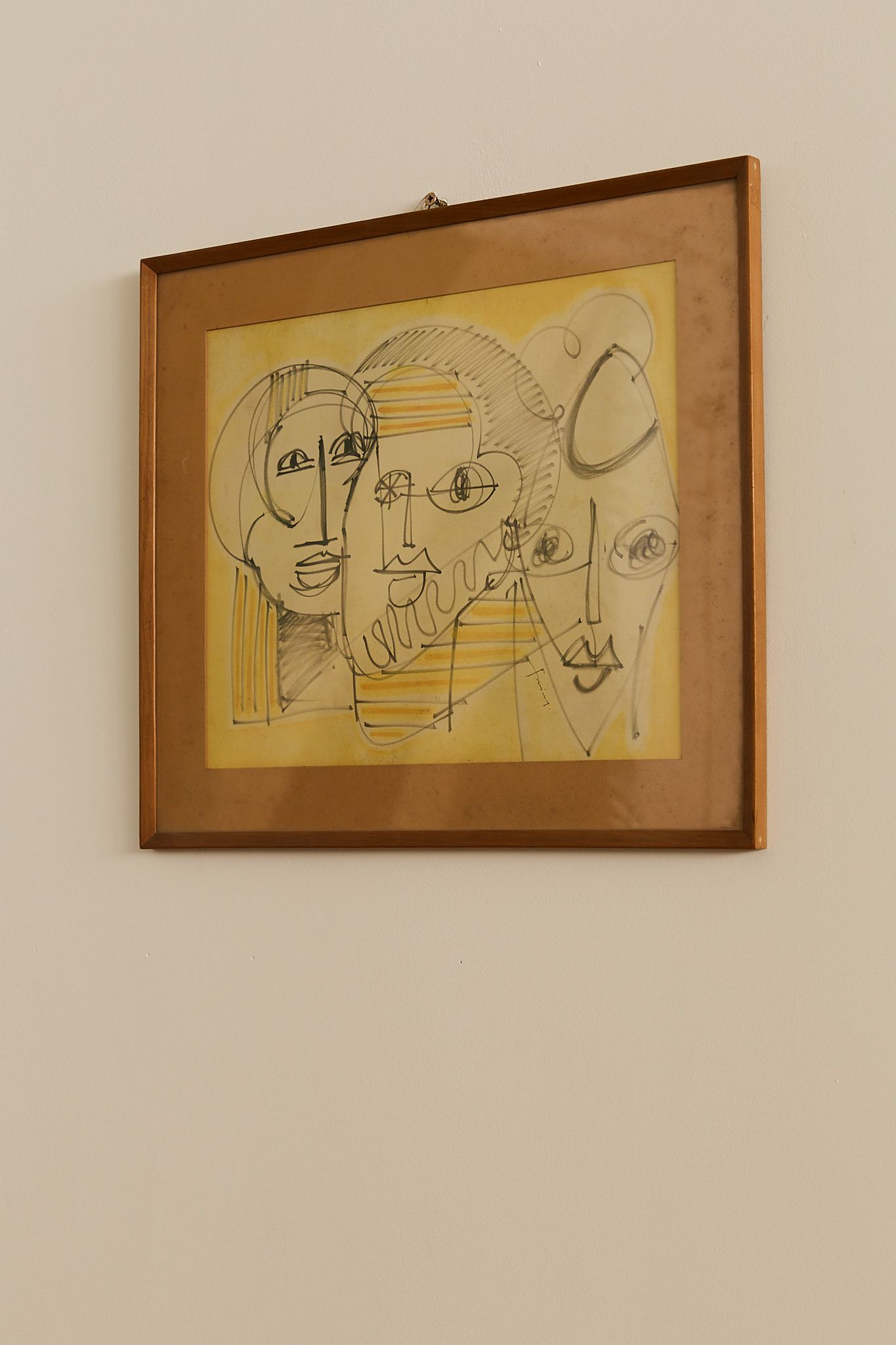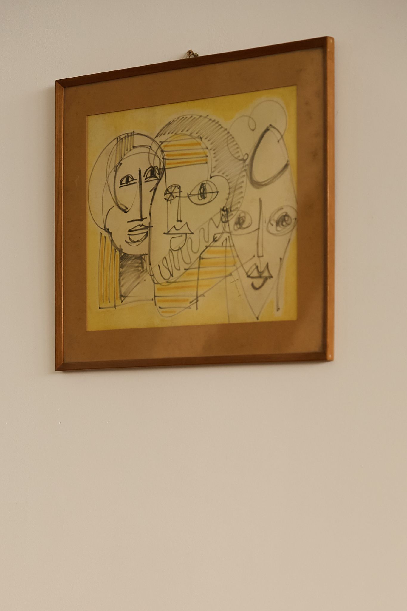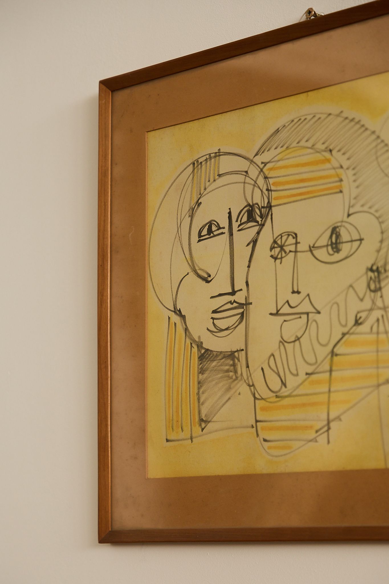 Expressive mixed media drawing on paper, featuring three abstracted faces rendered in a linear, Cubist-inspired style. The artist uses a combination of graphite and warm-toned accents in yellow and orange to emphasize form and rhythm, evoking a sense of connection between the figures. Framed under glass with the original minimalist wooden frame.
