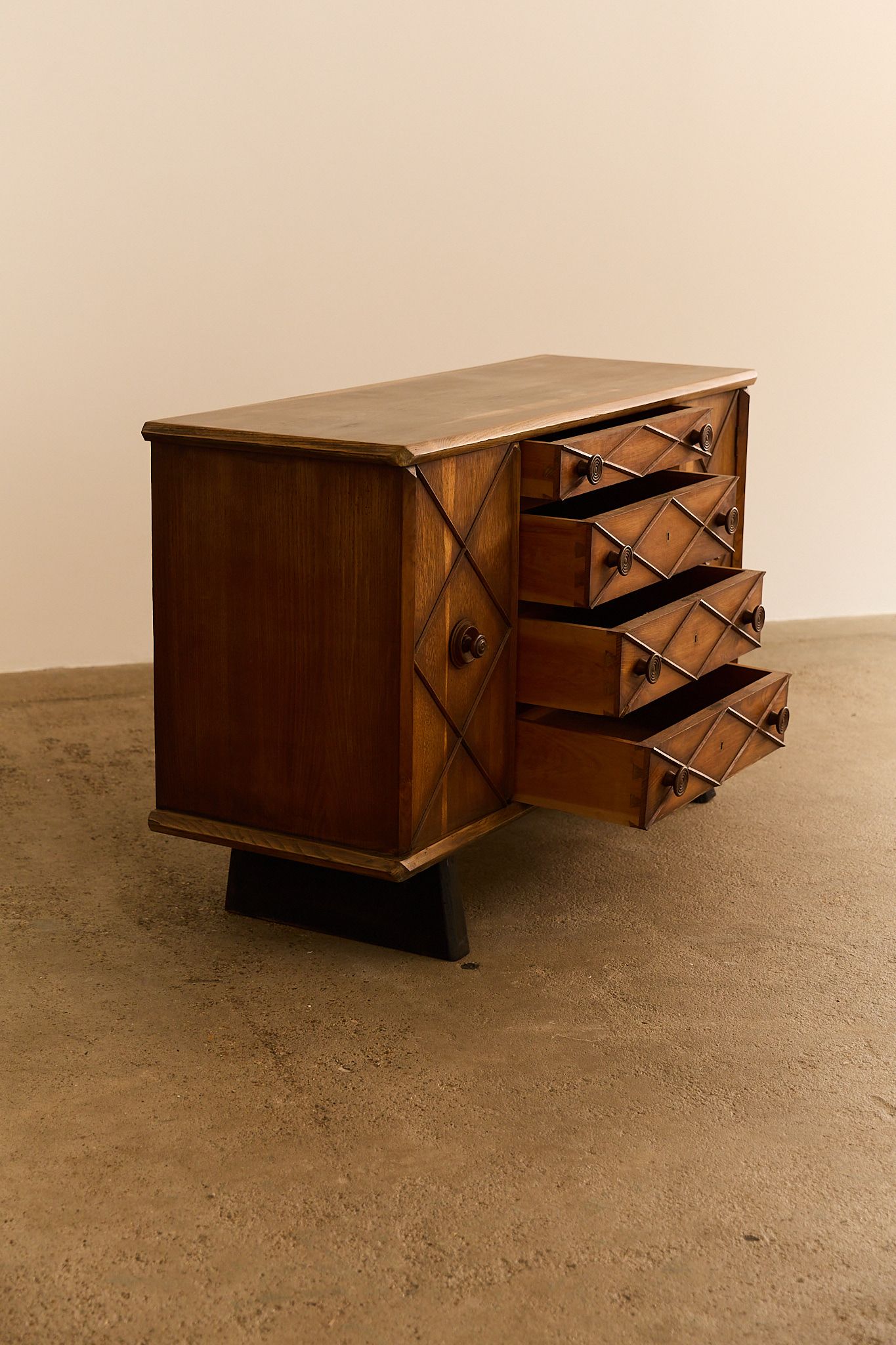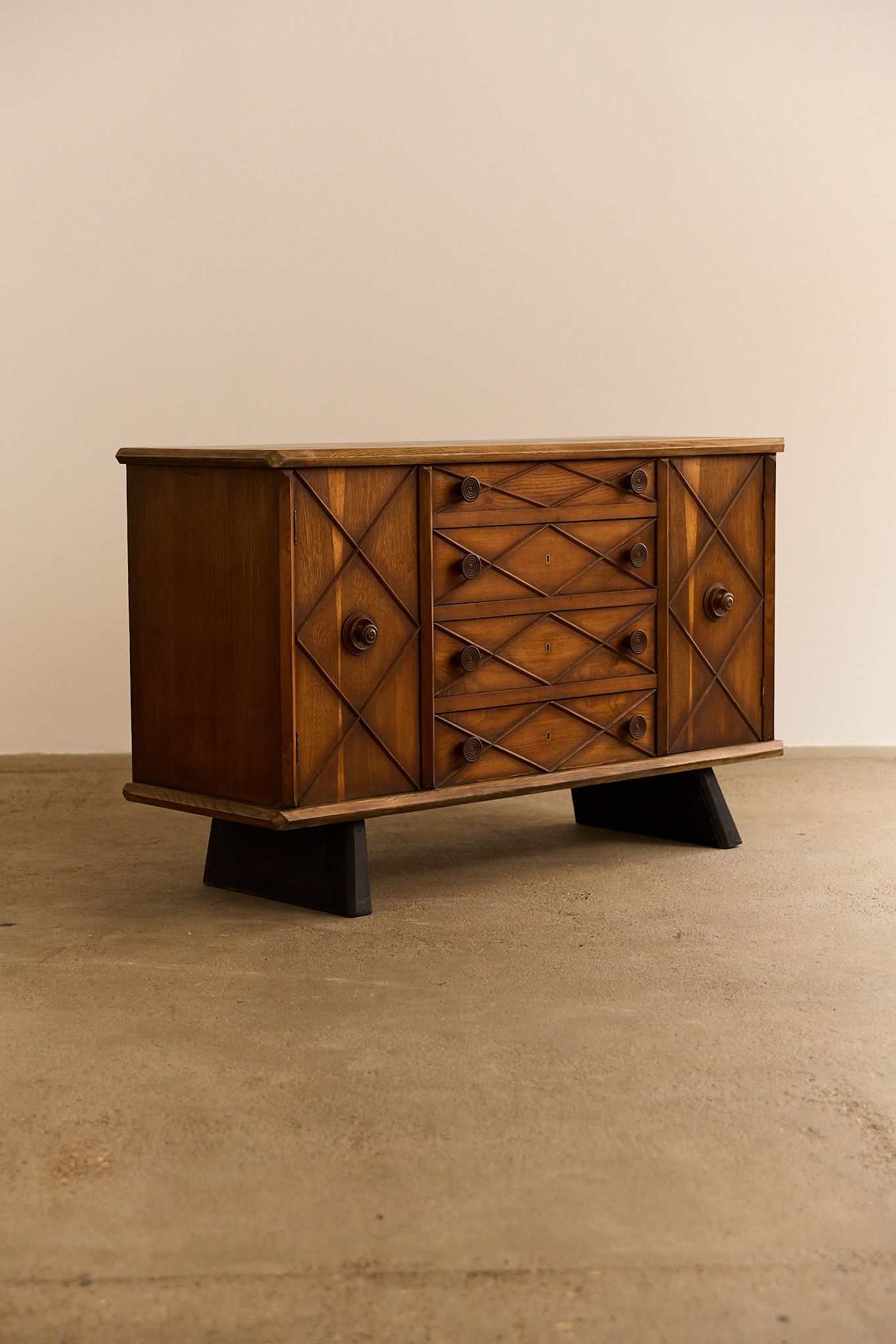 Elegant dresser / schest of drawers crafted from with ebonized wood accents and buxus details. This refined piece reflects the sophisticated Italian craftsmanship of the 1940s, combining clean lines with subtle decorative contrast. Gianni Vigorelli (1916–1998) was an Italian sculptor and furniture designer known for his elegant, sculptural pieces that embody the essence of Italian design of the 40-50’s.