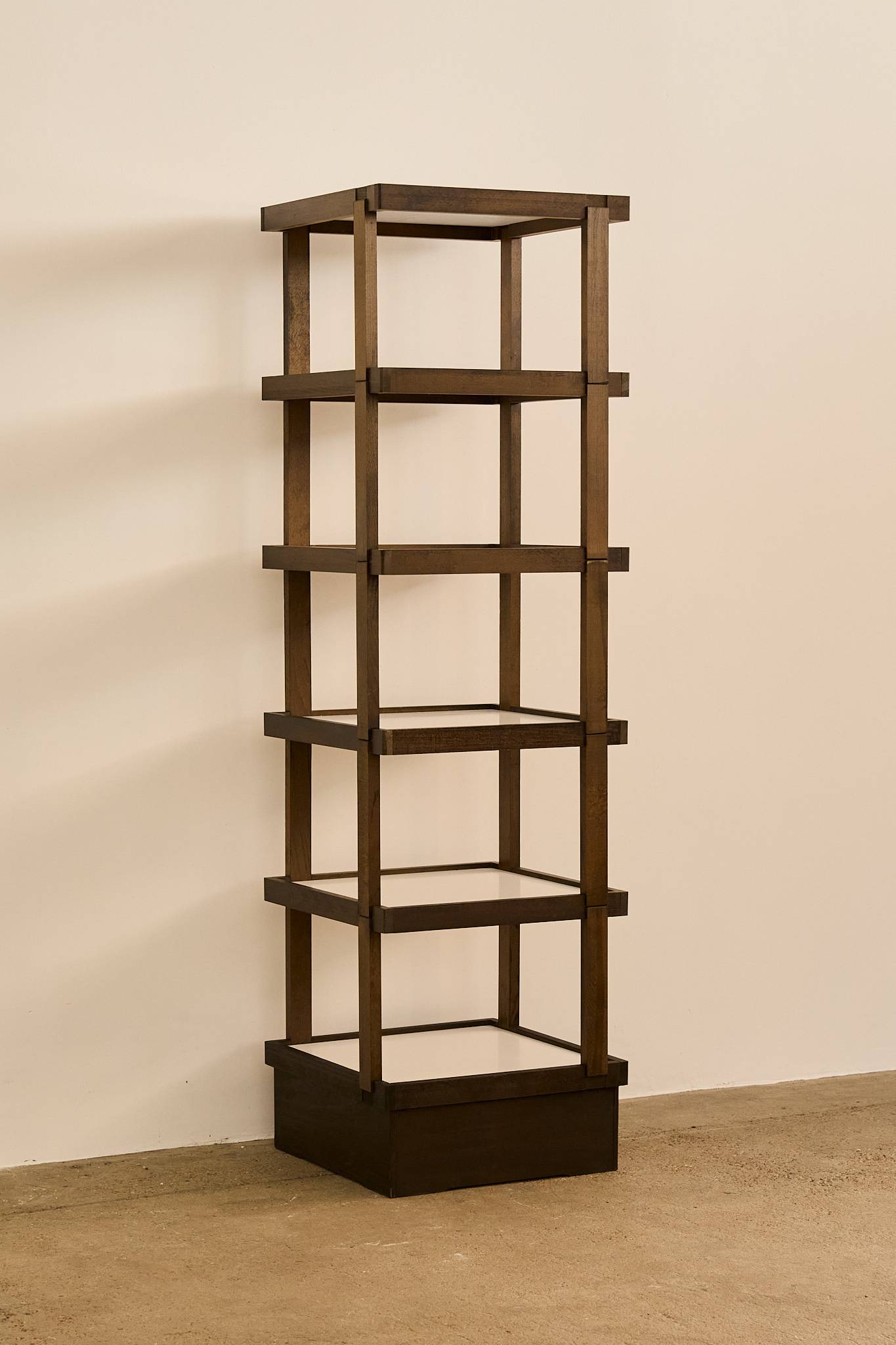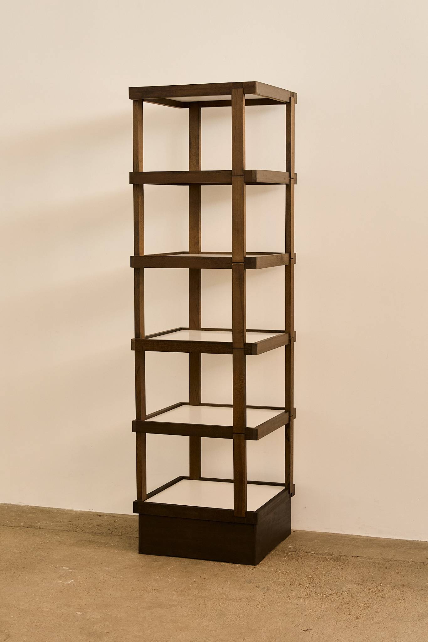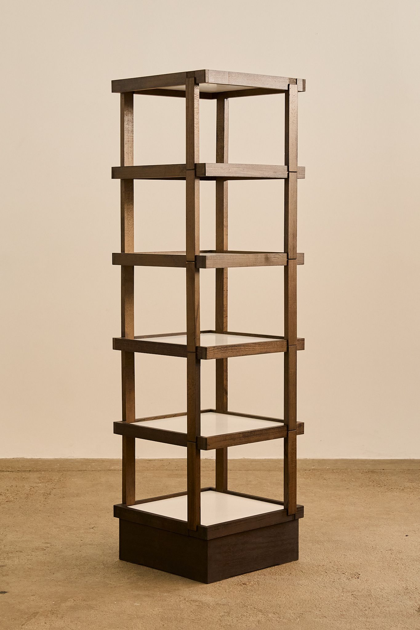 Decorative stacked shelf. Each level is ingeniously assembled using an interlocking system with clean joinery and no visible hardware. The open geometric frame rests on a solid plinth base, combining minimalist design with practical function.