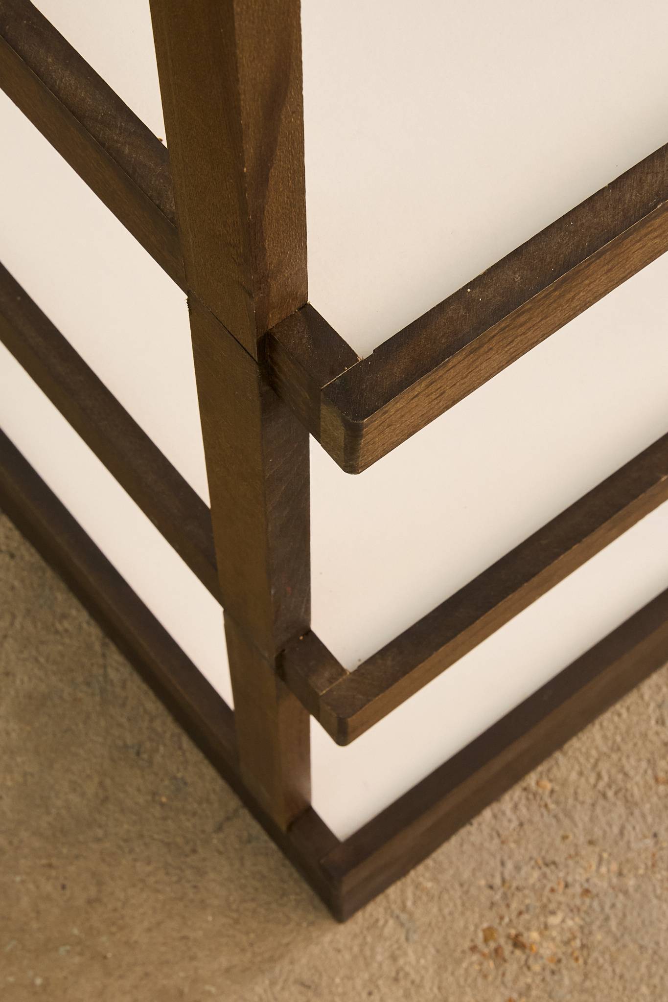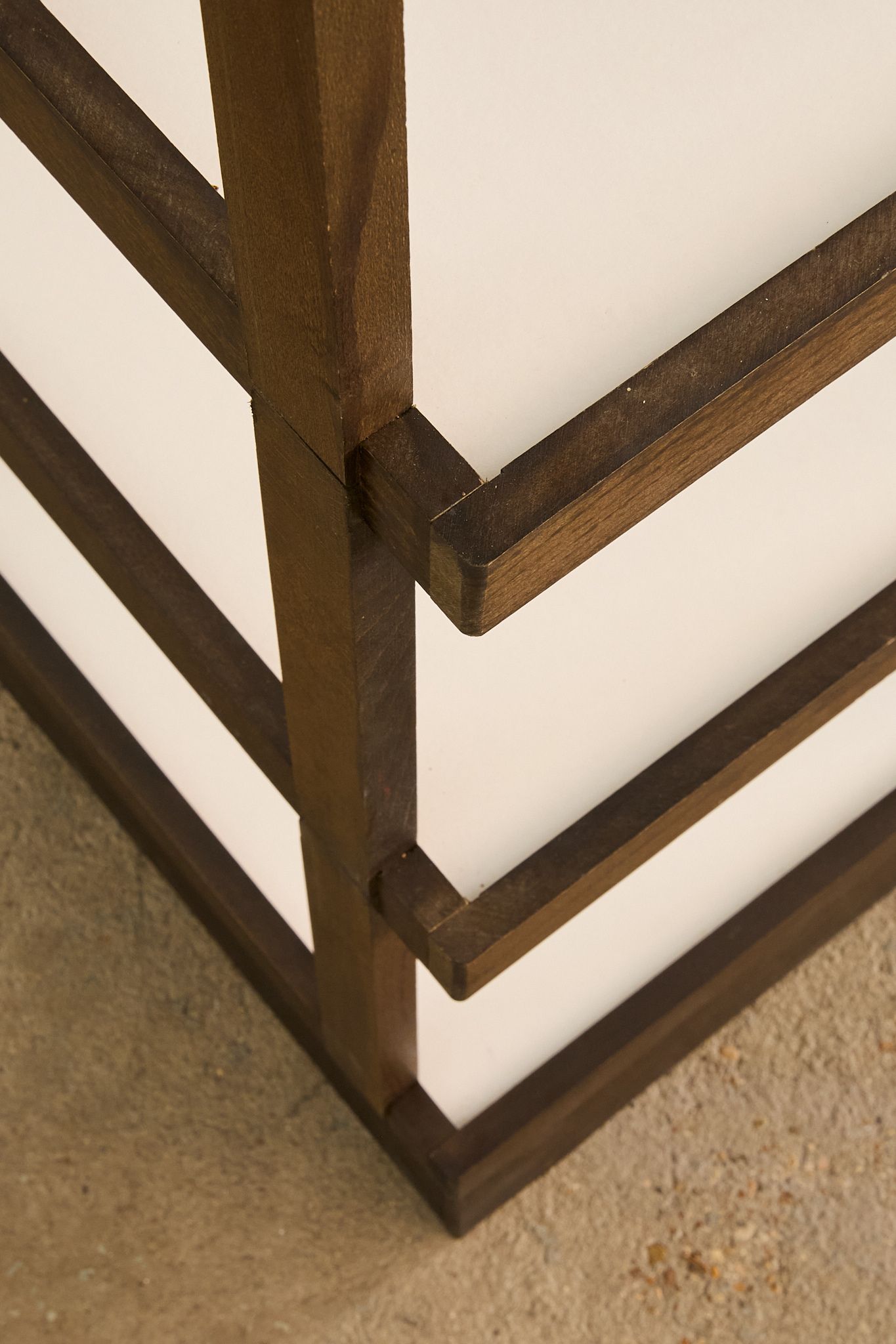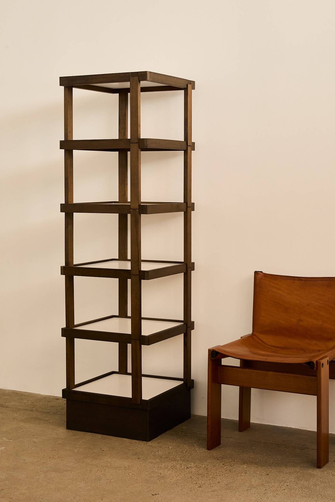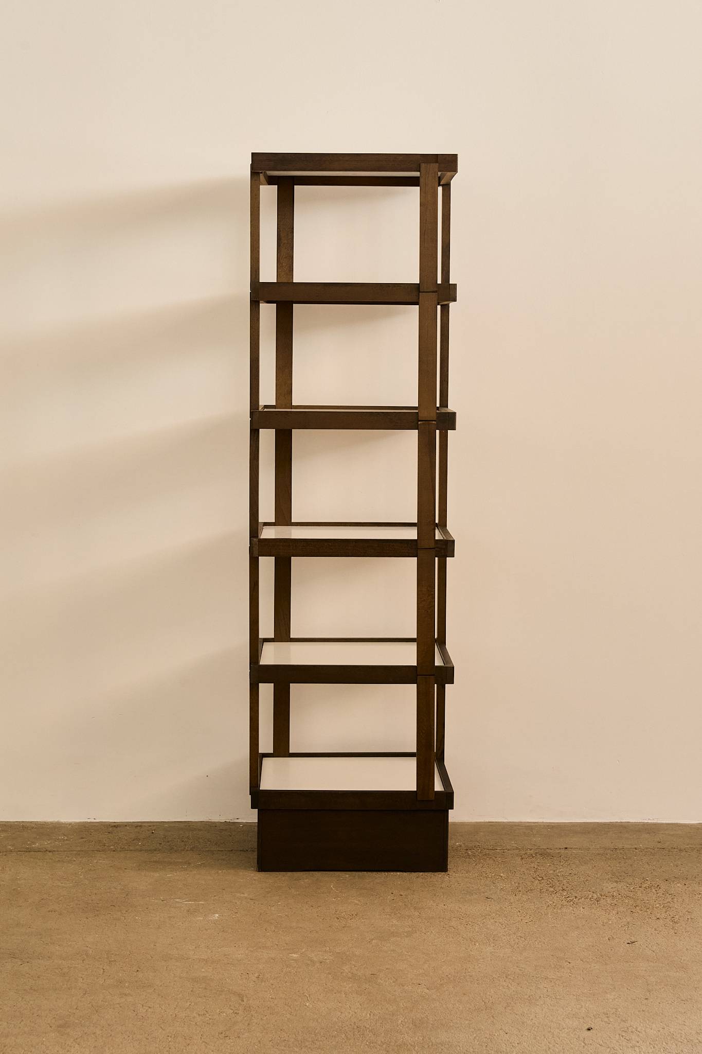 Decorative stacked shelf. Each level is ingeniously assembled using an interlocking system with clean joinery and no visible hardware. The open geometric frame rests on a solid plinth base, combining minimalist design with practical function.