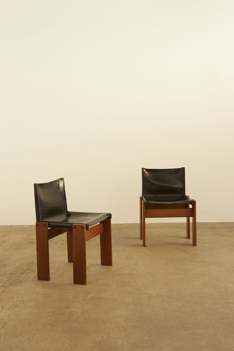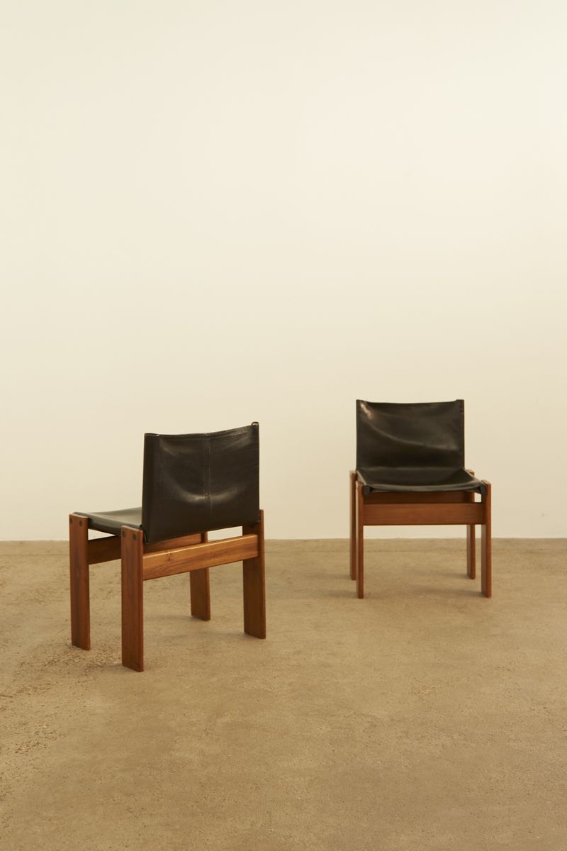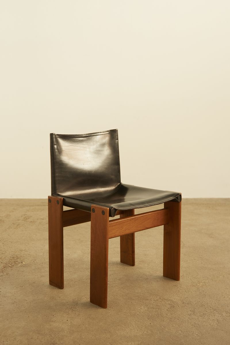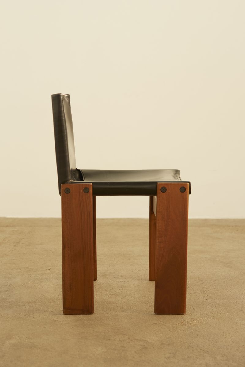 Afra & Tobia Scarpa for Molteni, set of four eight dining chairs, walnut and black leather, Italy, 1974. This set features a striking contrast between black leather and warm walnut. The cross-angled legs create a lightweight appearance while maintaining solid construction. Black nails on the legs add a refined detail. A timeless, high-quality design by the renowned Italian duo.