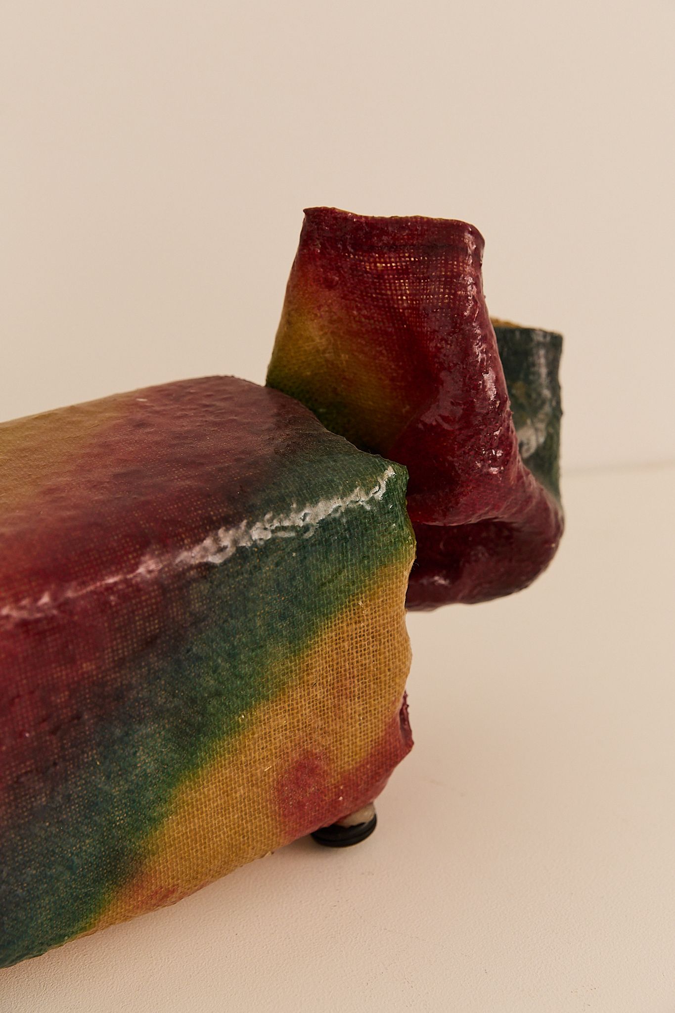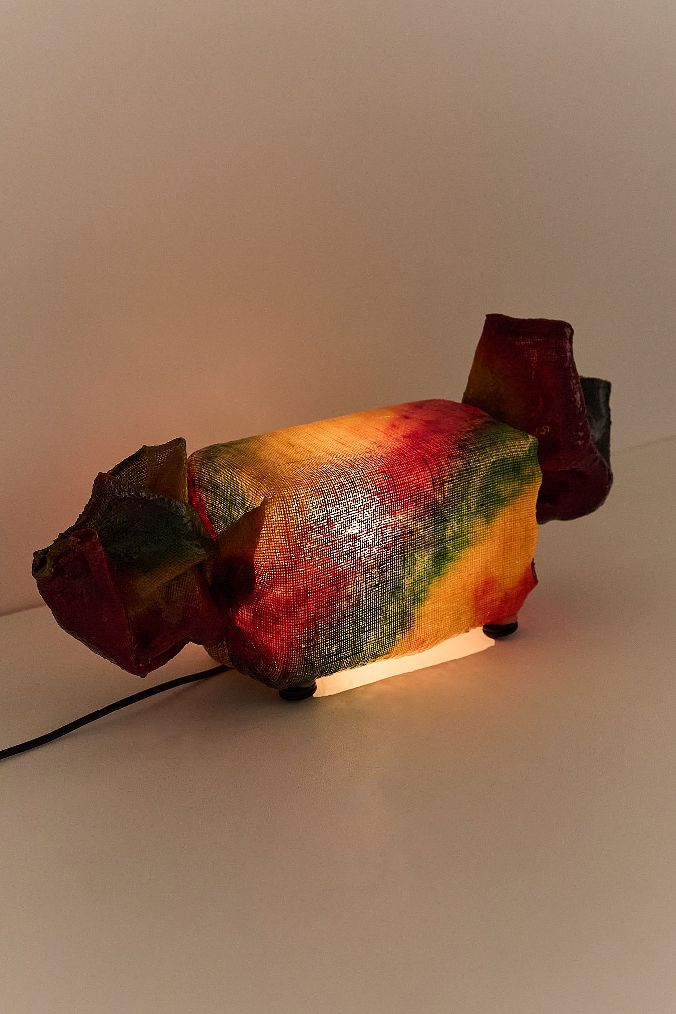 A rare and playful sculptural table lamp by French artist Lionel Scornec, designed circa 1975. Titled “Candy”, the piece takes the form of a wrapped sweet, crafted in richly colored, translucent resin and fiberglass.