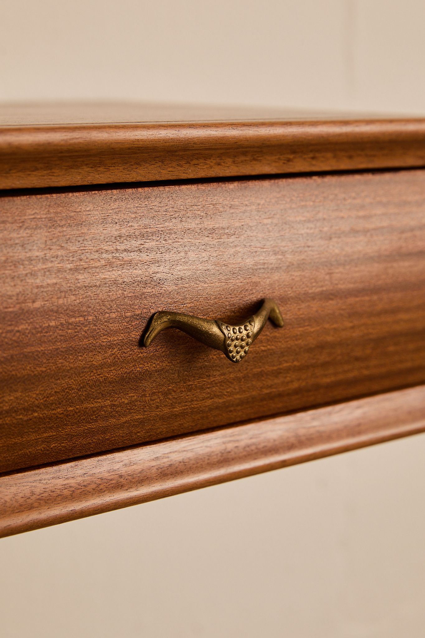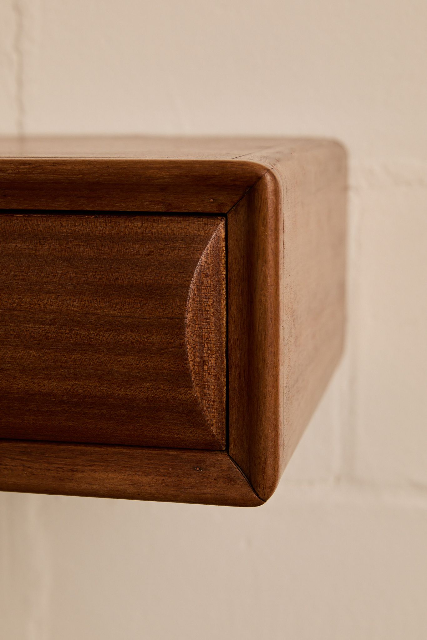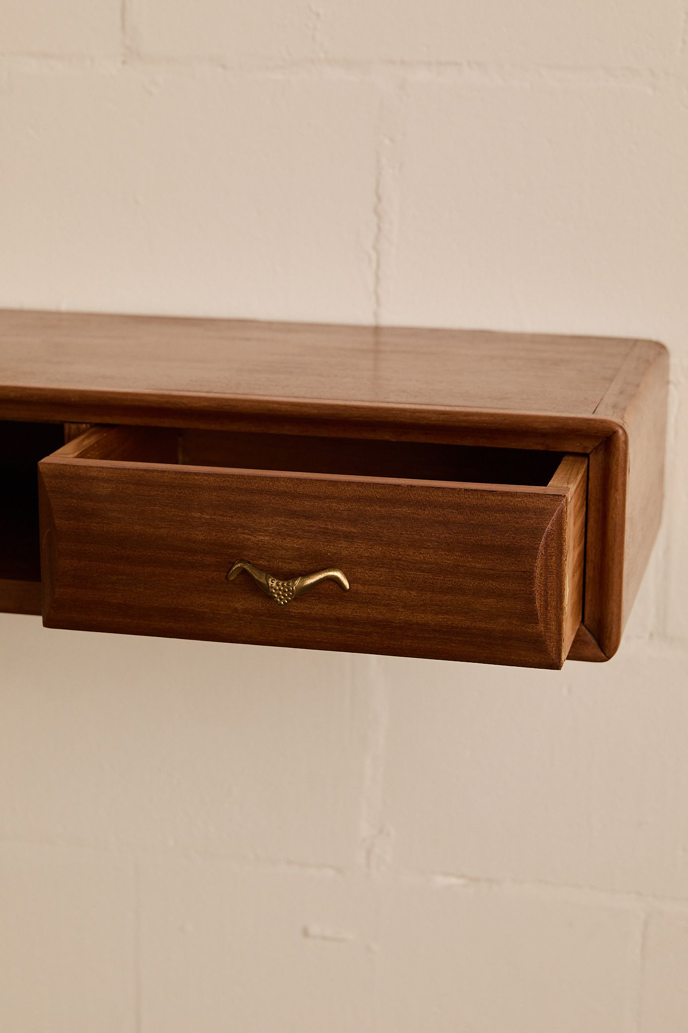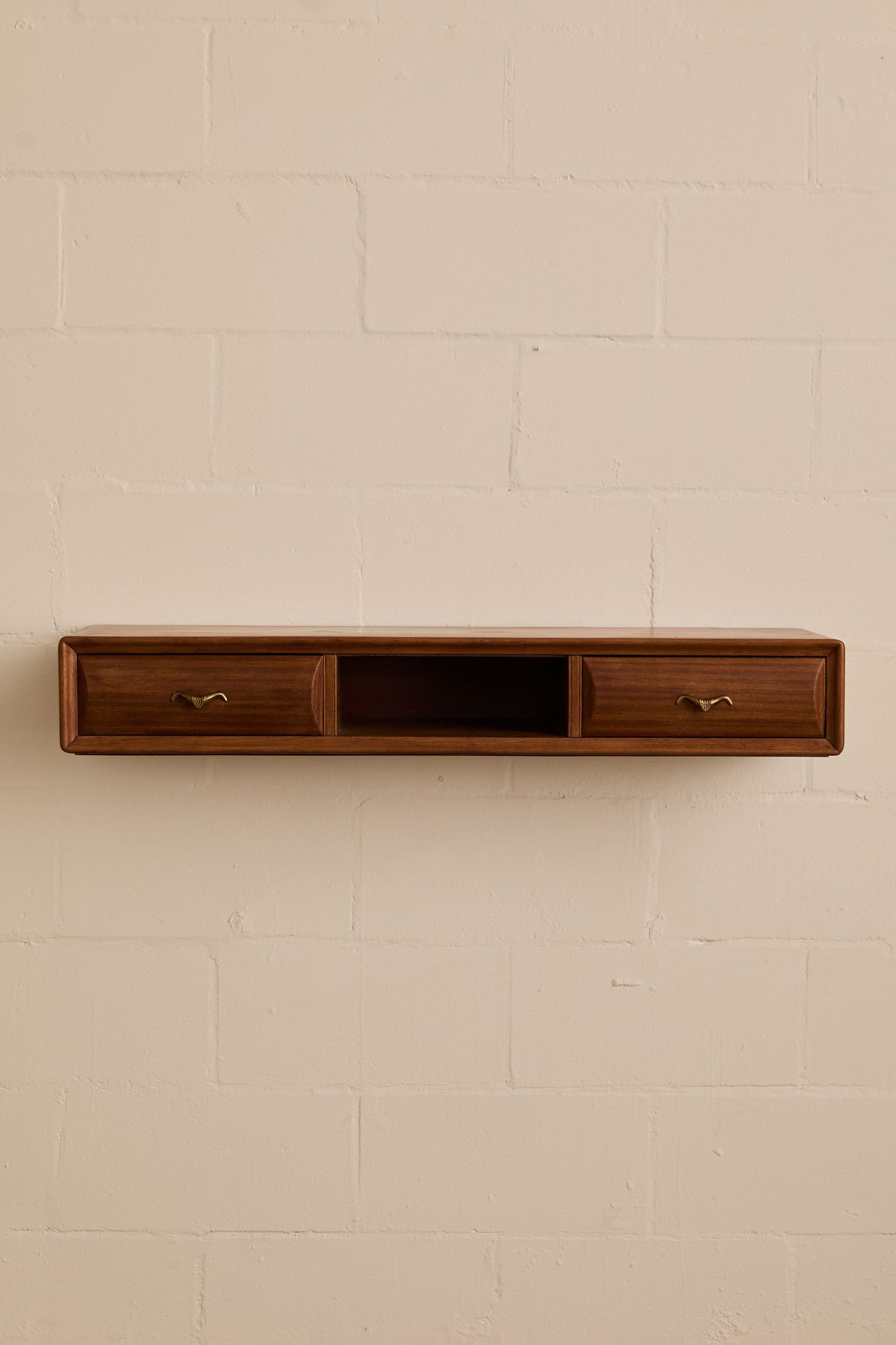 Sleek wall-mounted walnut shelf/console featuring a rounded-edge case and a single integrated drawer, finished with a distinctive brass pull.