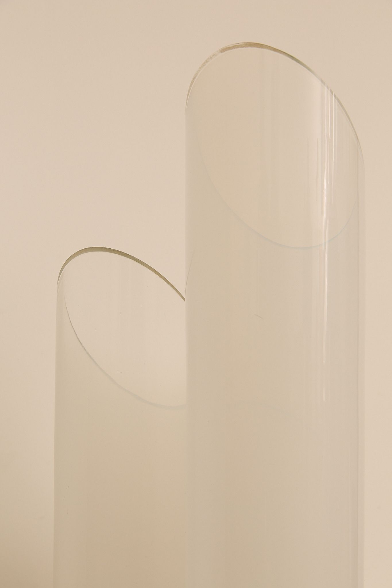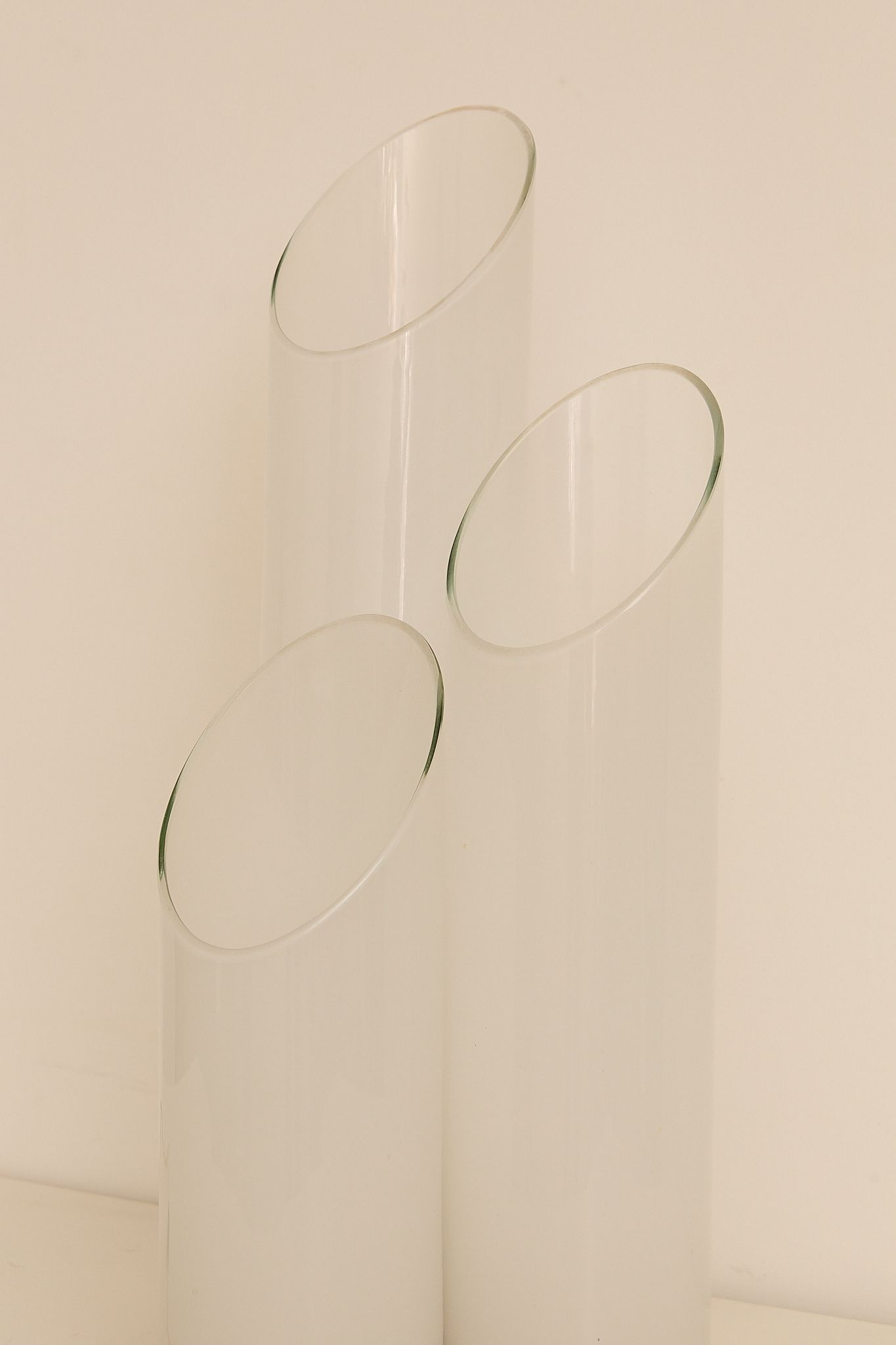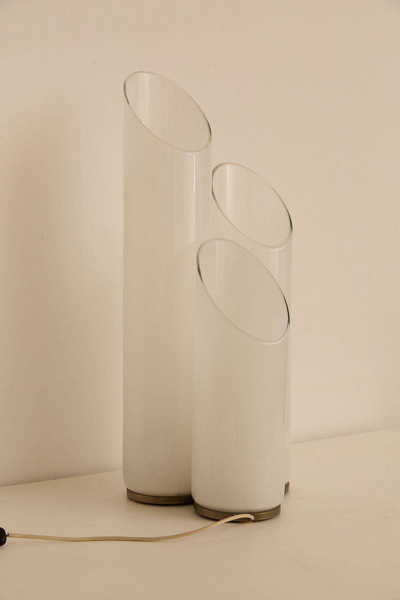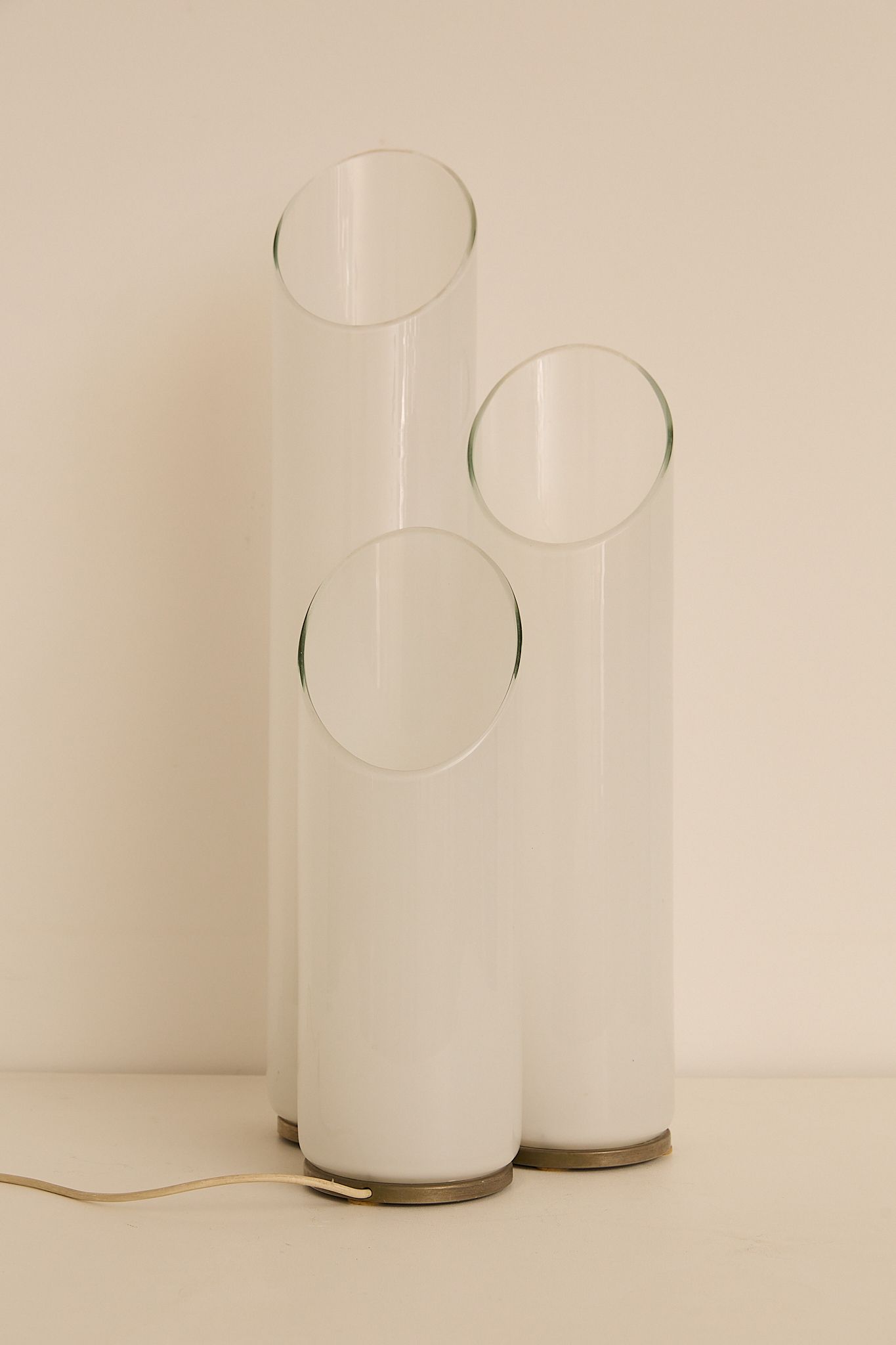 Sculptural table lamp attributed to Carlo Nason for Mazzega, Italy, 1970s. Composed of three overlapping glass cylinders with softly angled openings, the piece emits a warm, diffused glow when lit. A refined example of Nason’s mastery of form and light, balancing minimalism with organic elegance.