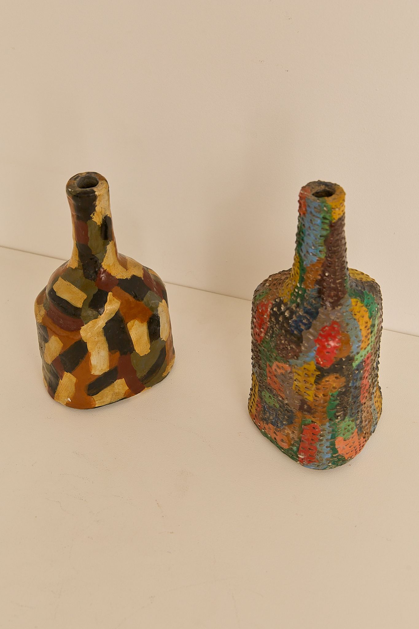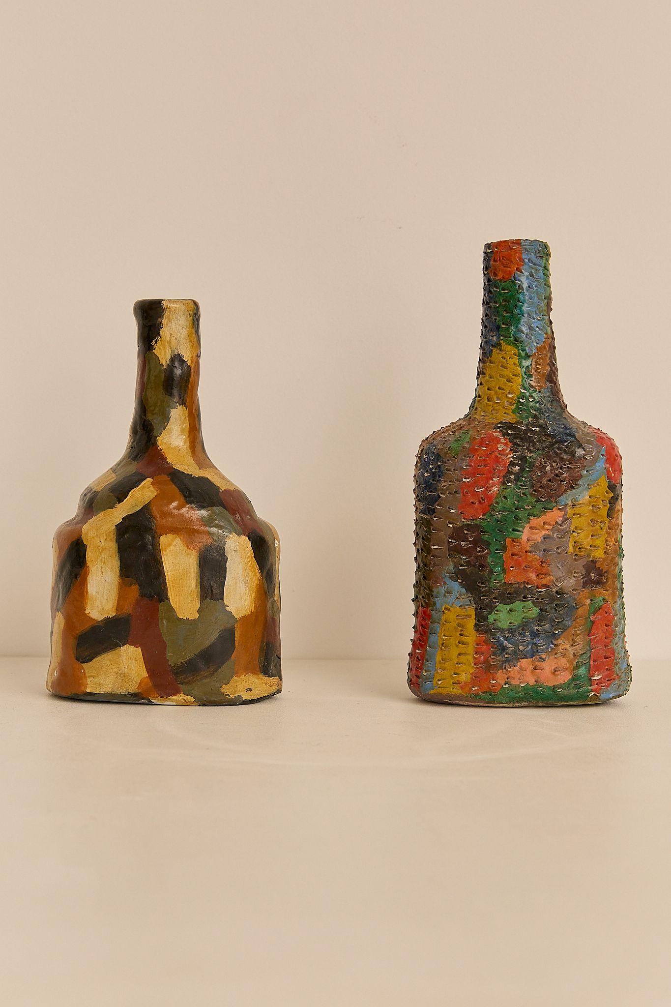 A pair of sculptural ceramic vessels, each uniquely hand-painted in layered earthy tones. Their organic forms and textured surfaces make them striking decorative pieces on their own or styled together. Price is for the pair.