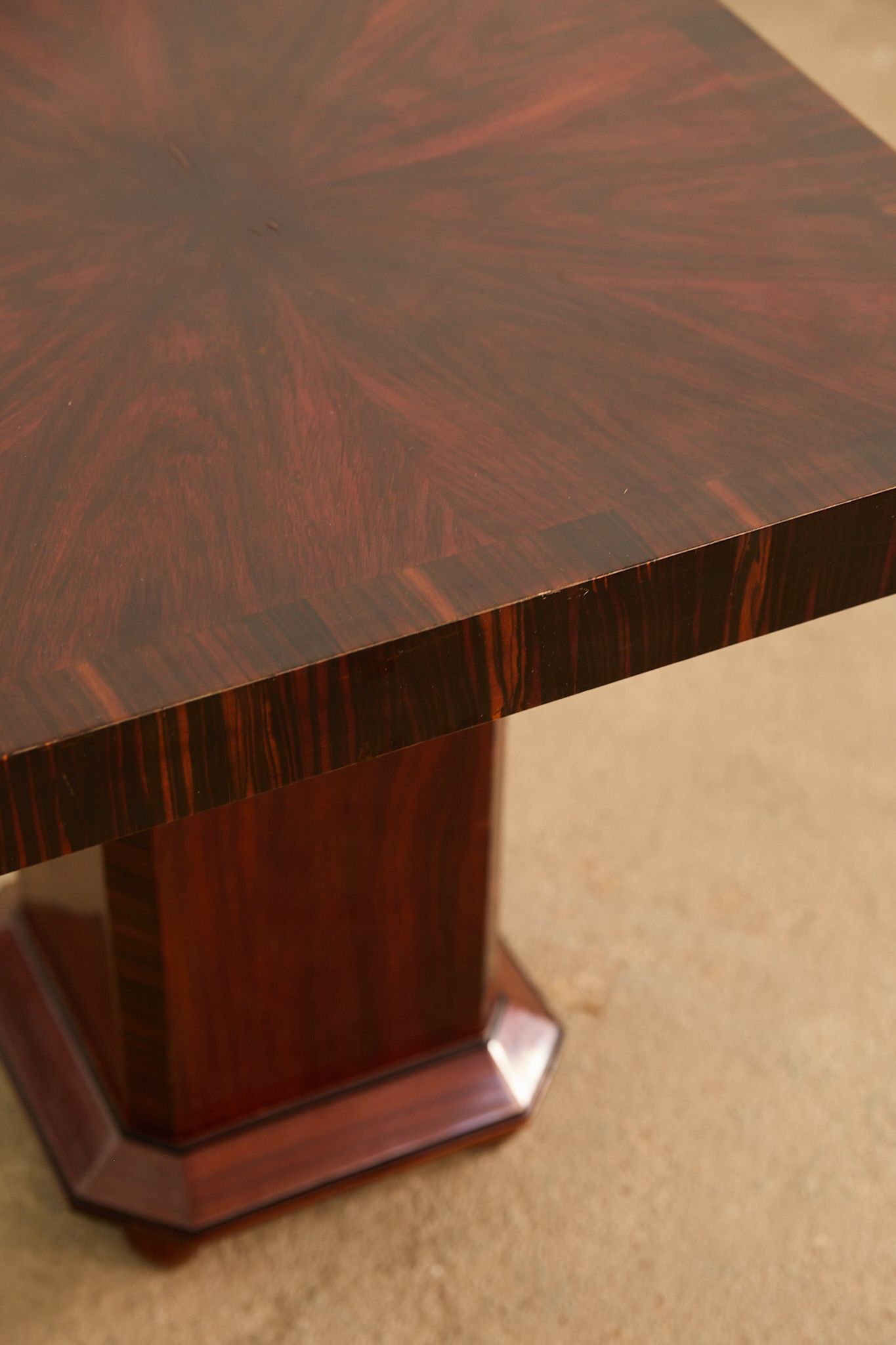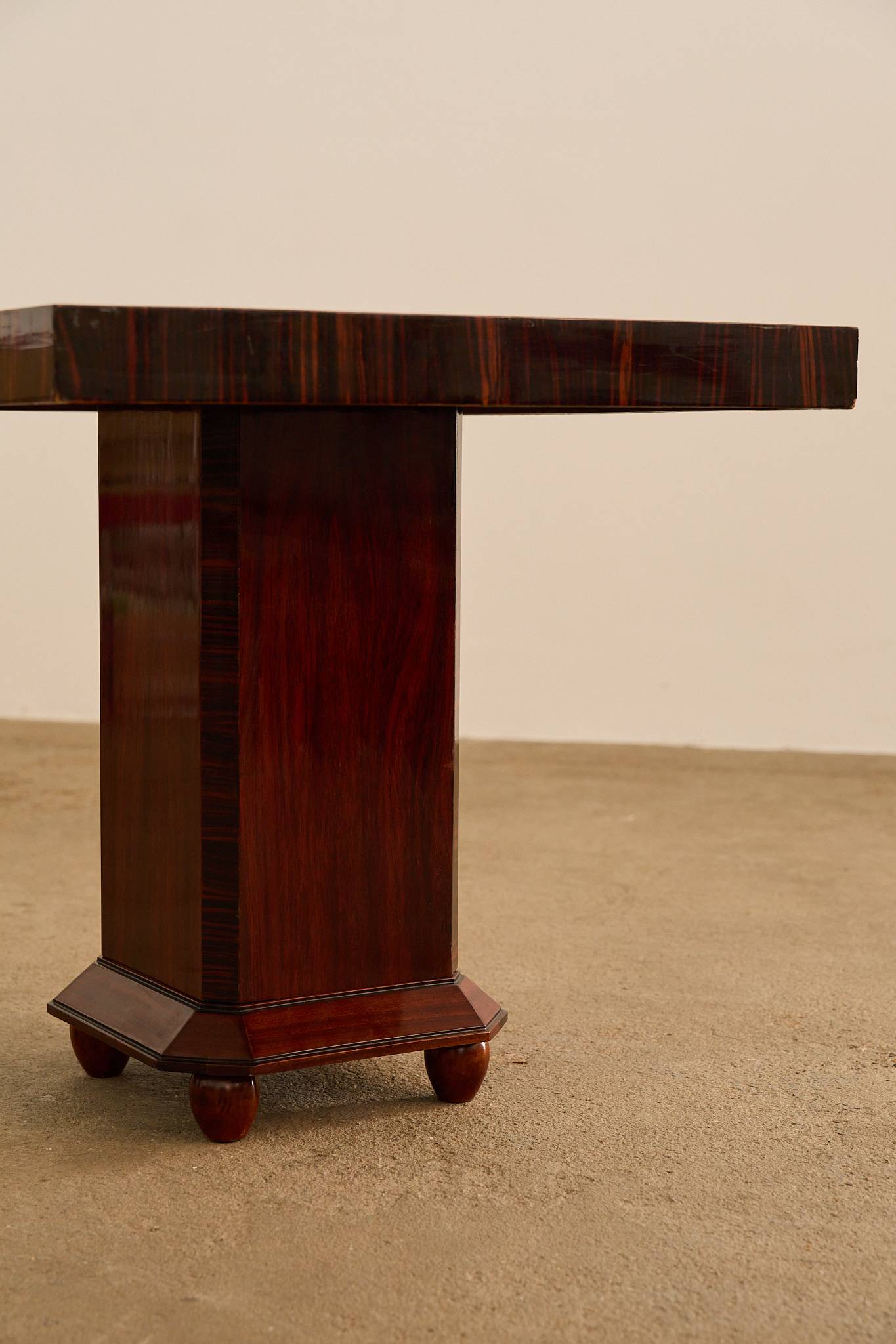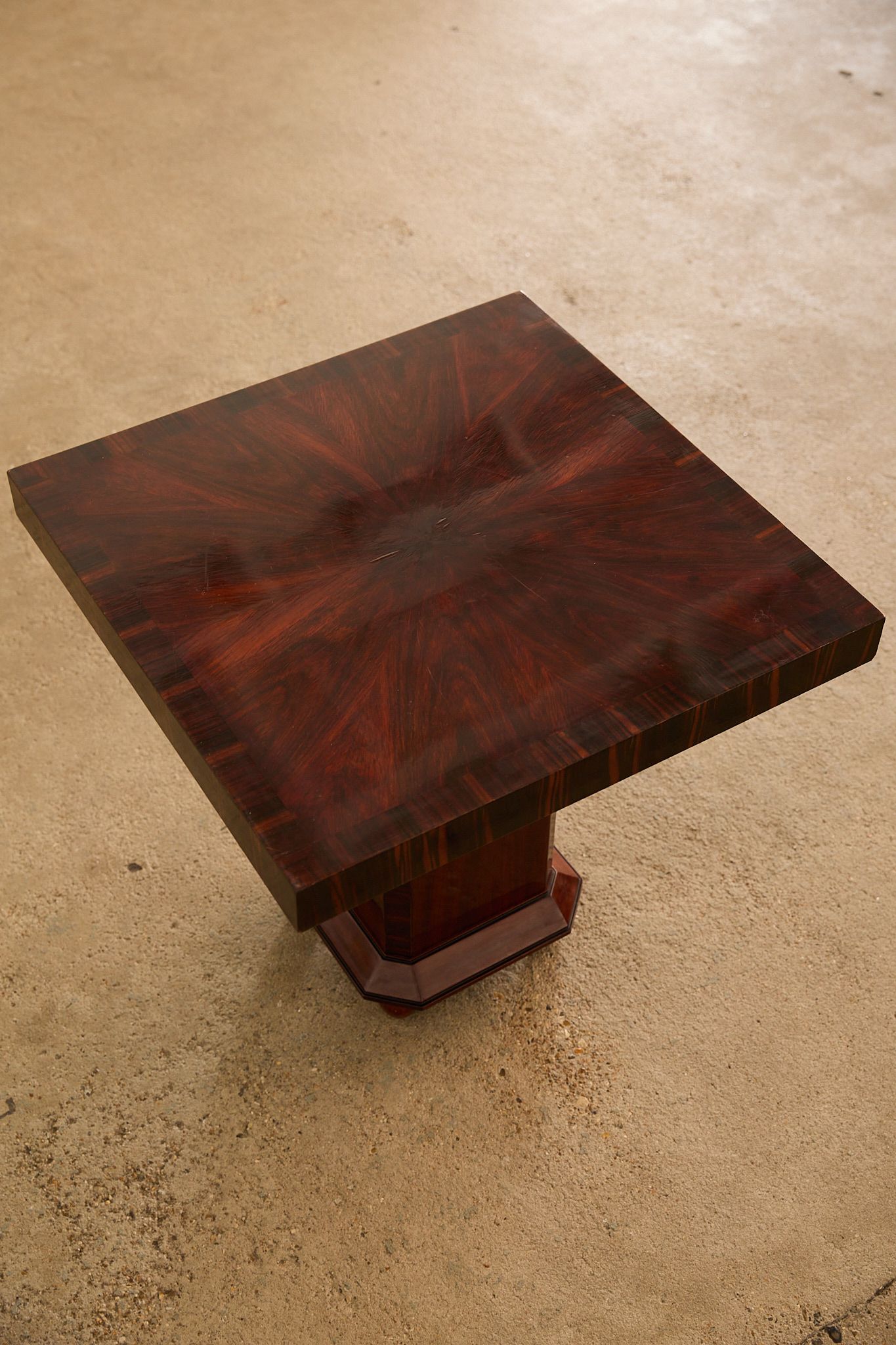 Square Art Deco side table in macassar ebony veneer, France, 1930s. The table features a bold geometric silhouette with a thick square top, set on a central pedestal base with an octagonal plinth and spherical feet. The rich macassar veneer is arranged in a striking radial pattern on the surface, highlighting the depth and movement of the wood grain.