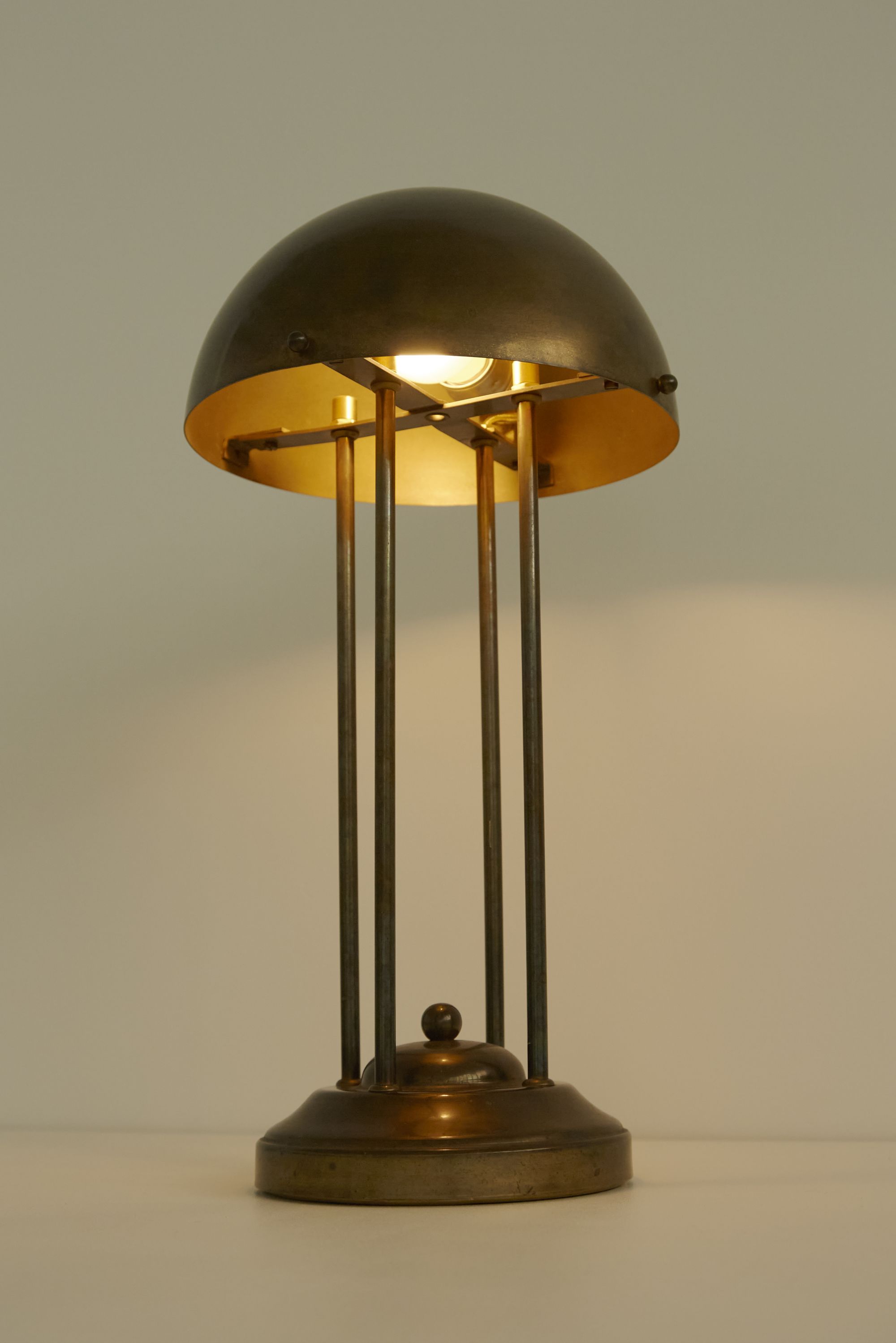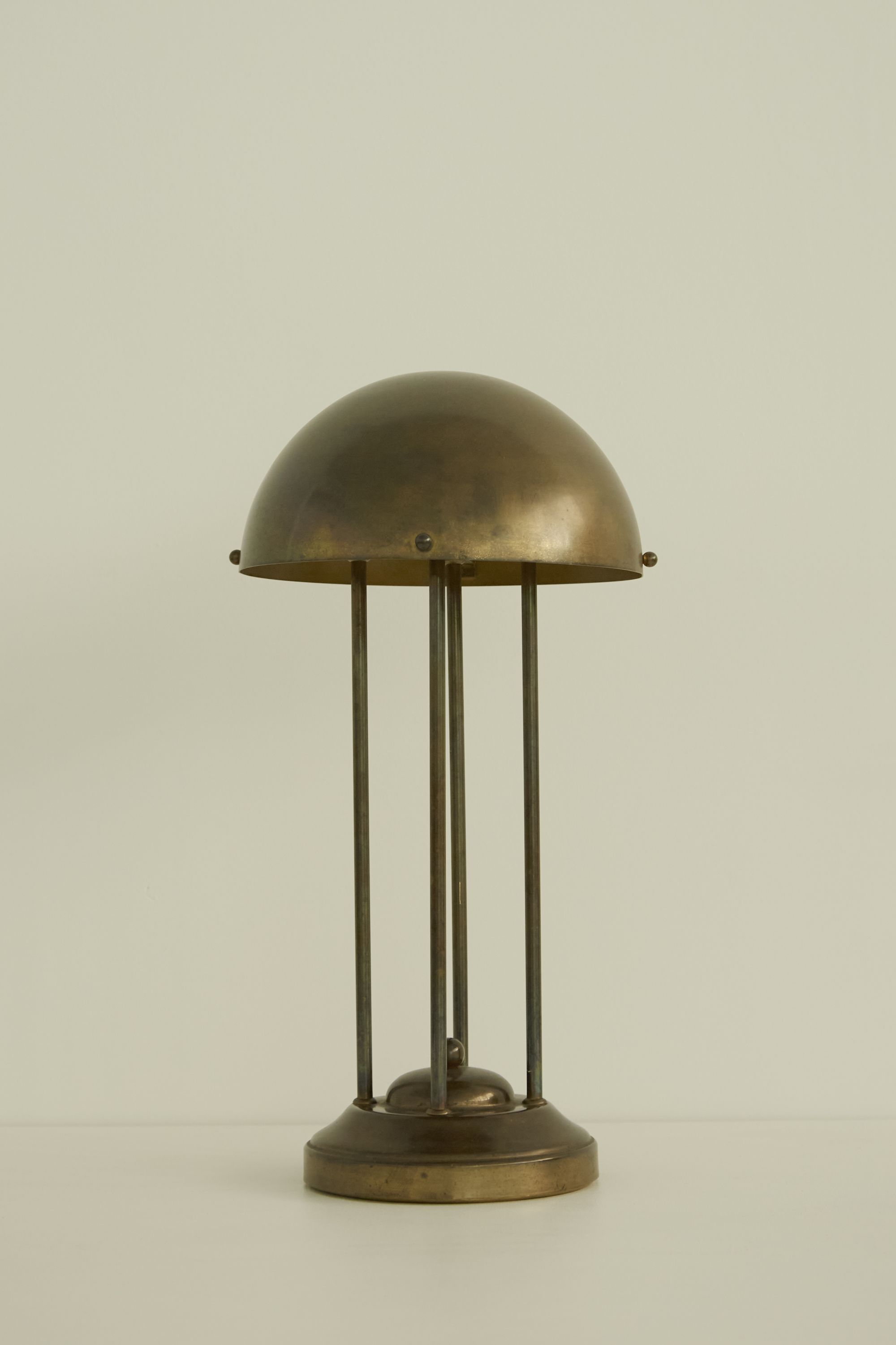 An elegant brass table lamp by Austrian designer Josef Hoffman. Its original design dates to 1900 but this piece is most likely a contemporary edition and later production circa 1960. The lamp features a wonderful patina throughout, its shade is supported by 4 brass tubes that connect to its circular foot. E27 bulb and original EU plug.
