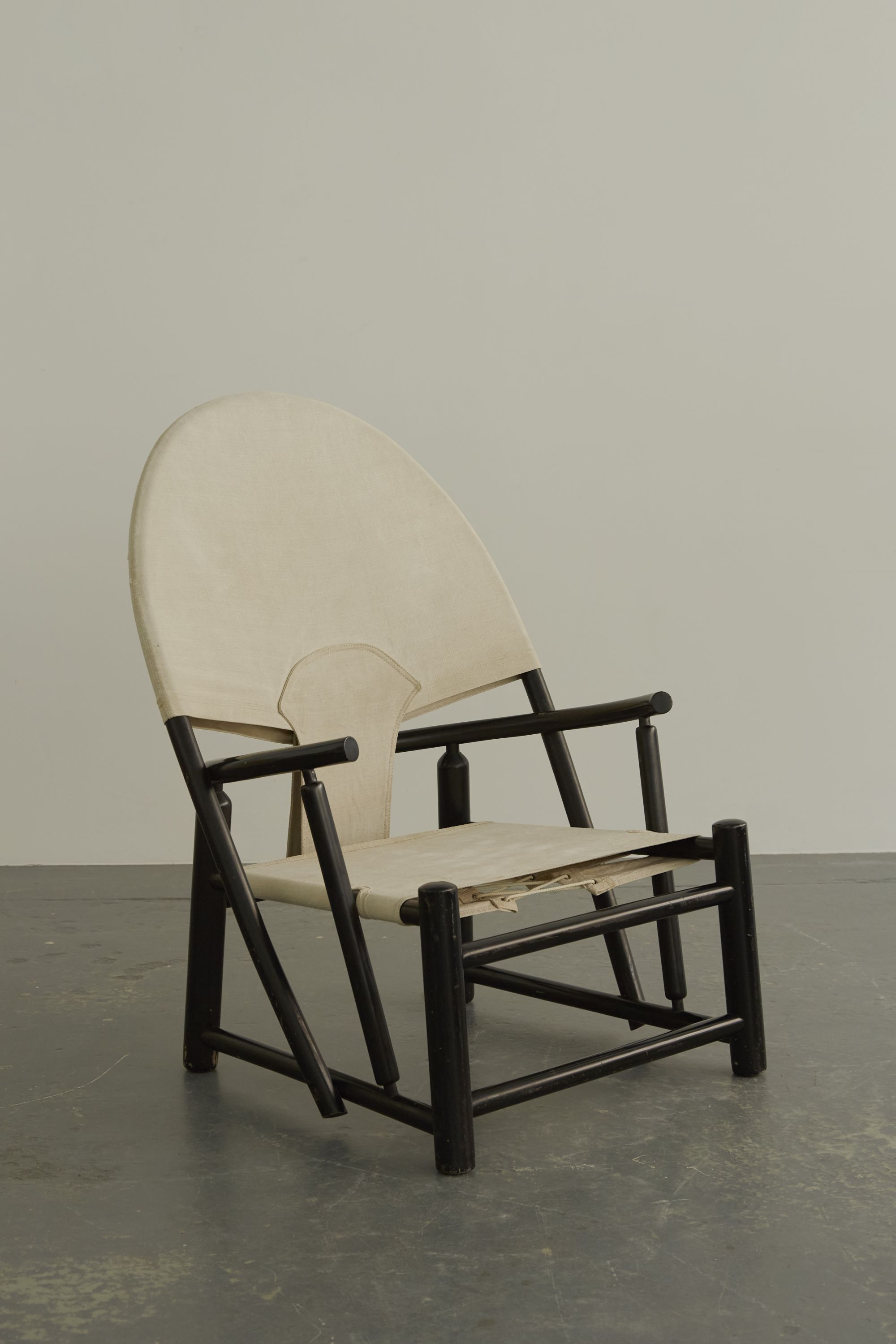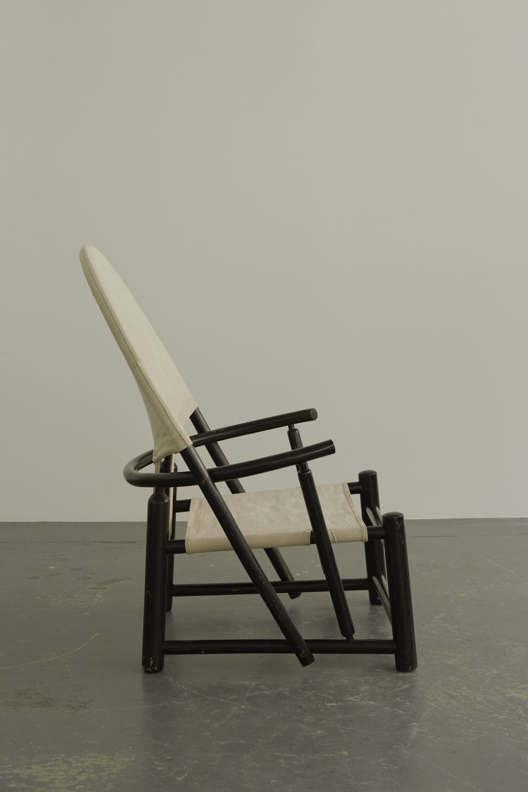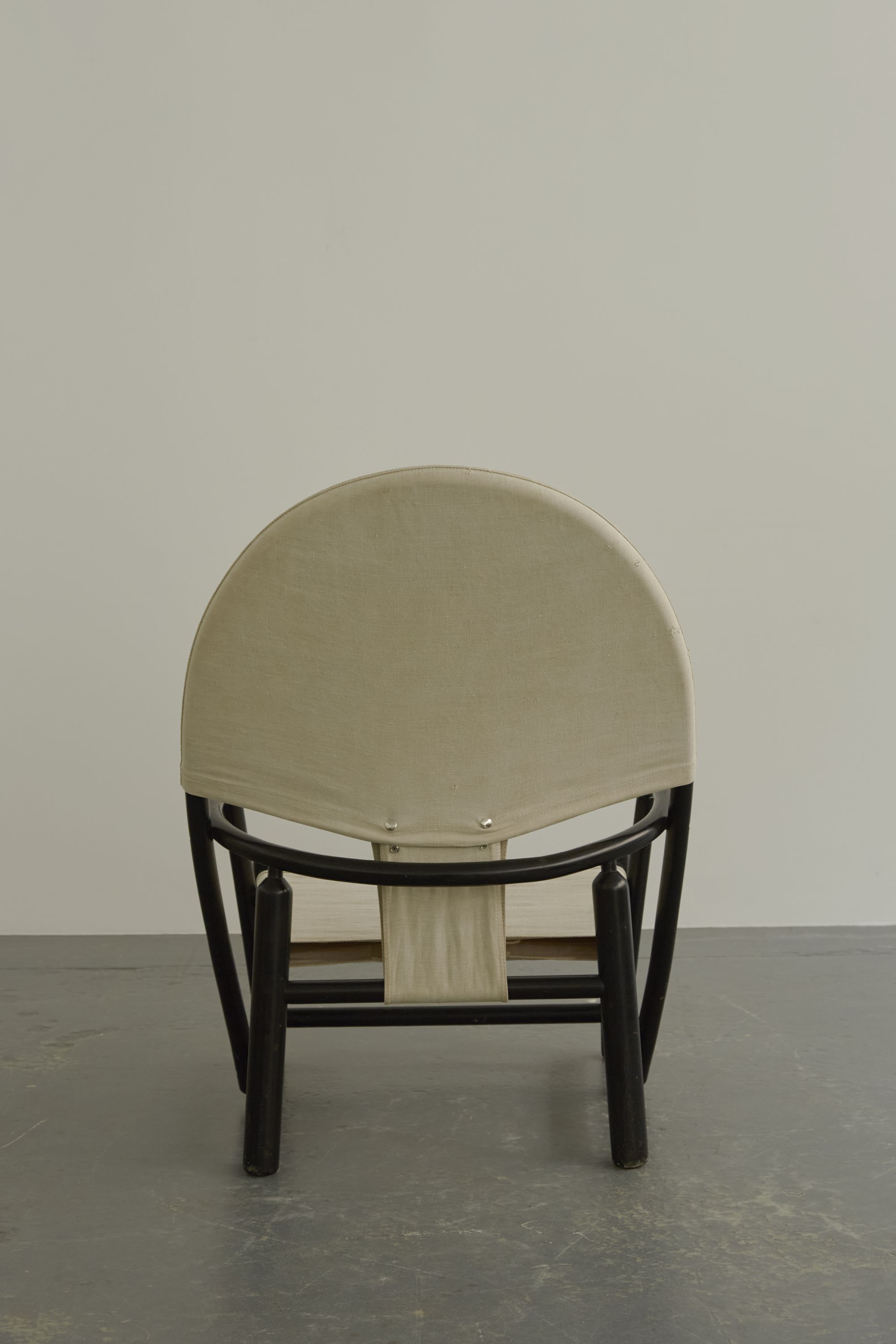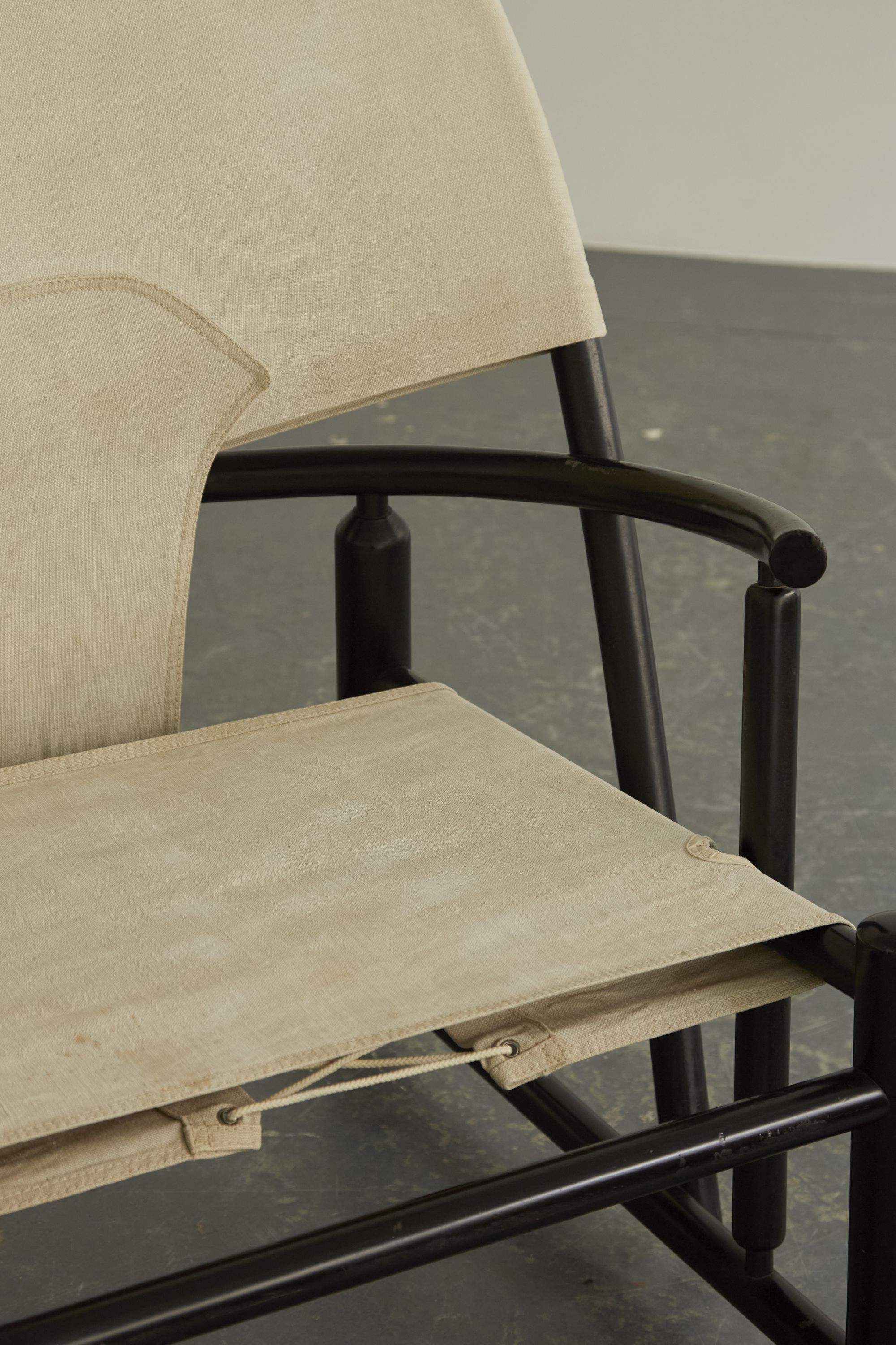This bentwood and canvas chair exudes lightness despite its dark wooden frame. The stretched fabric offers comfort and the wood a true stability. The piece was Produced by Germa, Italy in the 1970s. Its robust shape and design has meant the chair still seems extremely modern and practical today.