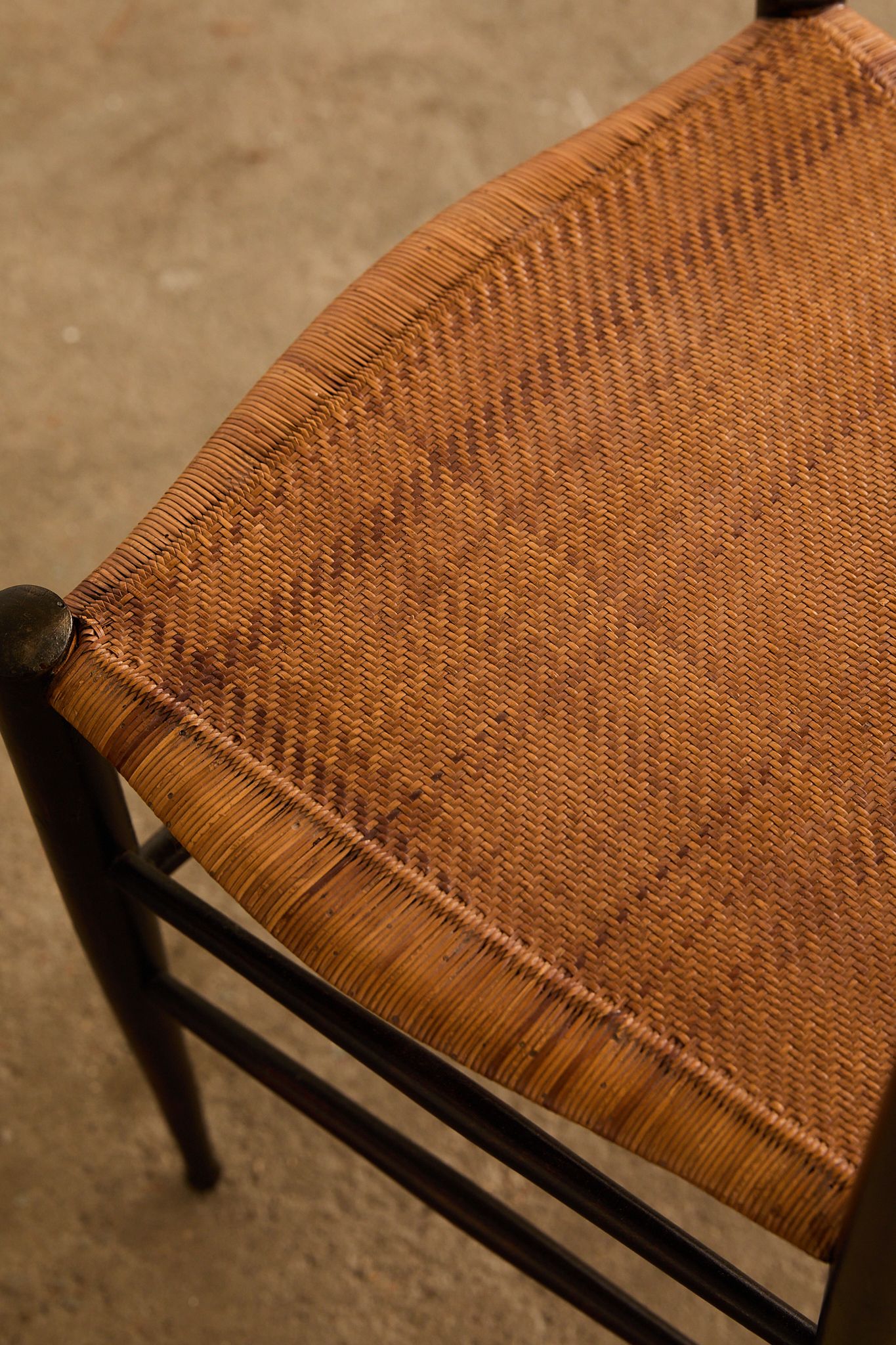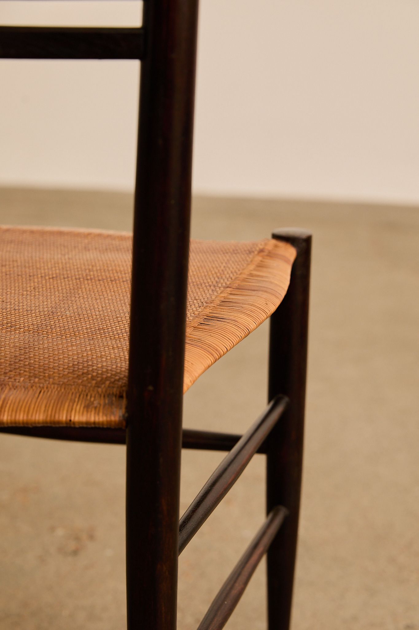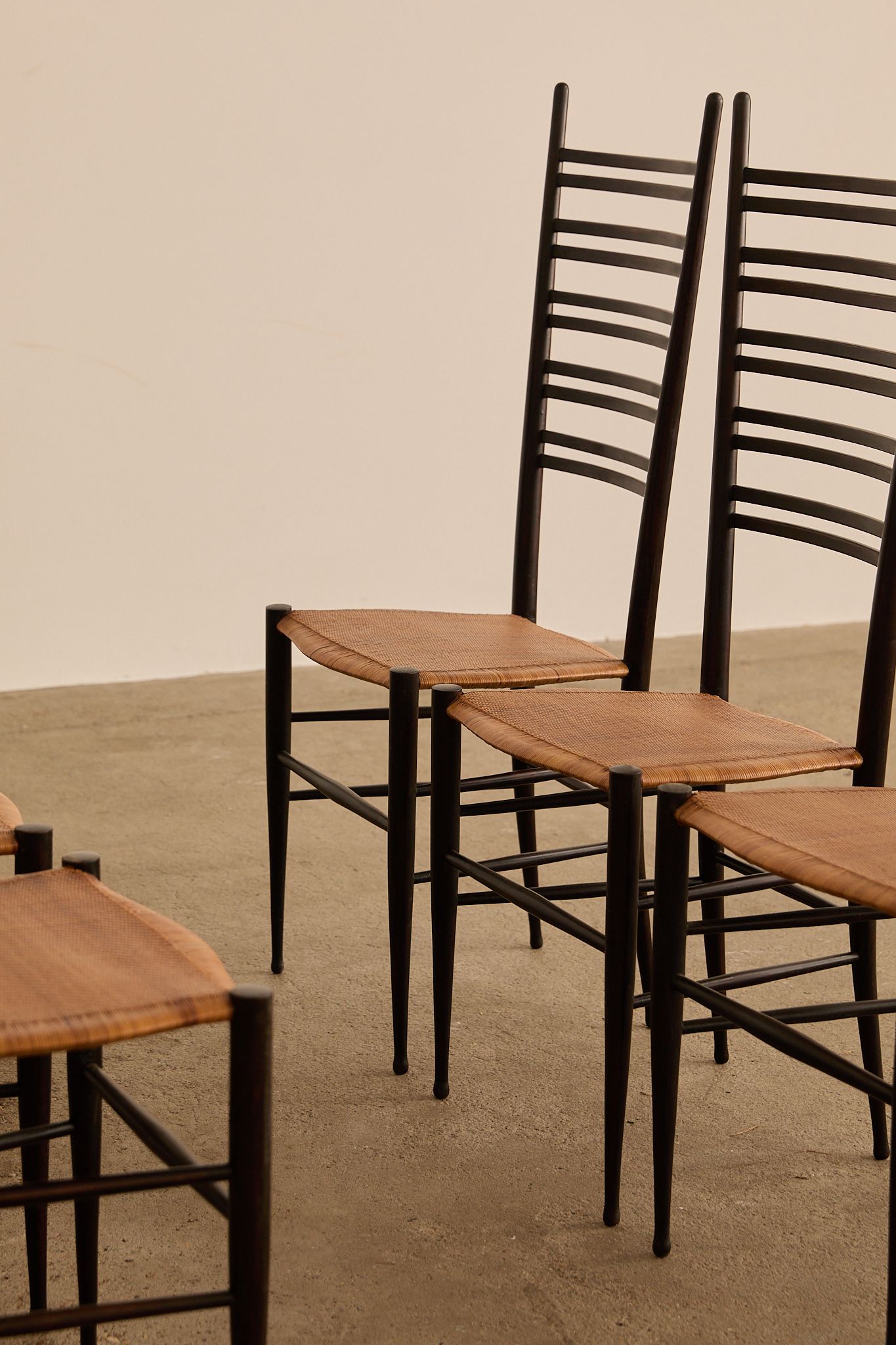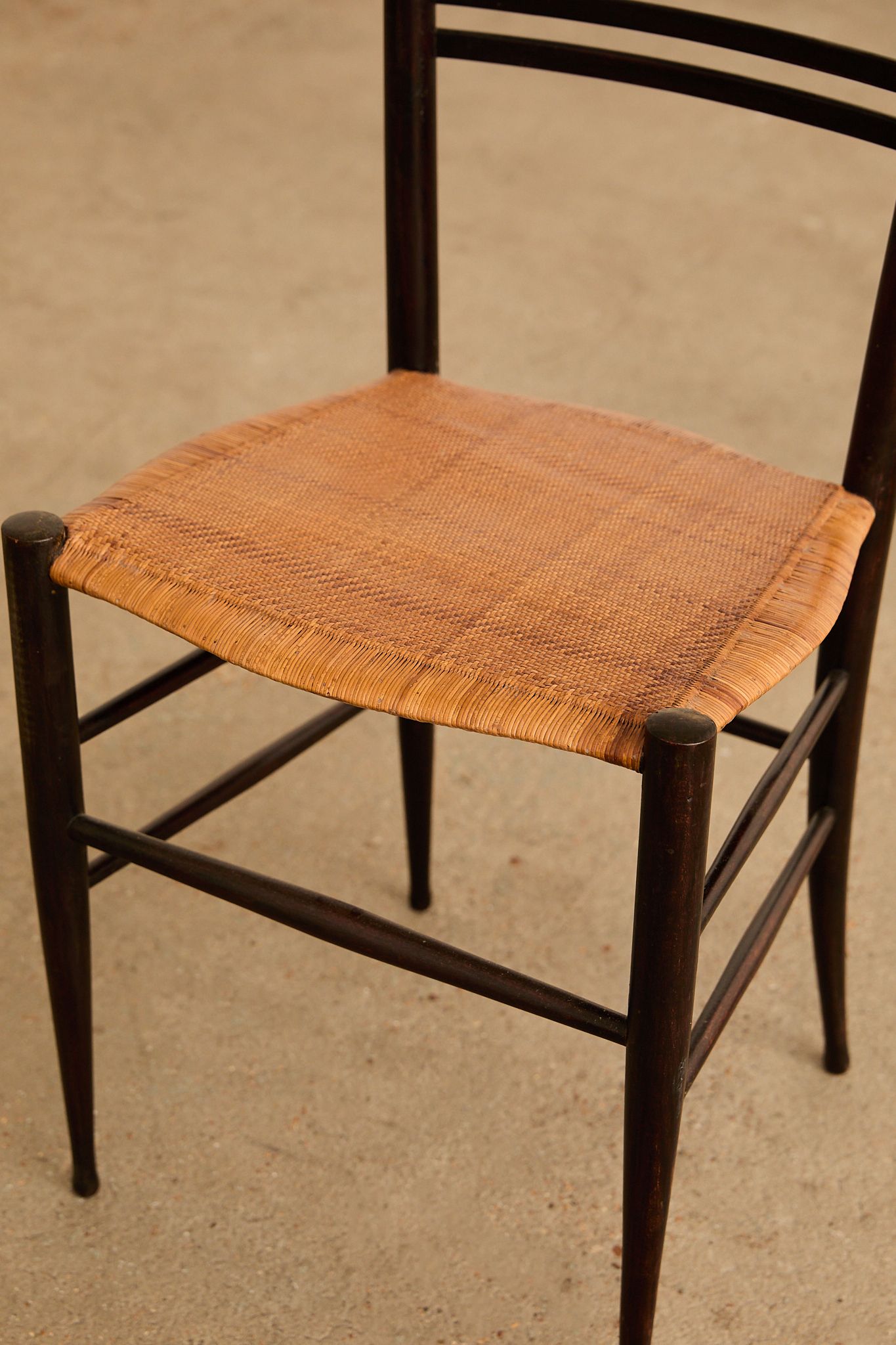 Elegant set of six dark-stained wooden ladder-back chairs with tall, sculptural slat backs and hand-woven rush seats, finished with tapered legs and stretcher bases—evoking the refined craftsmanship and lightness of Gio Ponti’s iconic Superleggera chair.