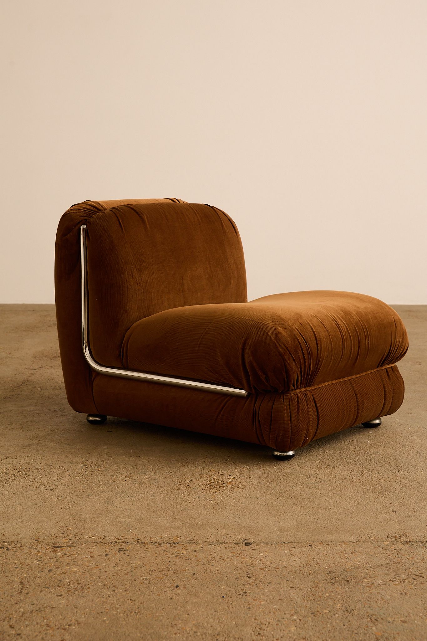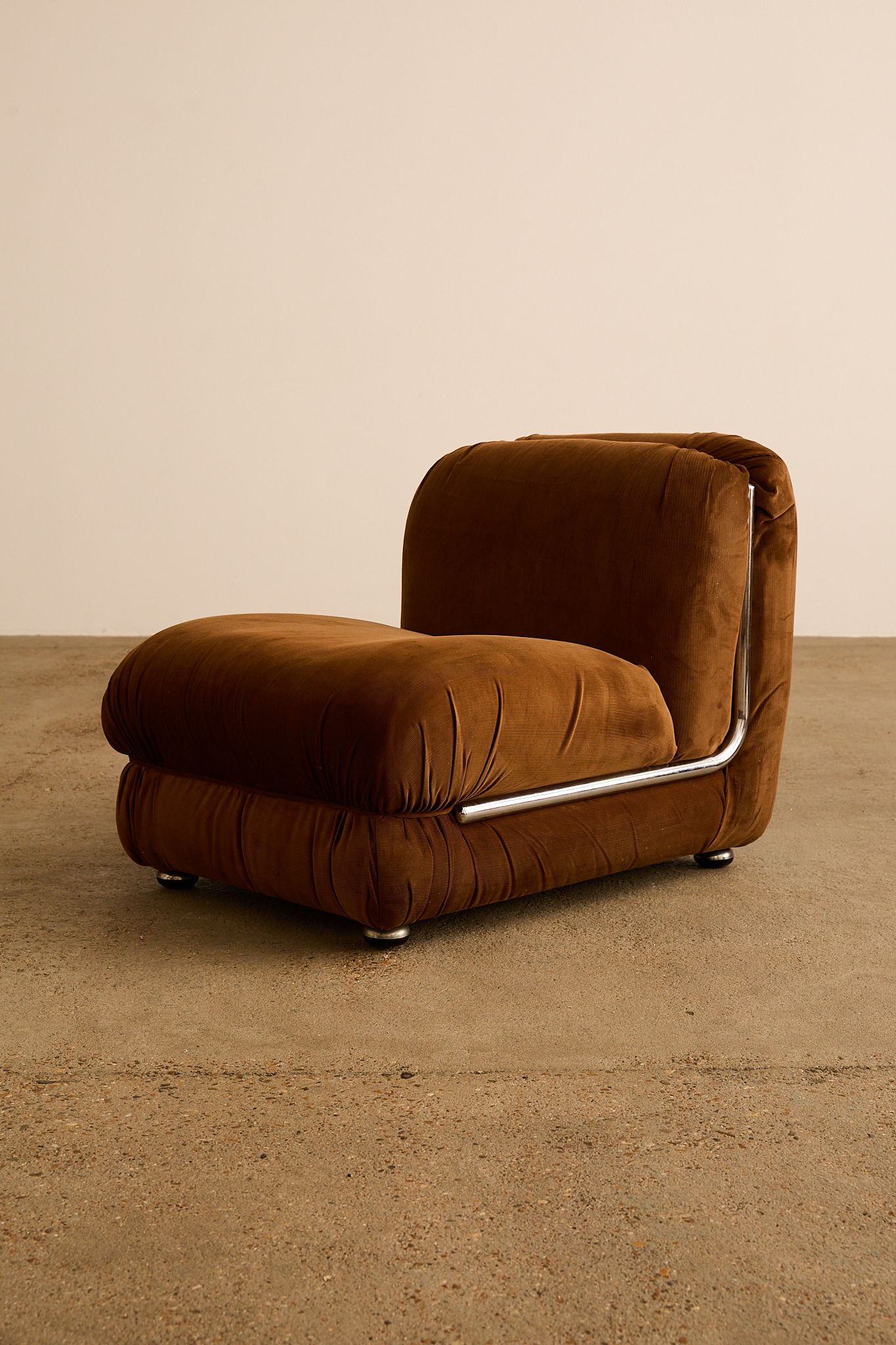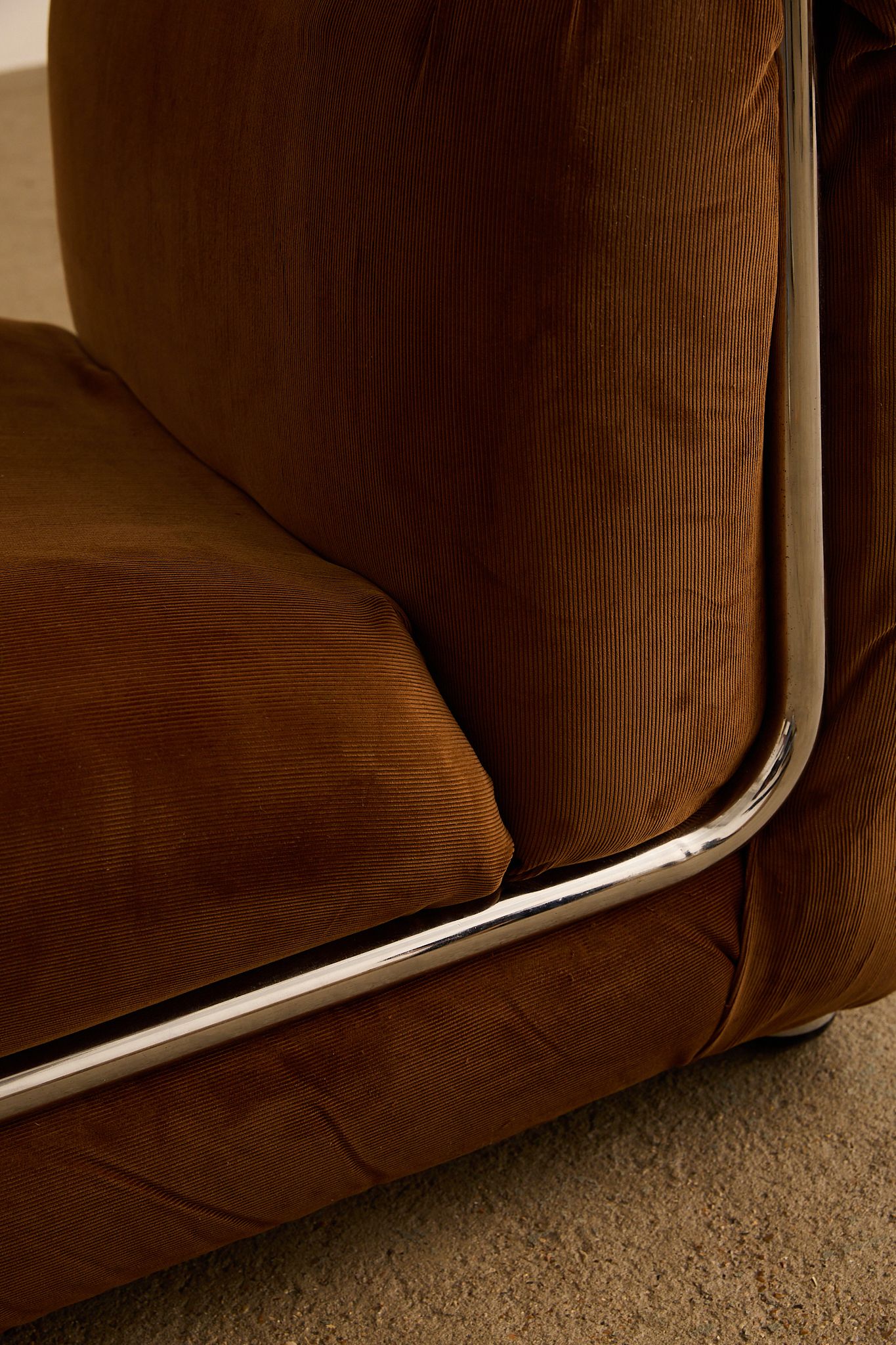 1970s low-slung lounge armchair with tubular chrome frames wrapping around generously padded seats, newly upholstered in soft corduroy in tan brown tones.