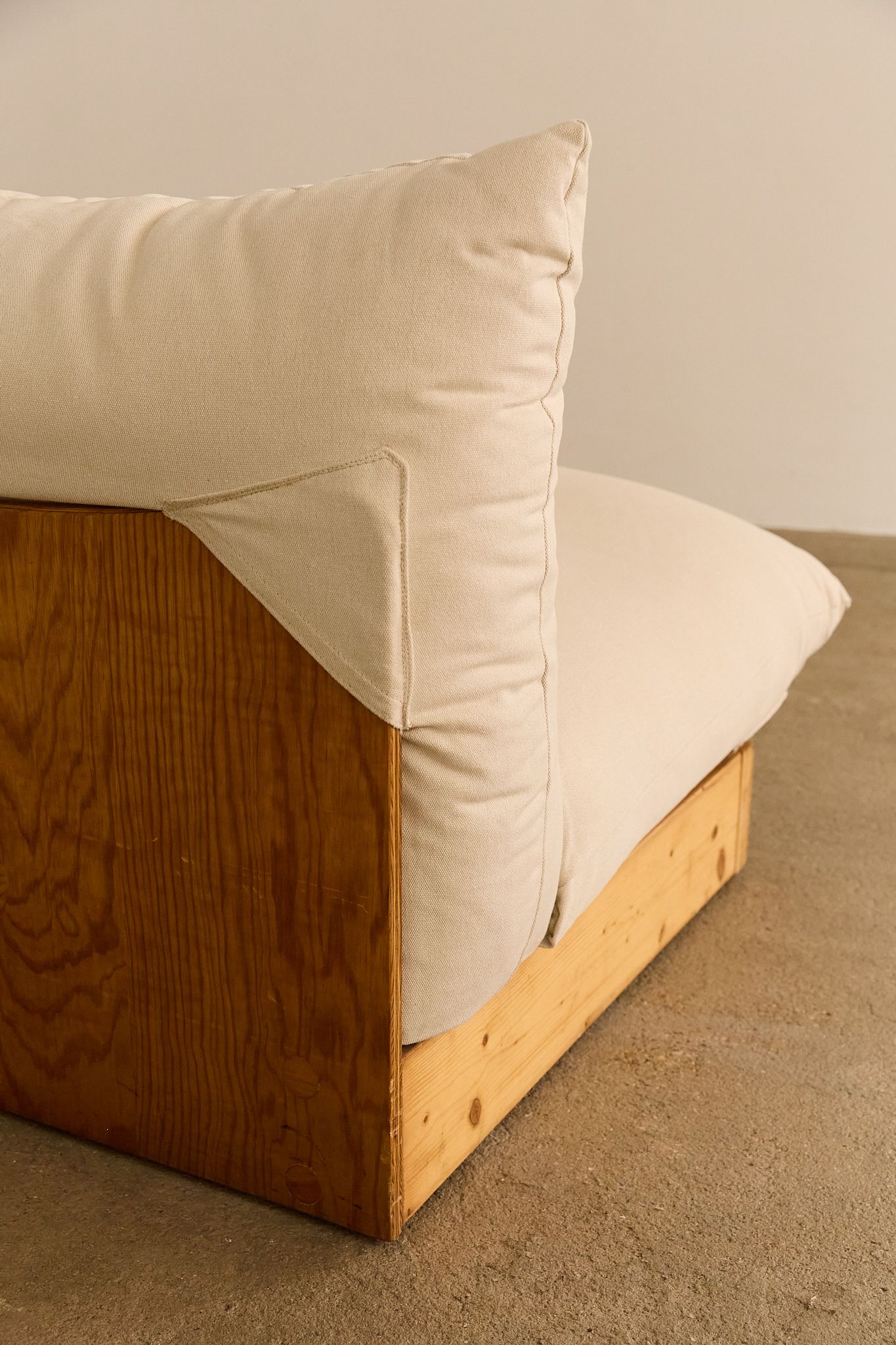 A generous five-seat Italian modular sofa resting on solid pine bases, newly reupholstered in natural cotton fabric. The design emphasises comfort with oversized, cloud-like cushions that invite relaxation while maintaining a clean, architectural profile. Each section can be arranged together or used individually as armchairs. Vat is added on top as it’s an imported item.