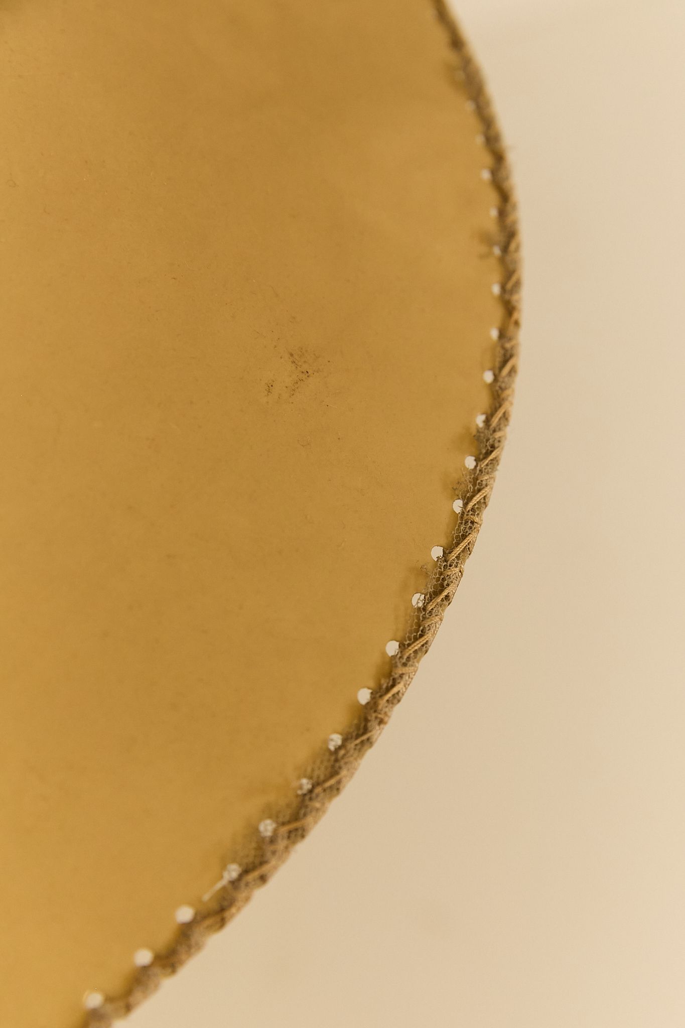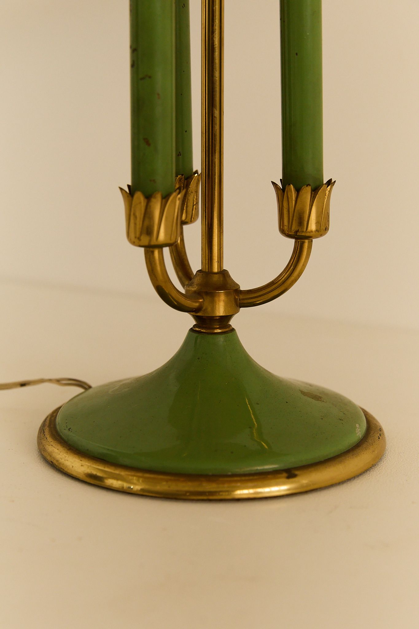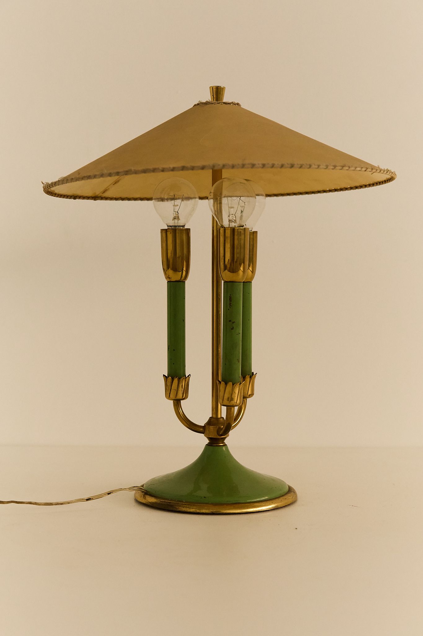 Elegant table lamp with painted metal structure, fabric shade, and refined brass details. Retains its original lampshade, which shows light wear consistent with age.