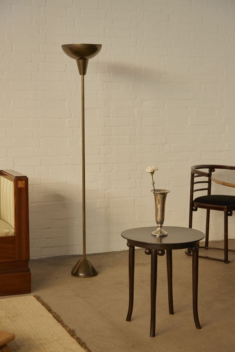 A rounded base contrasts with the brass uplighter, with a beautiful patina throughout. Produced by Azucena in the 1940s. Milanese architect and designer Luigi Caccia Dominioni (1913–2016) played a key role in postwar Milan’s revival and won multiple Compasso d’Oro awards. He first gained recognition collaborating with Livio and Pier Giacomo Castiglioni on pioneering radios before co-founding Azucena in 1947 with Ignazio Gardella and Corrado Corradi Dell’Acqua.