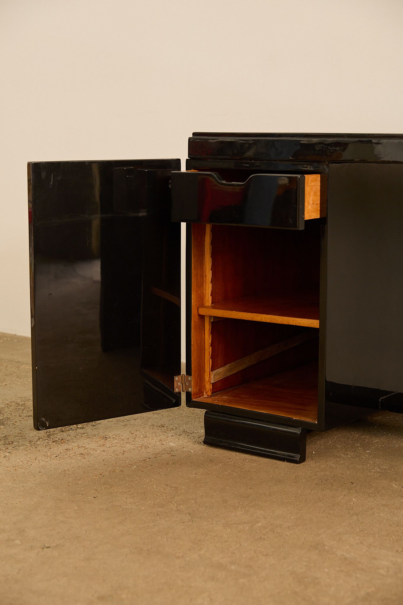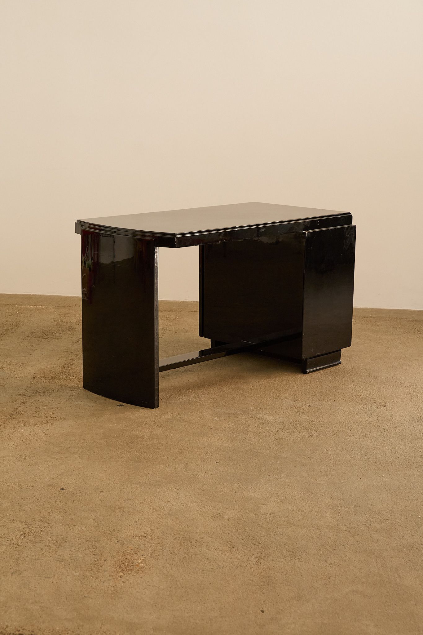 Elegant Modernist desk in black lacquered wood with a streamlined silhouette. The rectangular top is supported by a rounded end panel on one side and a block cabinet with square metal pull on the other, housing both a drawer and interior shelving. The glossy lacquer finish enhances its geometric clarity, while the combination of straight lines and soft curves reflects the sophistication of 1930-40s French design.