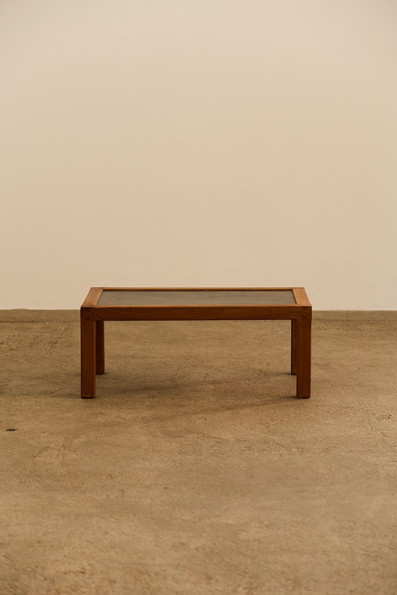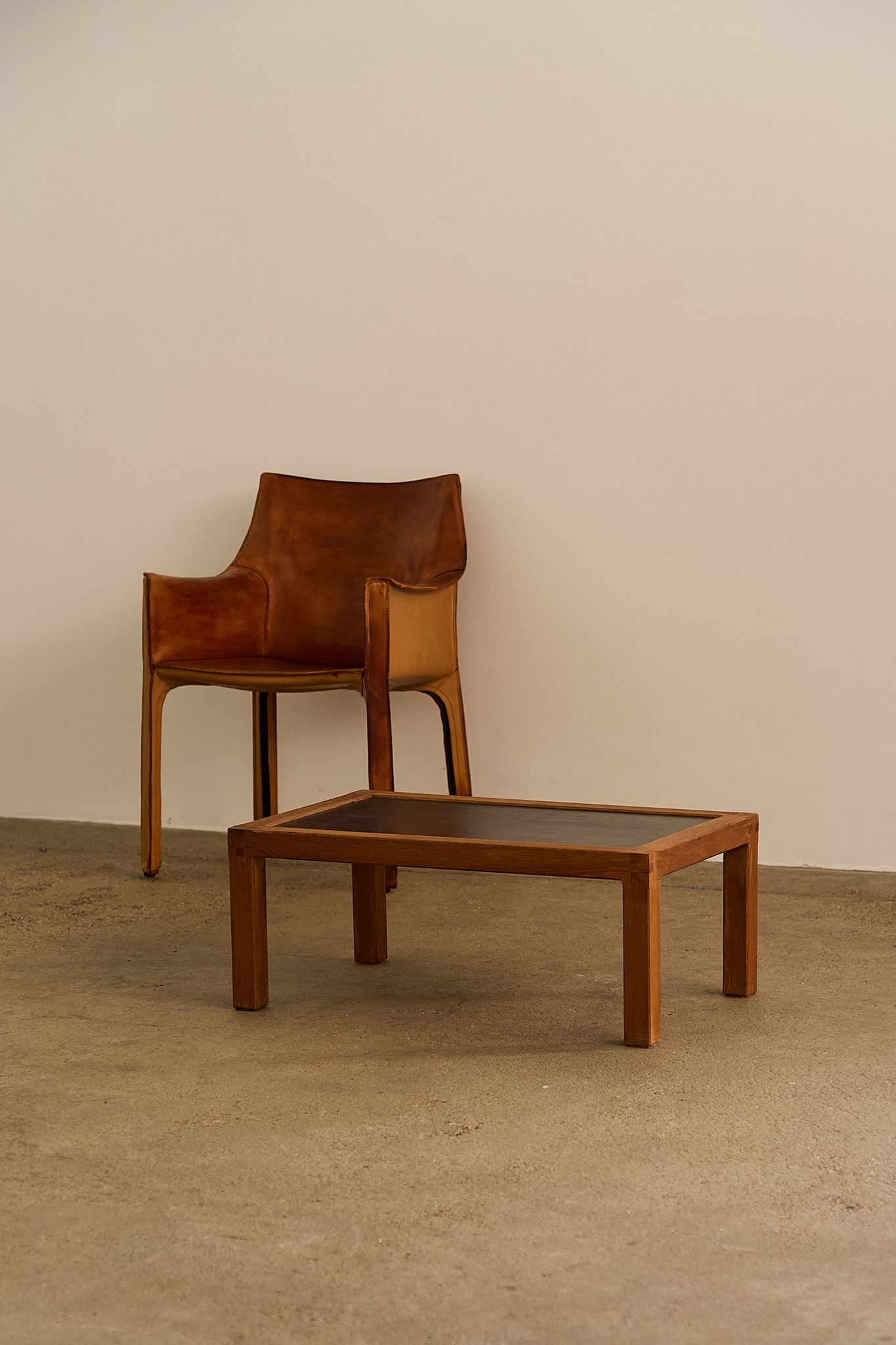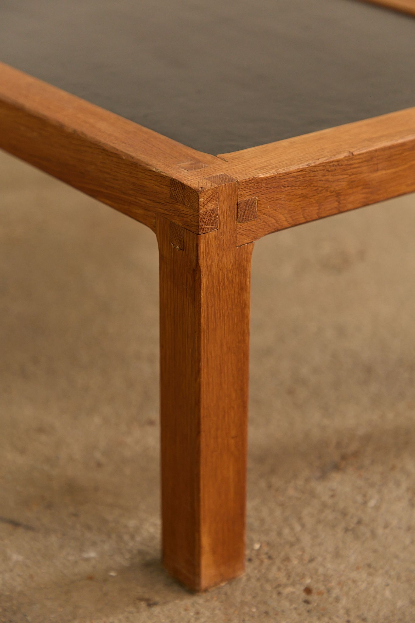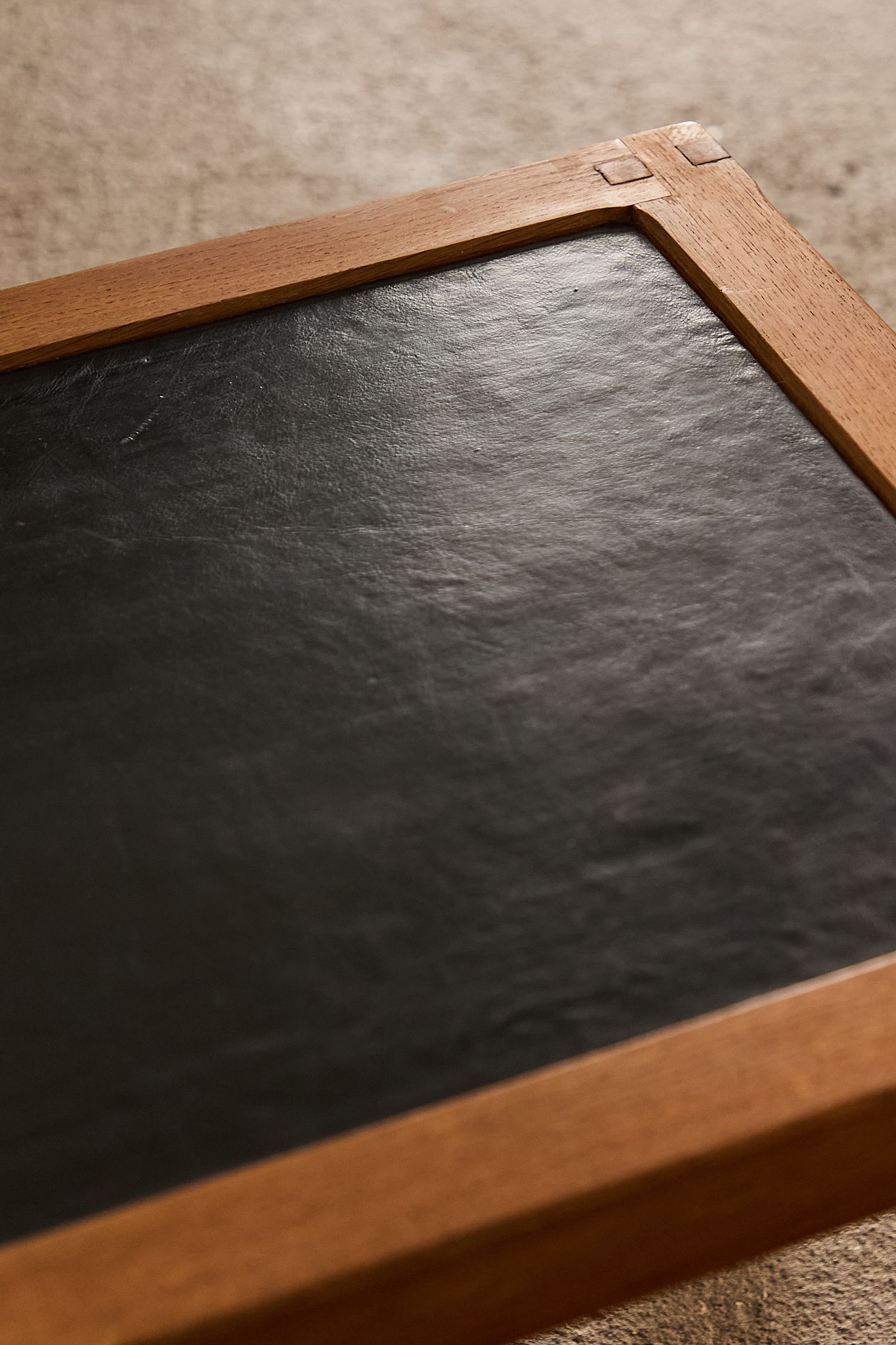 A low rectangular coffee table attributed to Pierre Chapo, crafted in solid oak with exposed mortise and tenon joints. The black leather inset top contrasts elegantly with the natural wood frame, highlighting Chapo’s architectural clarity and craftsmanship.