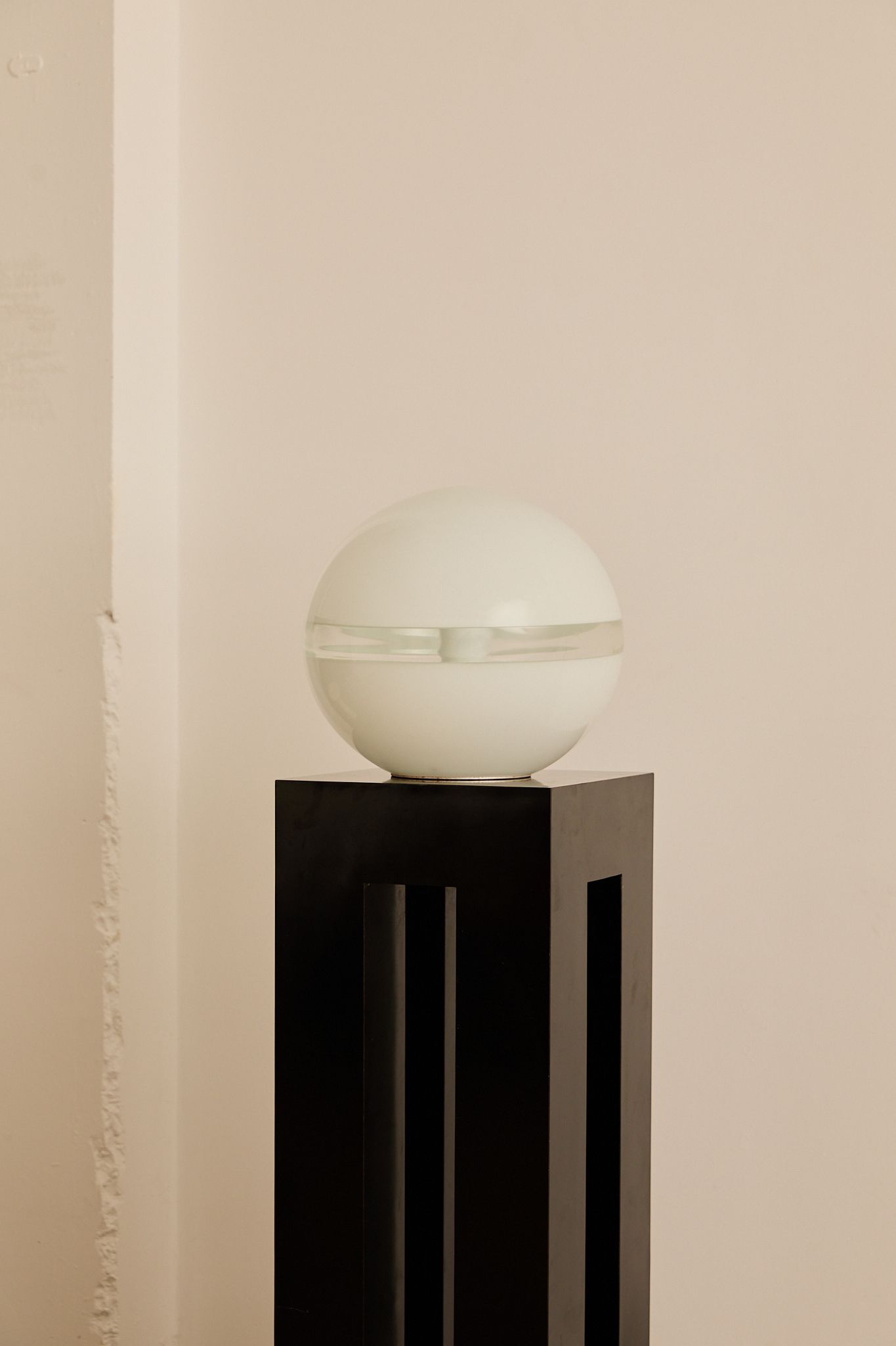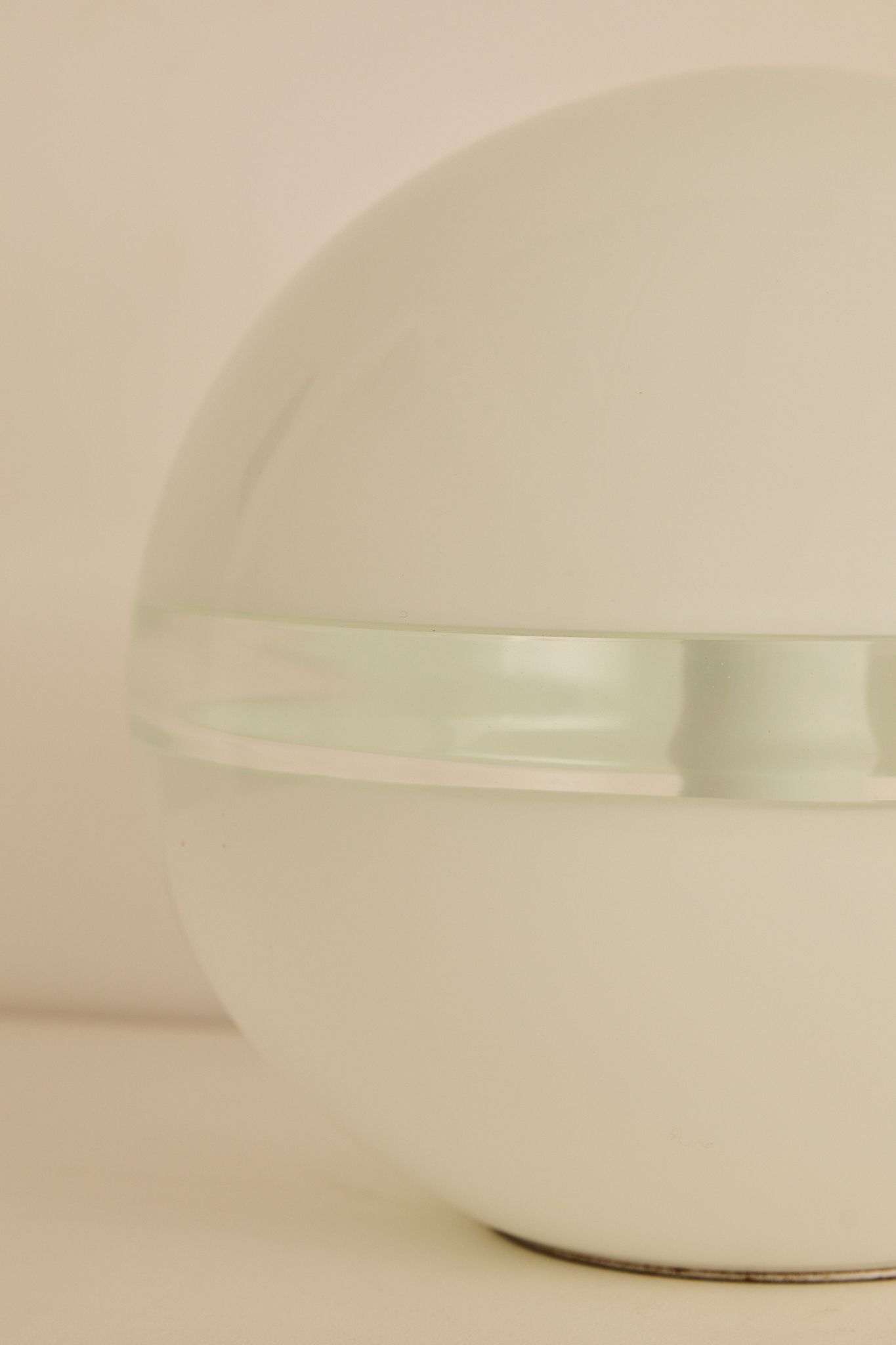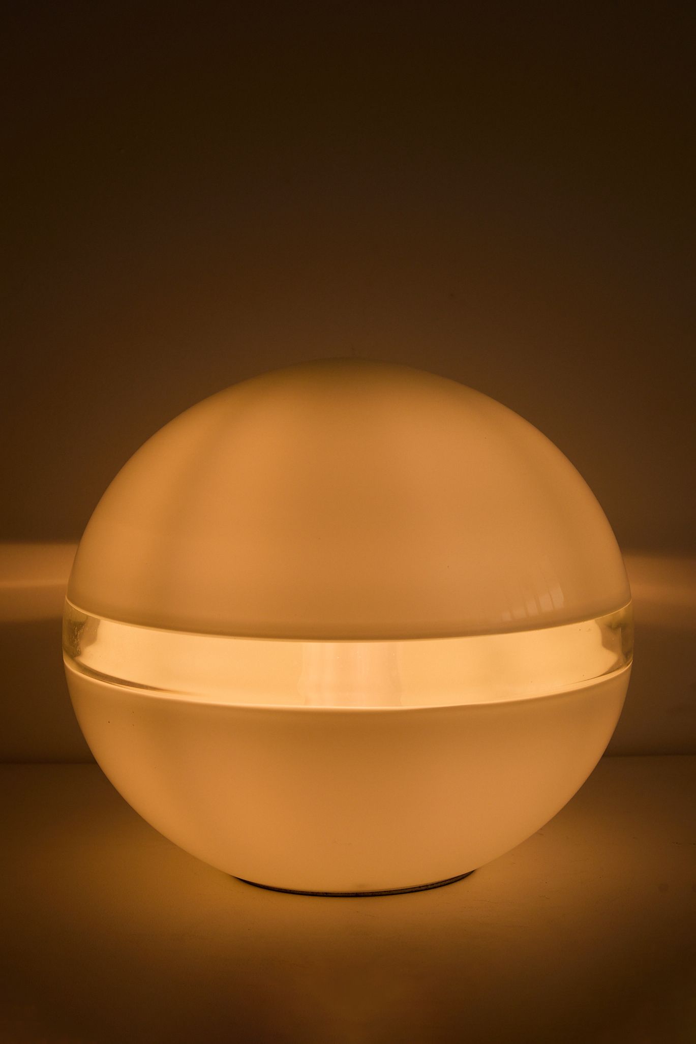 Table lamp model LT 231 in white, designed by Carlo Nason and produced in the 1970s by A.V. Mazzega (Murano). The lamp is made of white Murano glass and features a clear crystal band. This model was produced in two sizes; this is the larger LT 231 version, with a 40 cm diameter. 2 available. Price is for one.