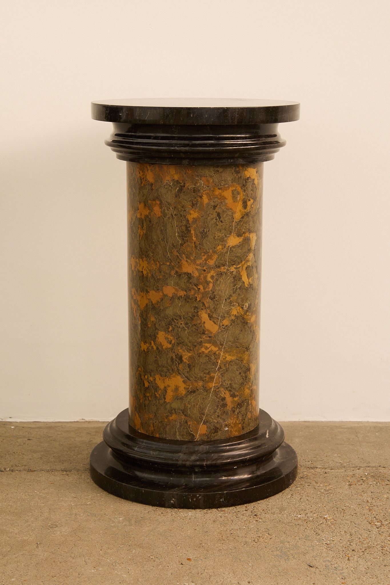 A beautiful pair of solid (heavy) pedestals. Each features a cylindrical column form in richly veined ochre and green marble, capped and based with contrasting black marble.