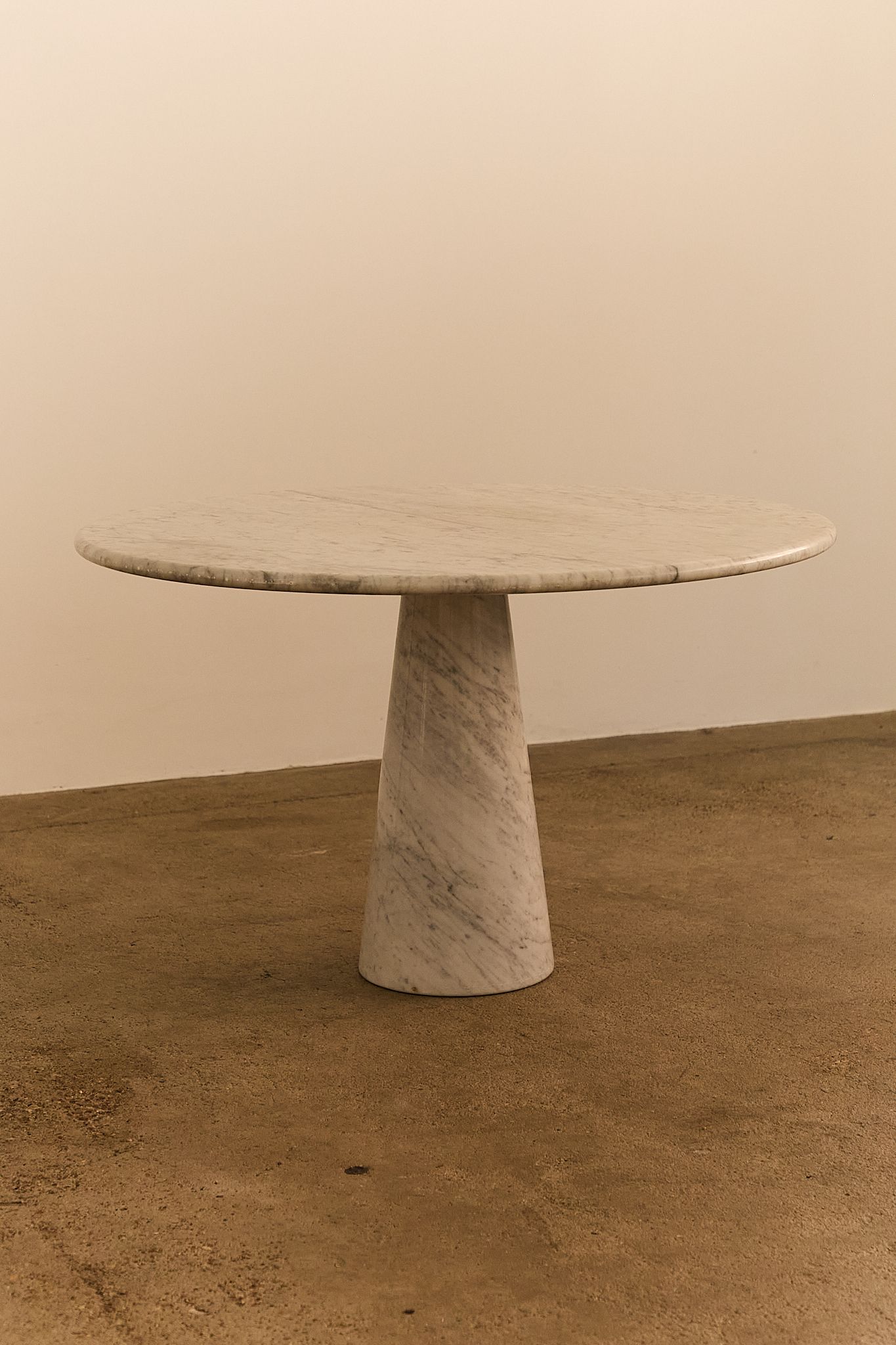 Sculptural dining or center table crafted entirely from Italian Carrara marble. The design features a circular top resting on a conical base, a hallmark of Angelo Mangiarotti’s architectural aesthetic—balancing elegance, mass, and material integrity without the need for visible joints.