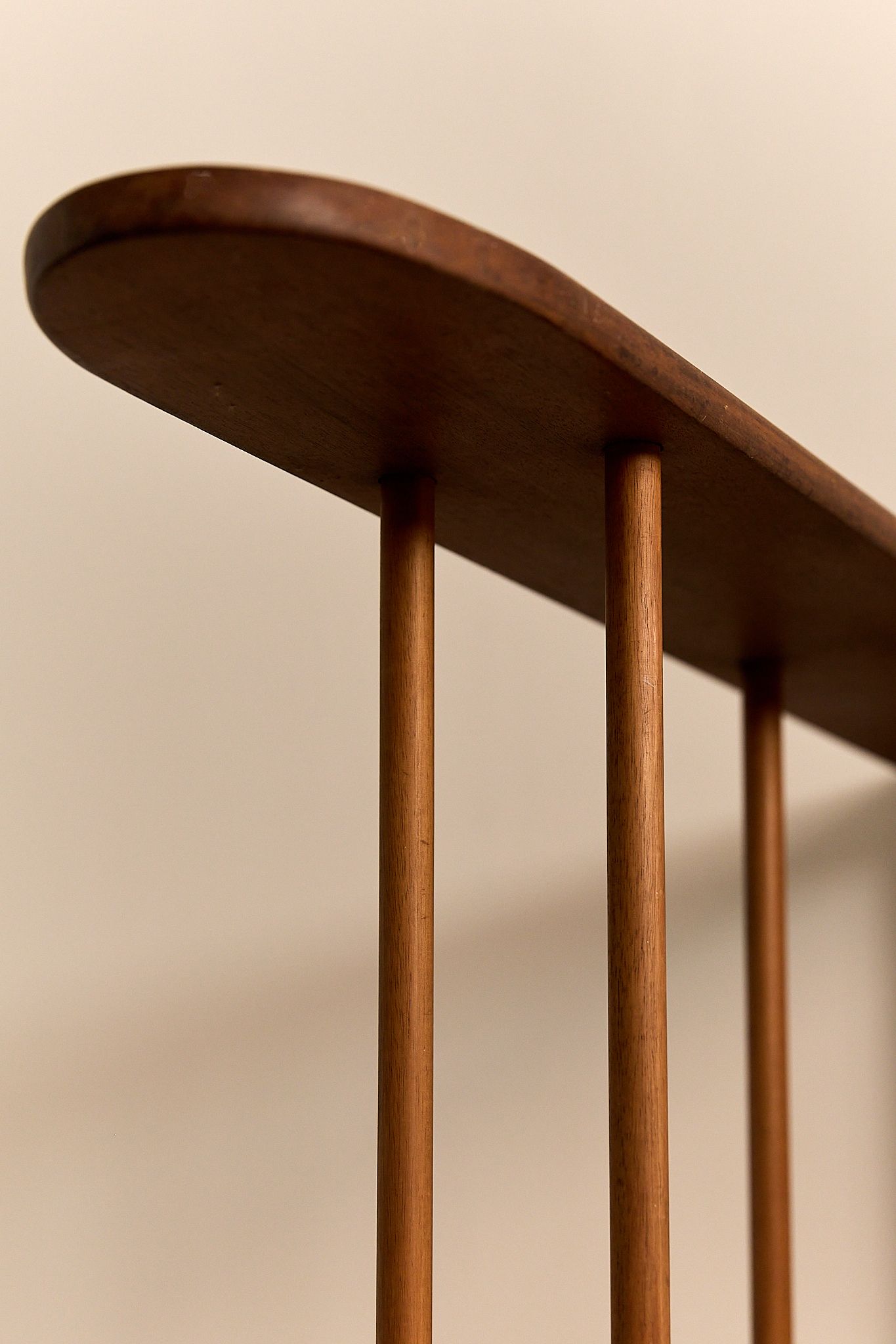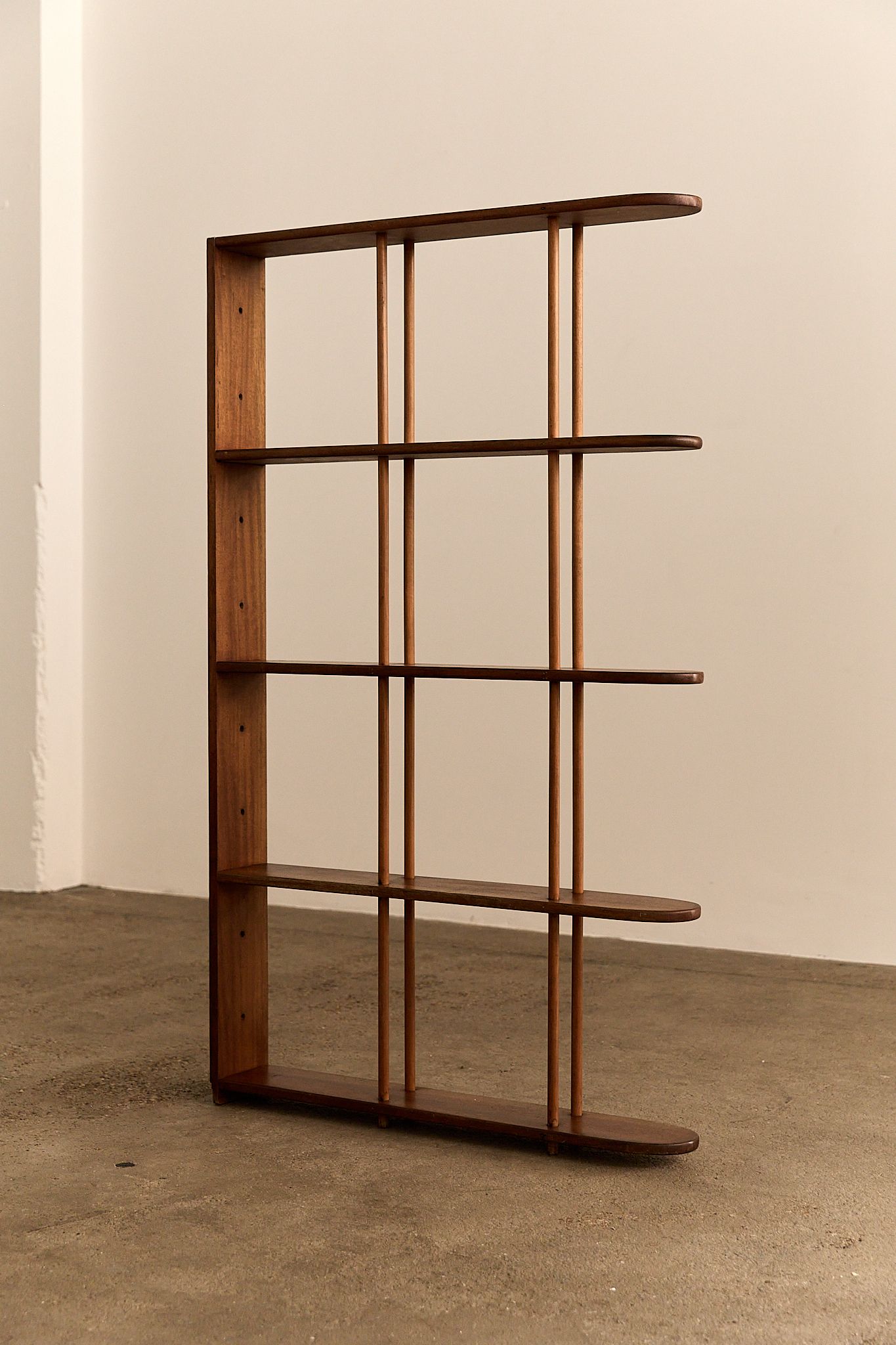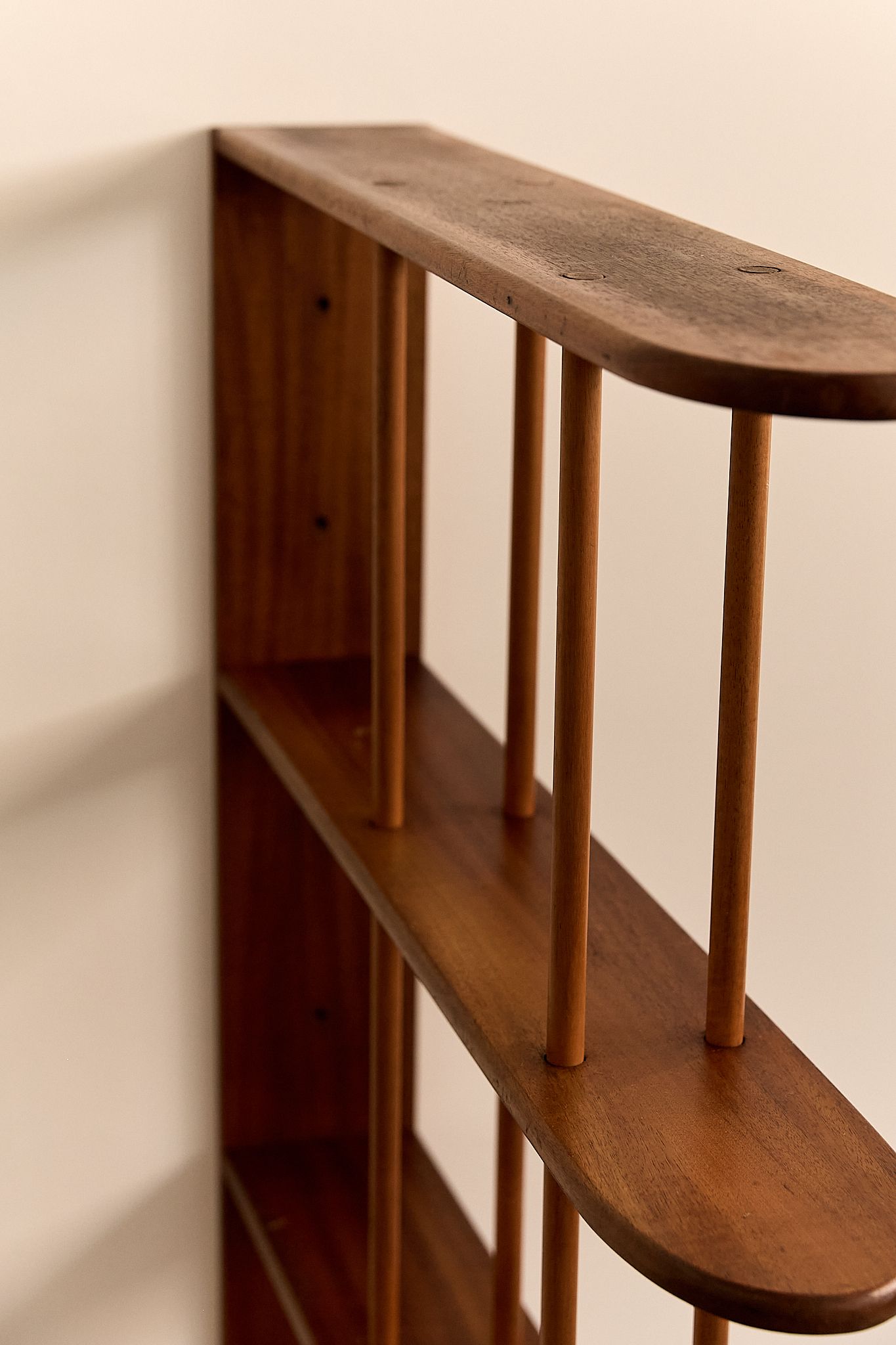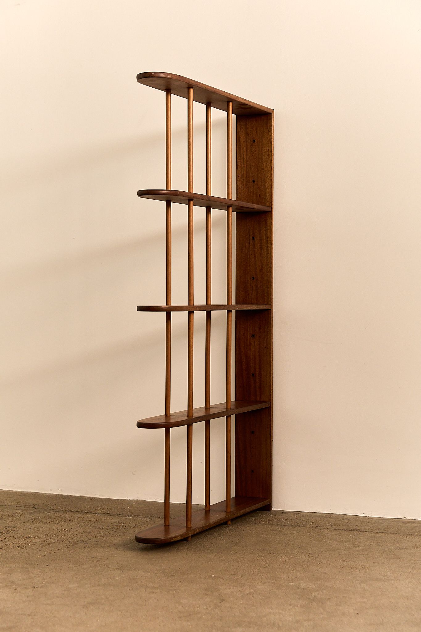 A refined freestanding wall shelf from the 1940s, crafted in oak wood with slender vertical supports. The design features five evenly spaced shelves, each accented by elegant wooden rods that lend structure and visual rhythm. Minimal yet sculptural, it offers both function and presence; perfect for displaying books, objects, or ceramics.