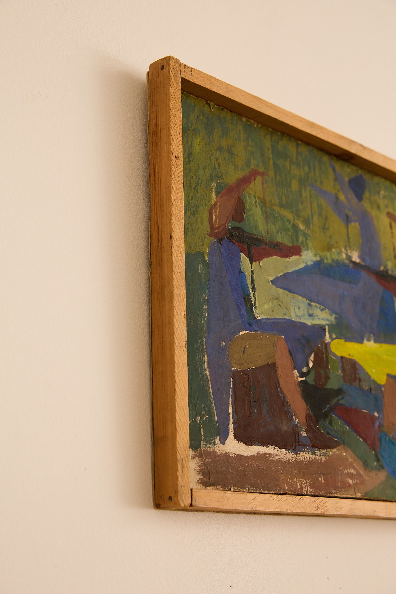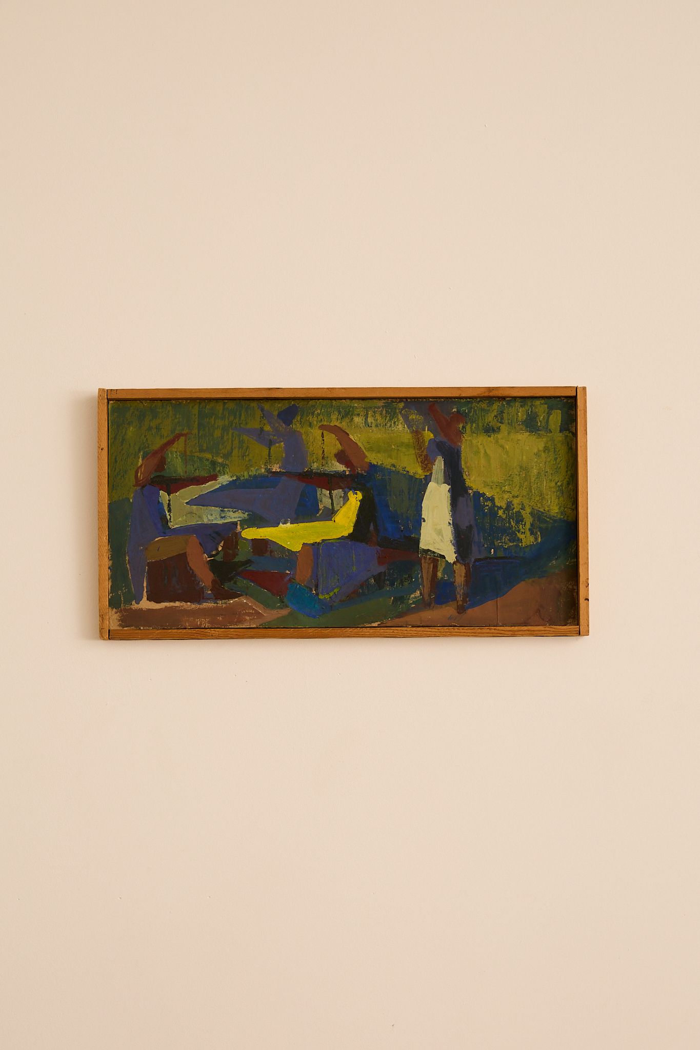 Rectangular modernist painting in vivid greens, blues, yellows and earthy reds, depicting stylised standing and seated figures around a central form. Executed in thick, expressive brushstrokes on board and presented in a simple wooden frame.