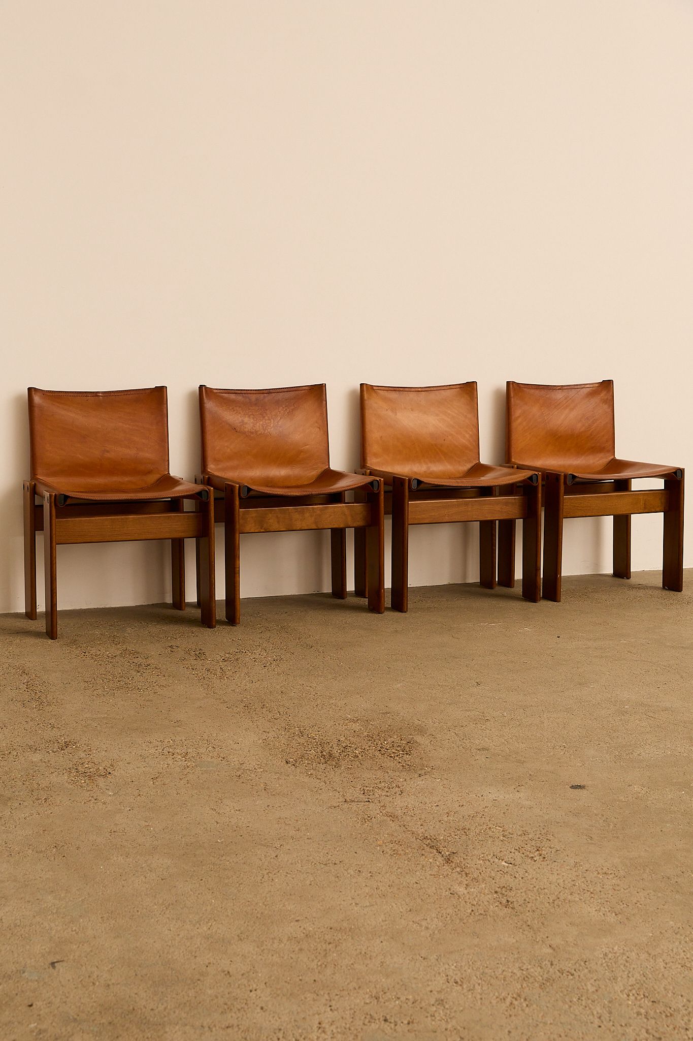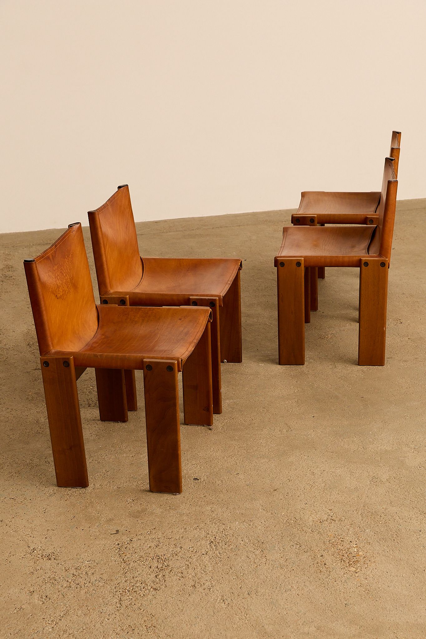The cognac leather and warm walnut wood create a striking contrast. Their cross-angled legs give a light, flat appearance despite their solid weight. Black nail details on each leg add character. A refined, high-quality design by the award-winning Italian duo.
