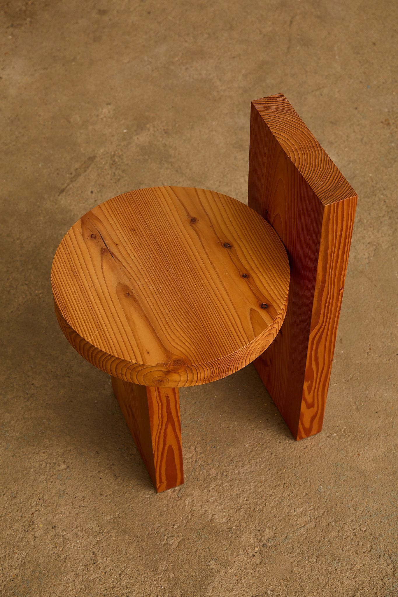 Moon chair/stool in ash wood by contemporary British designer Dale Stephens of TMPL Studio. A sculptural piece with a thick circular seat set on two solid, slab-like legs, showcasing the warm grain and graphic simplicity of the timber.