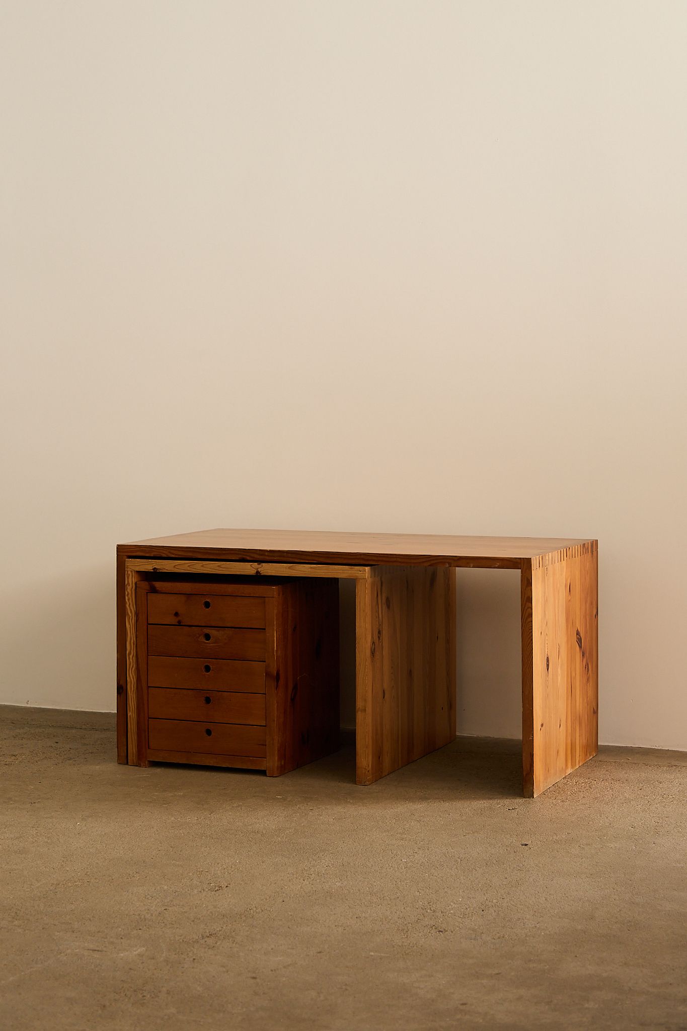 Set of three minimalist pine desks tables by Ate Van Apeldoorn for Houtwerk Hattem, Netherlands. Designed in the 1960s, this modular set includes a large desk, a smaller desk, and a drawer unit, all crafted from solid pine with exposed wood joints, characteristic of Van Apeldoorn’s functional and honest design style. The pieces slot neatly into one another but can also be used separately, offering versatile configuration and timeless appeal. Price is for the set.
