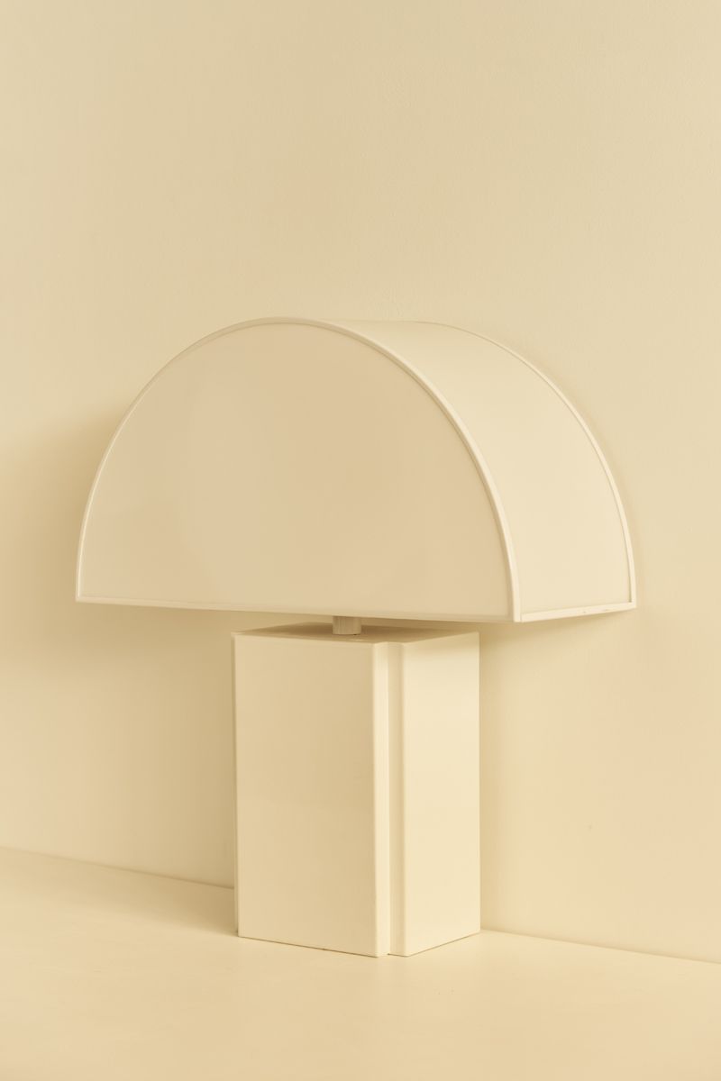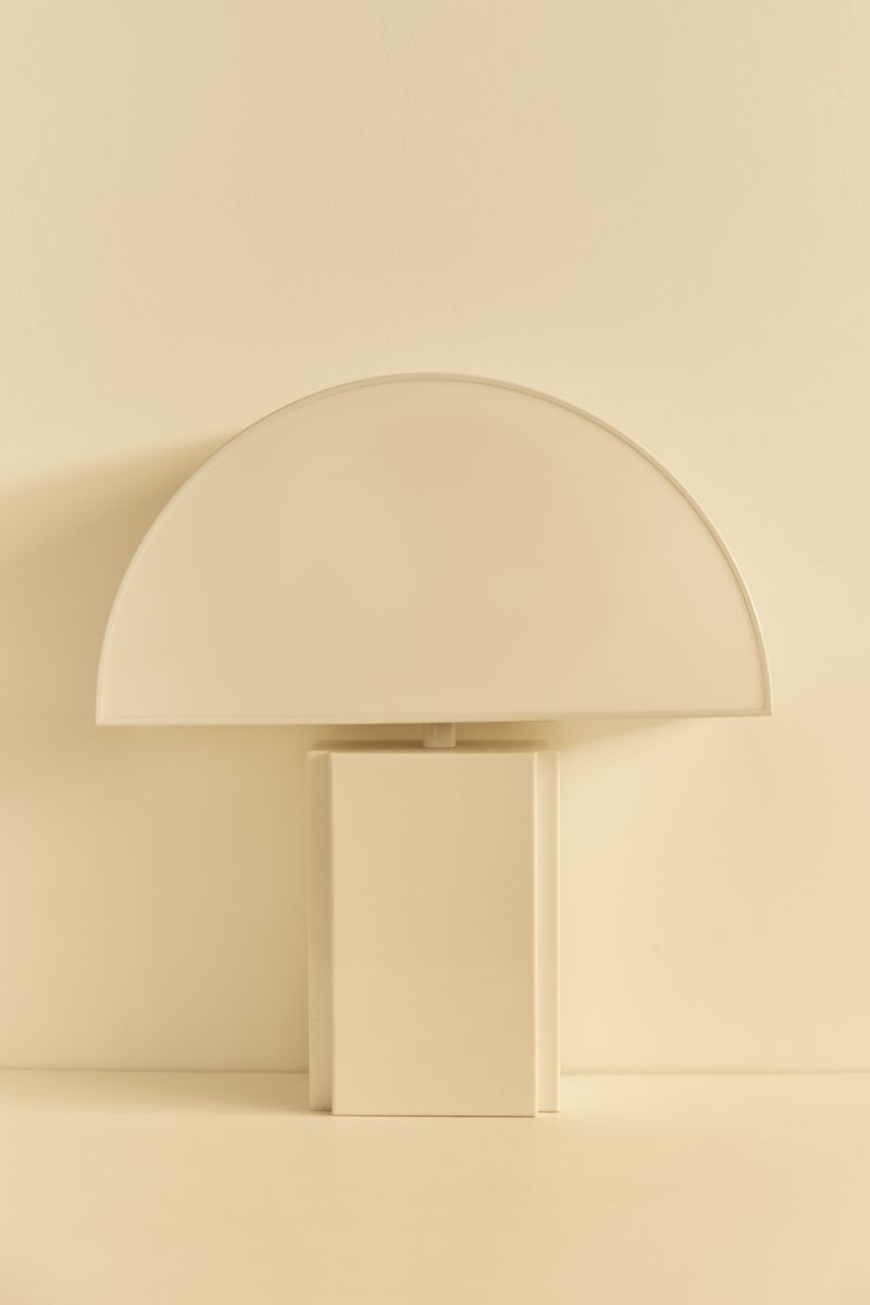 Striking Olympe table lamps, designed by Harvey Guzzini in the 1970s for ED, Italy, is a true statement piece. Its distinctive demilune shade creates a beautiful ambient glow when illuminated, casting a soft, half-moon light through its semi-opaque acrylic. The lamp features a sleek metal base and a plastic shade, thoughtfully designed with an open back for easy access when changing the two bulbs. Only one lamp available