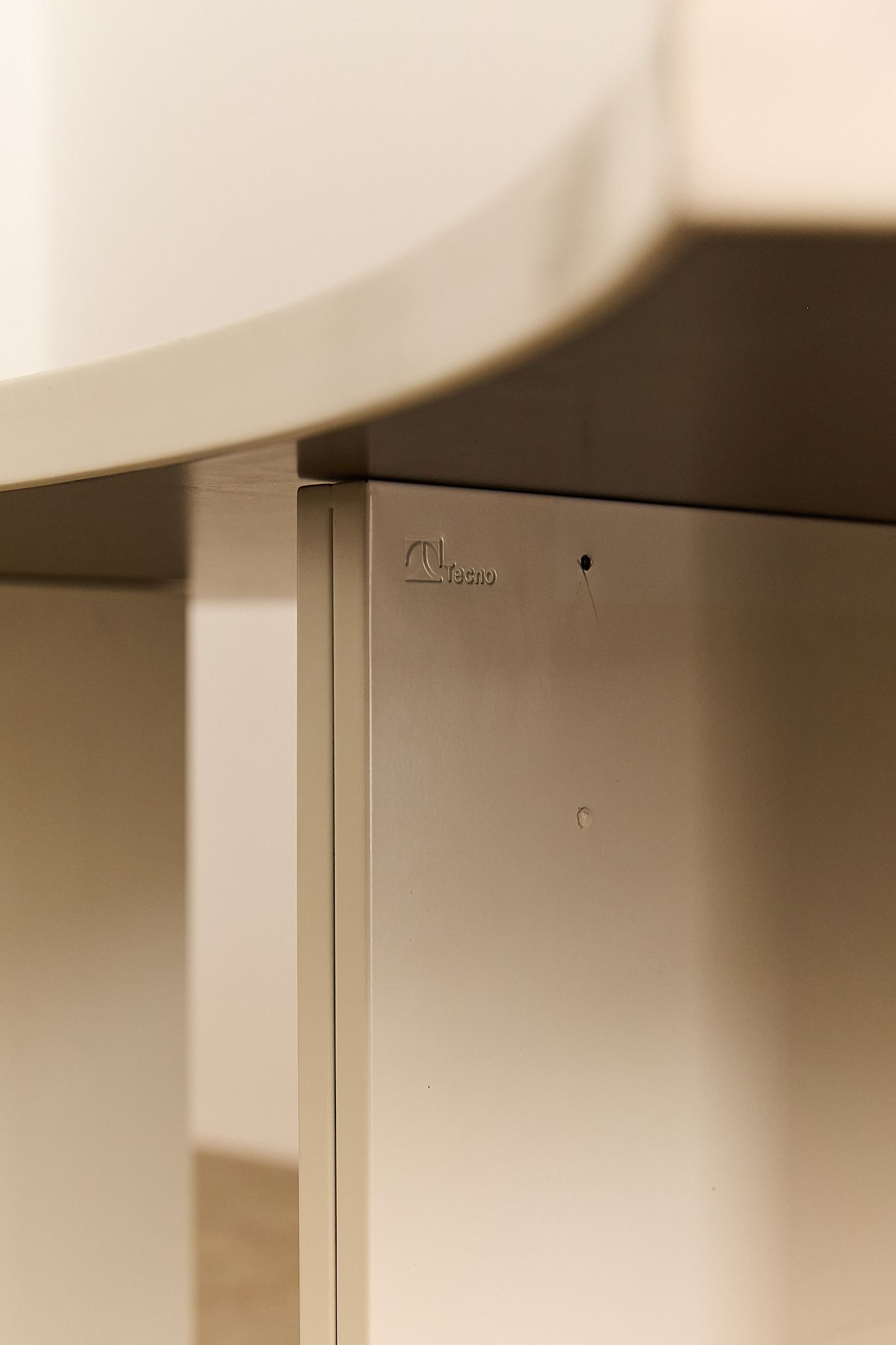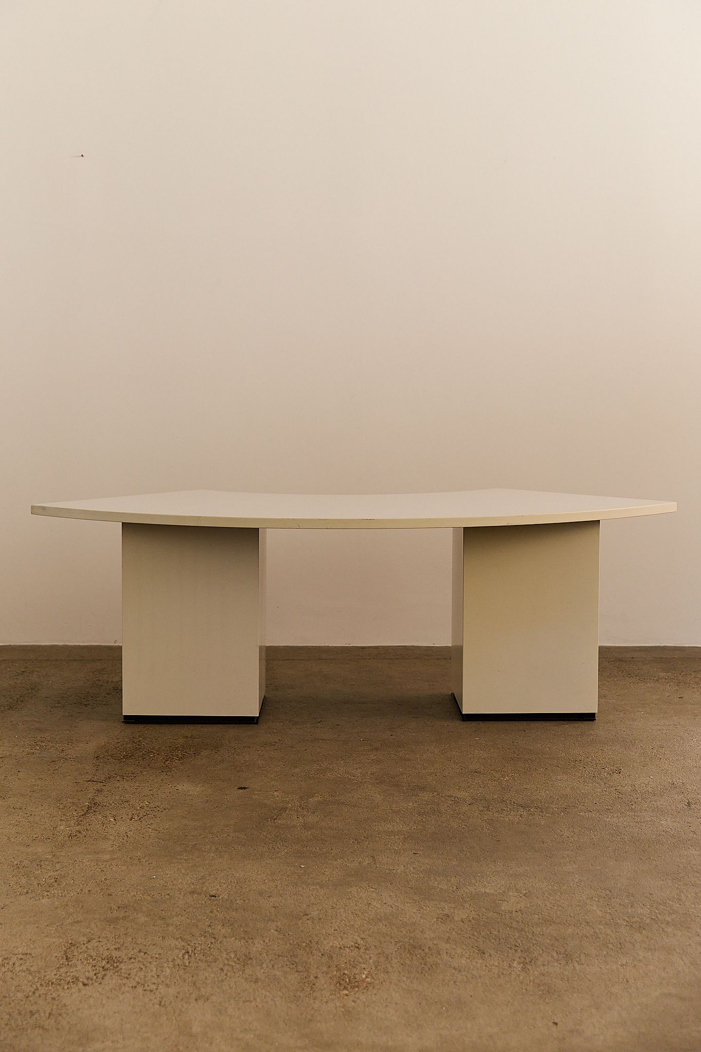 Designed by Osvaldo Borsani for Tecno Italia in the 1970’s, this desk is formed by a pair of white laquered metal and topped with a swooping sheet of white laminate. Stamped Tecno.