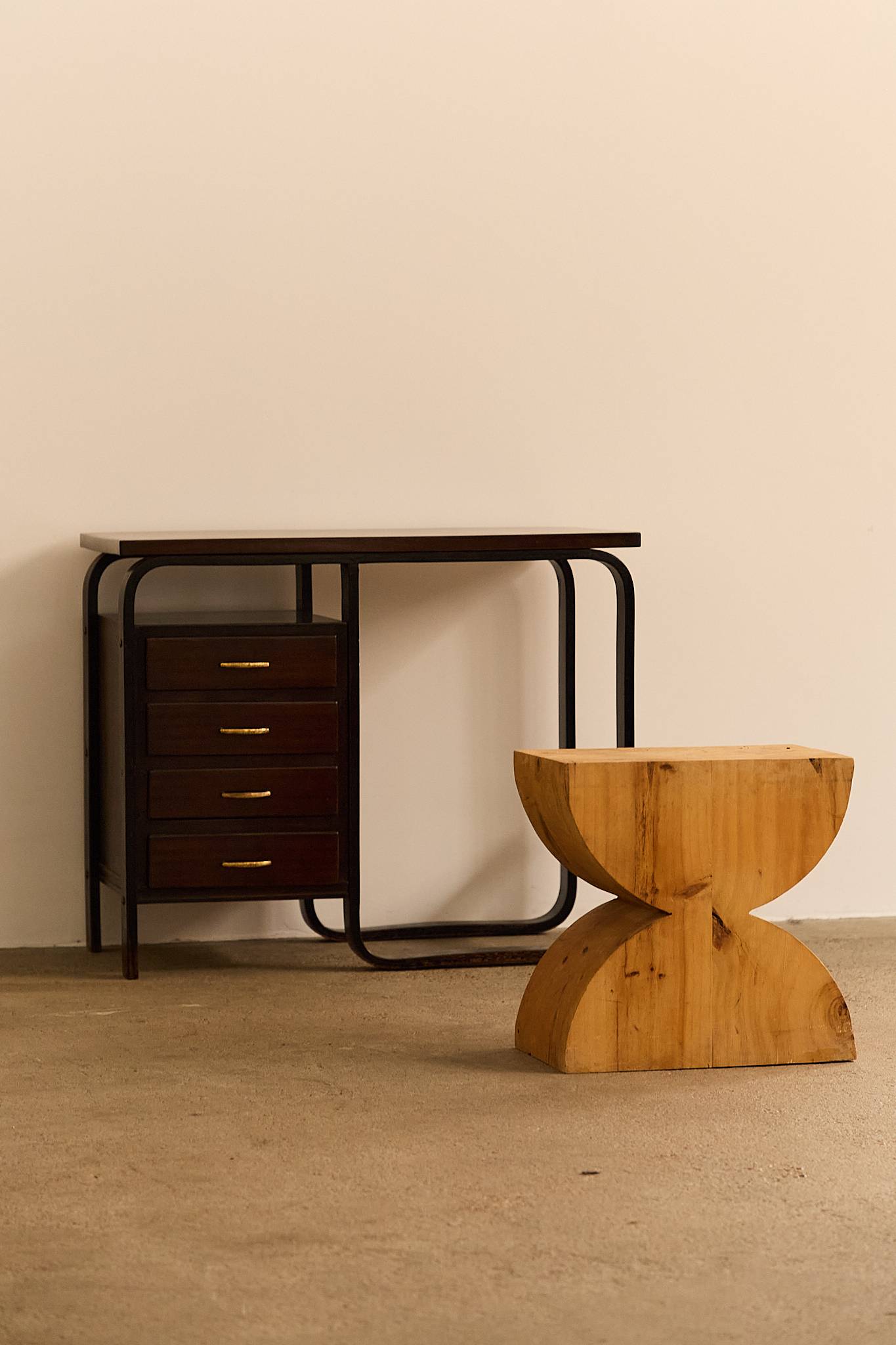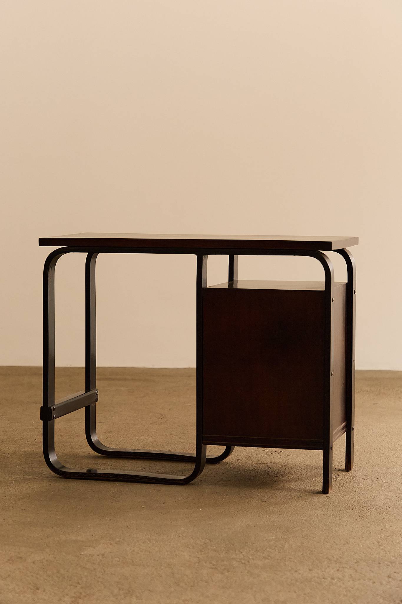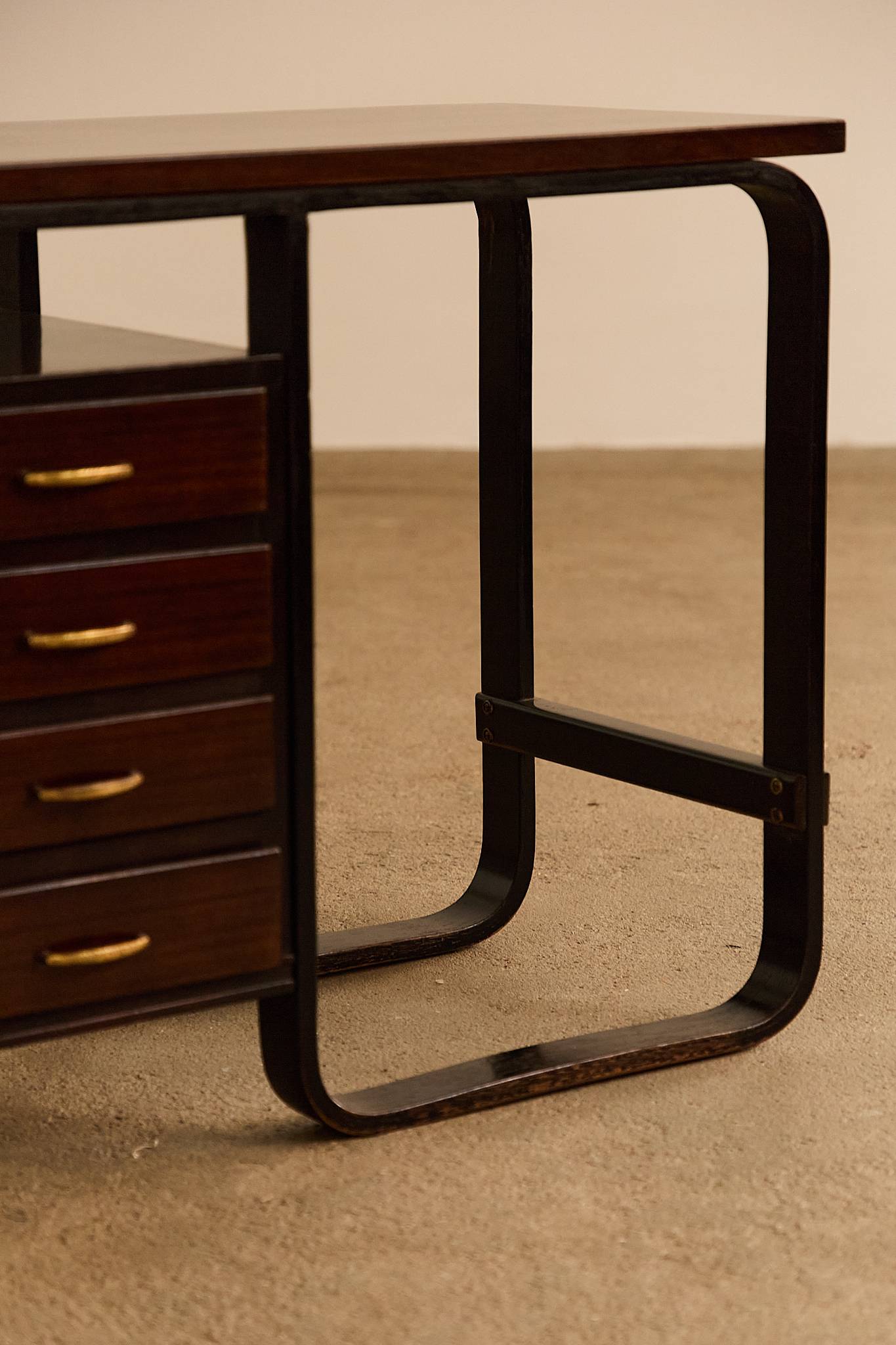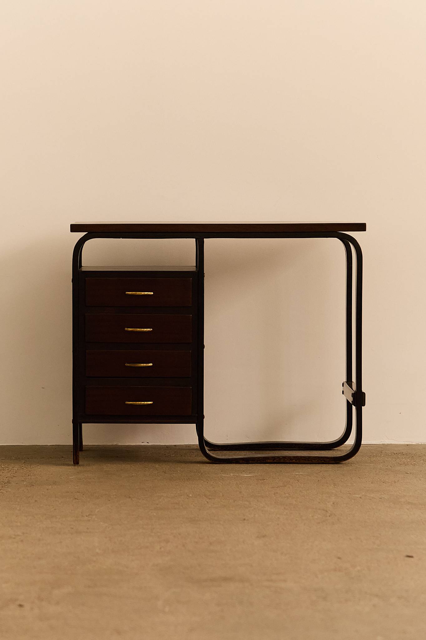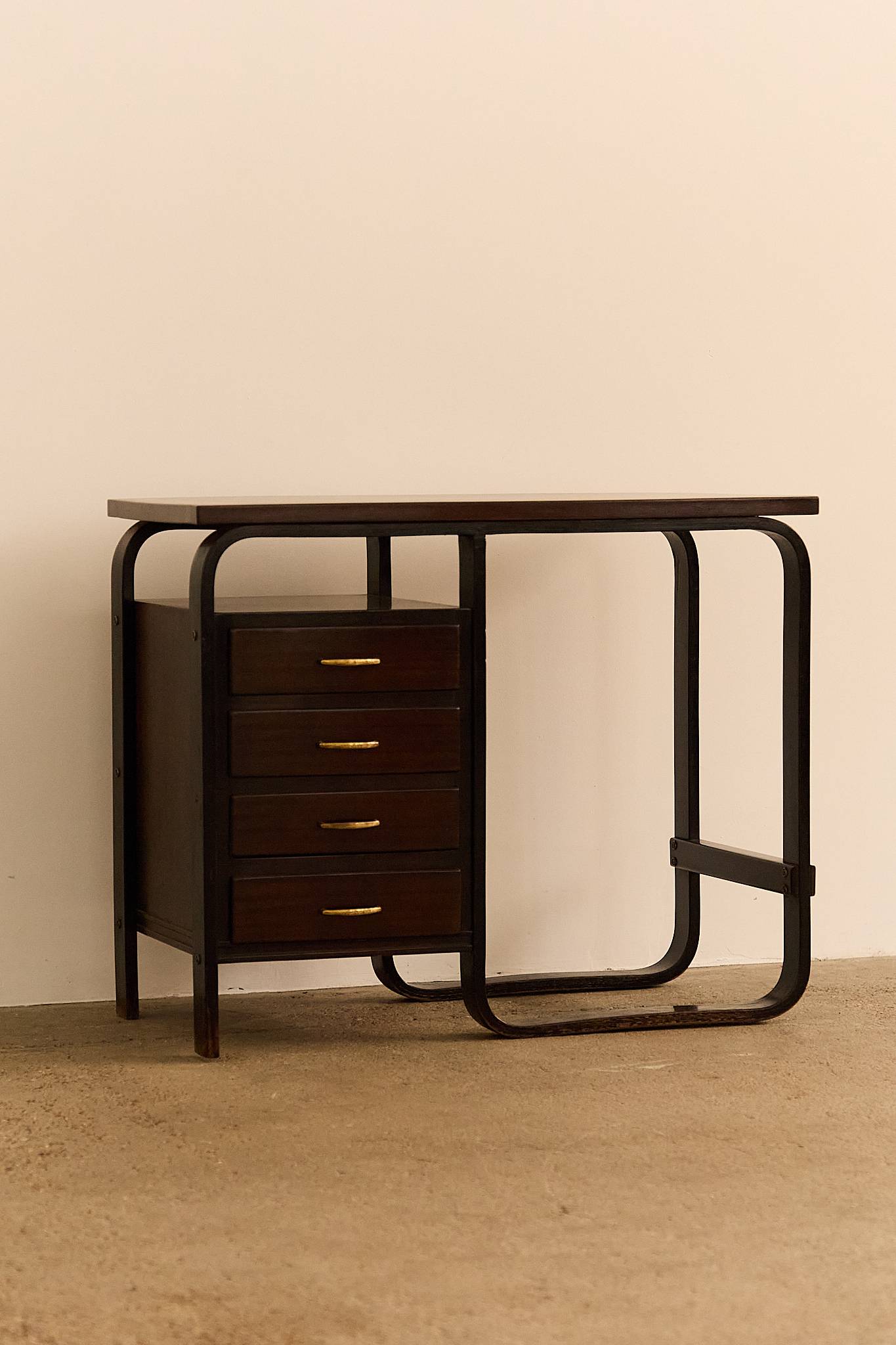 Compact table in stained wood with curved laminated legs and structural detailing, featuring four drawers with brass handles. A functional and elegant piece with early modernist influences, likely originating from a private commission.