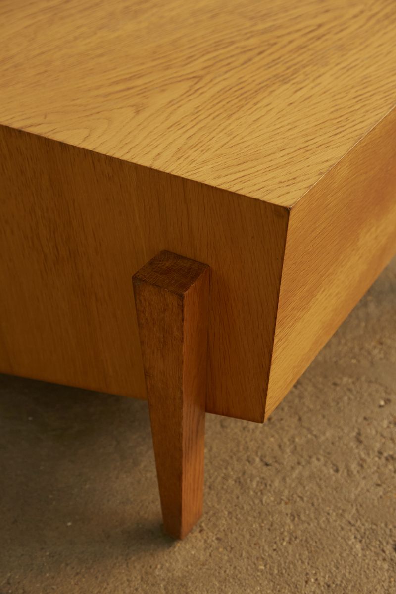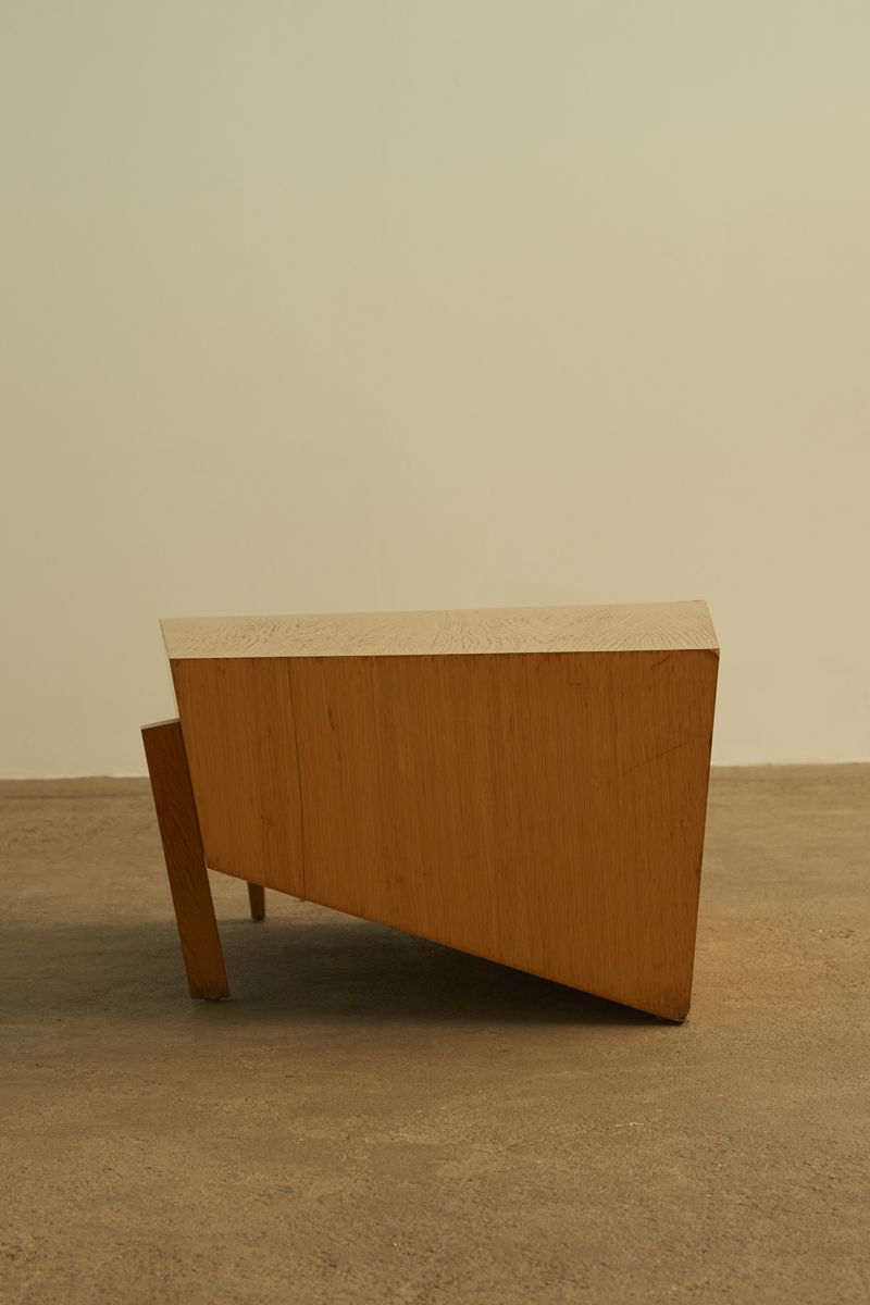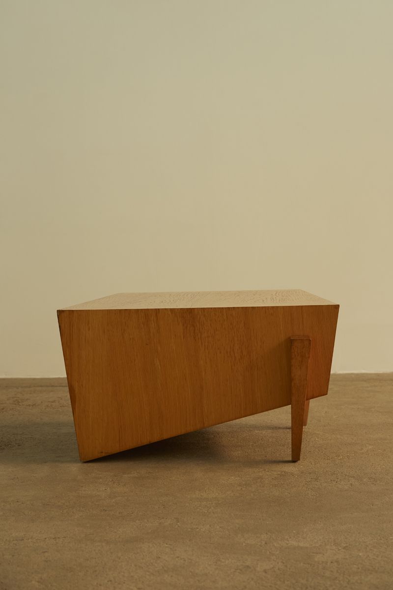 Sourced in France, this unique coffee table features a striking angular design with clean, minimalist lines. Crafted from warm-toned wood, its elevated silhouette rests on four angled legs, showcasing a harmonious blend of functionality and sculptural form.