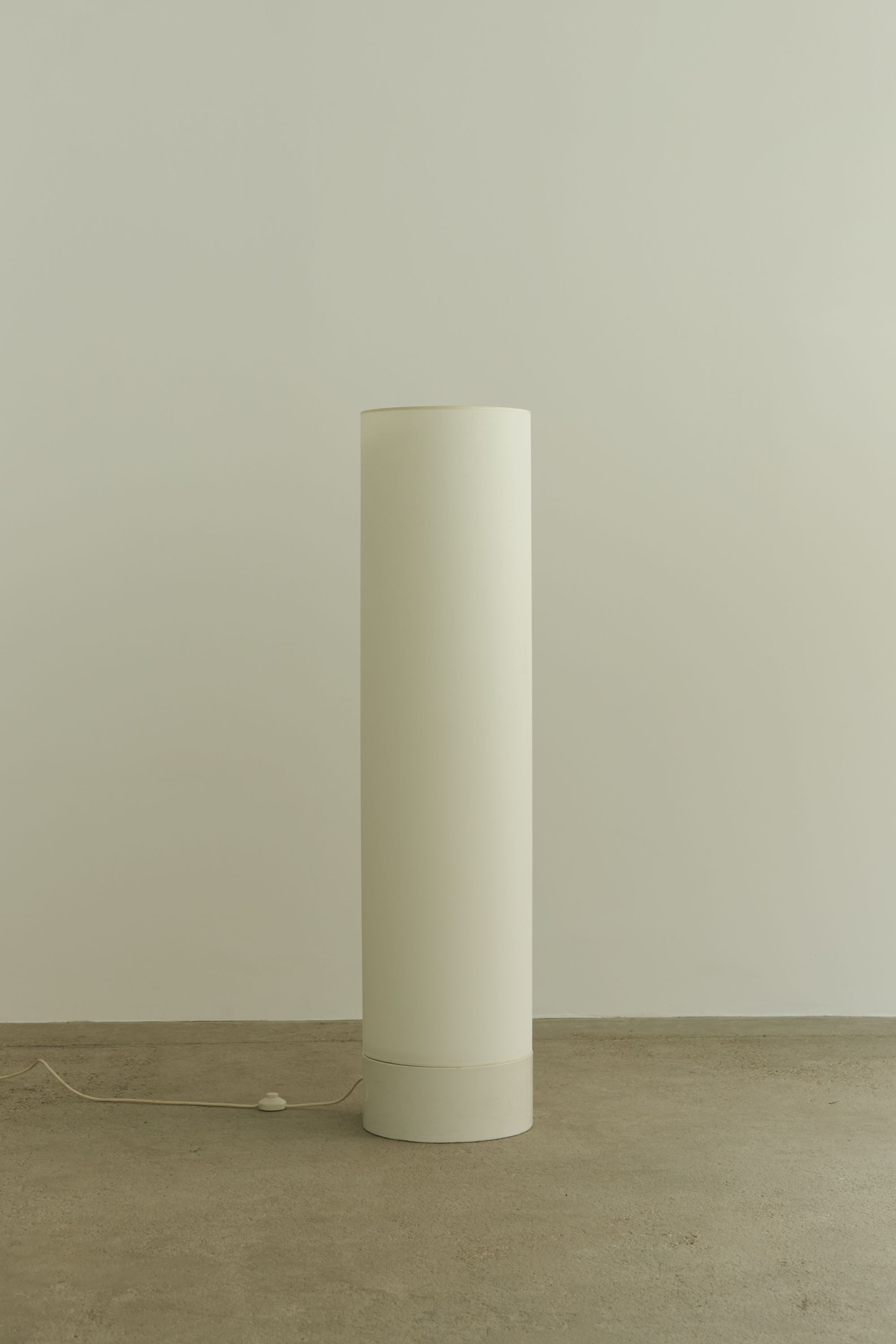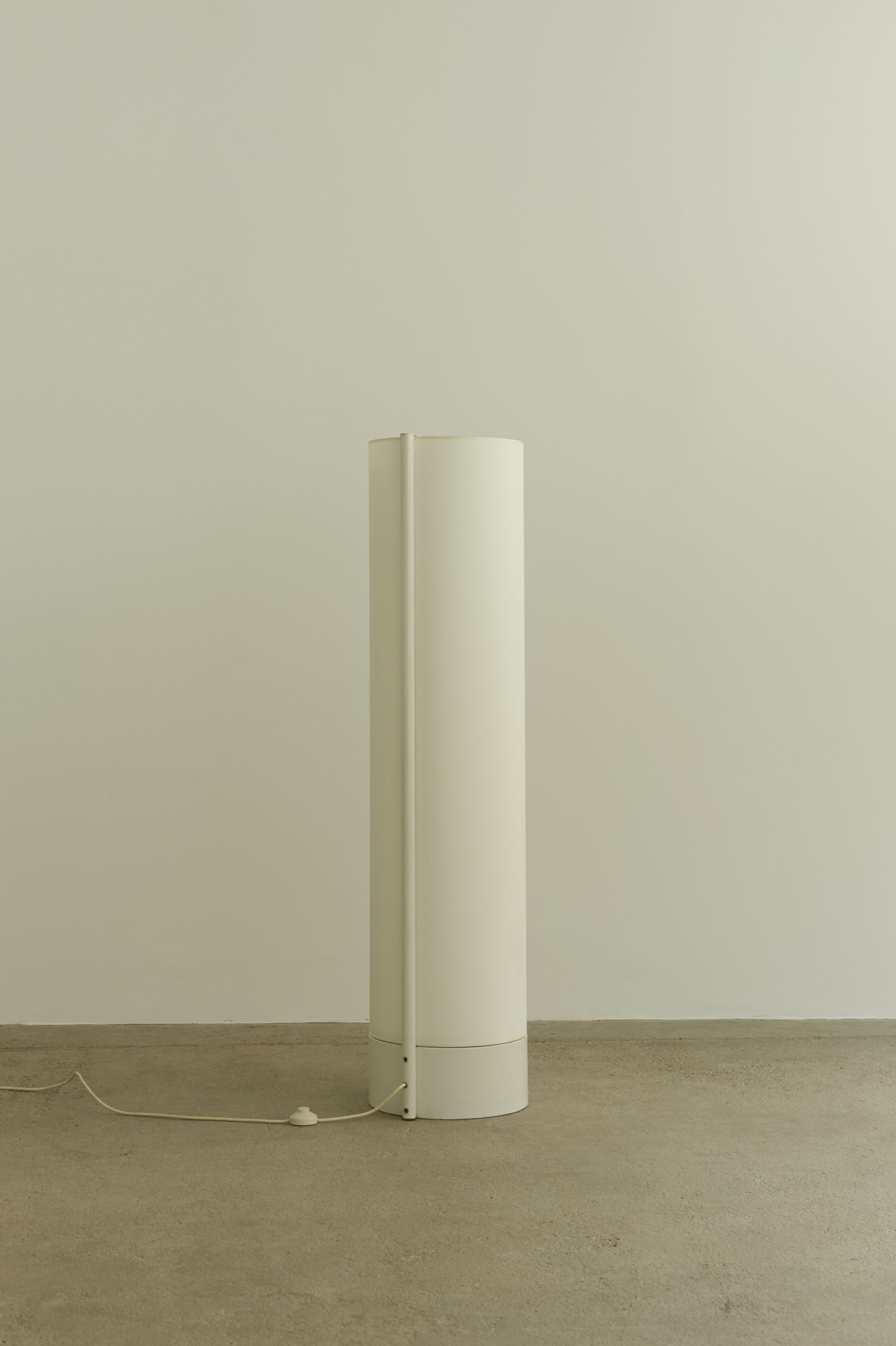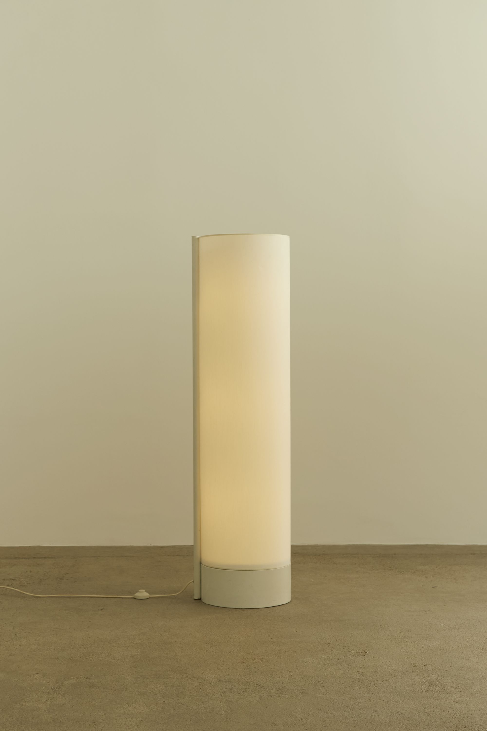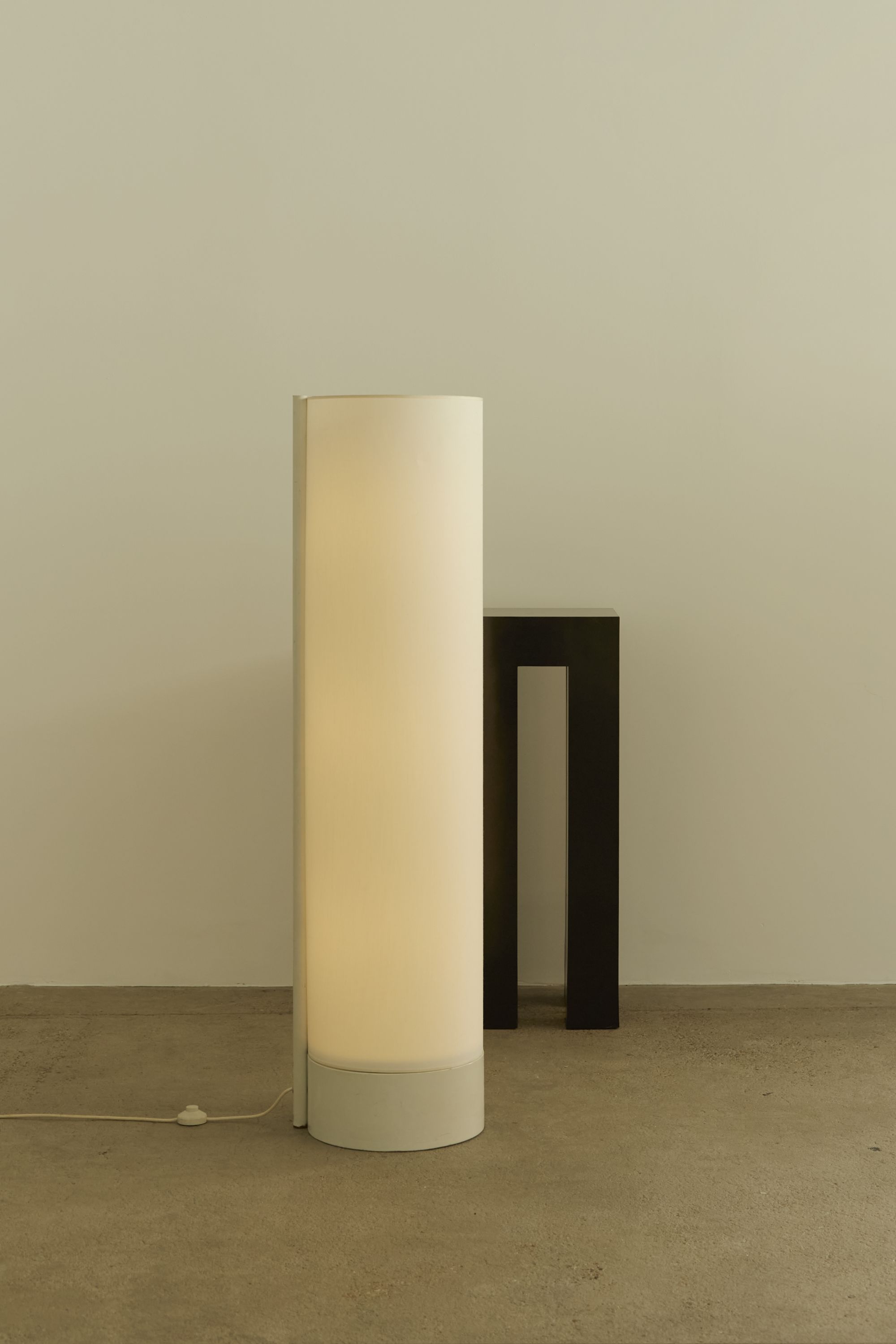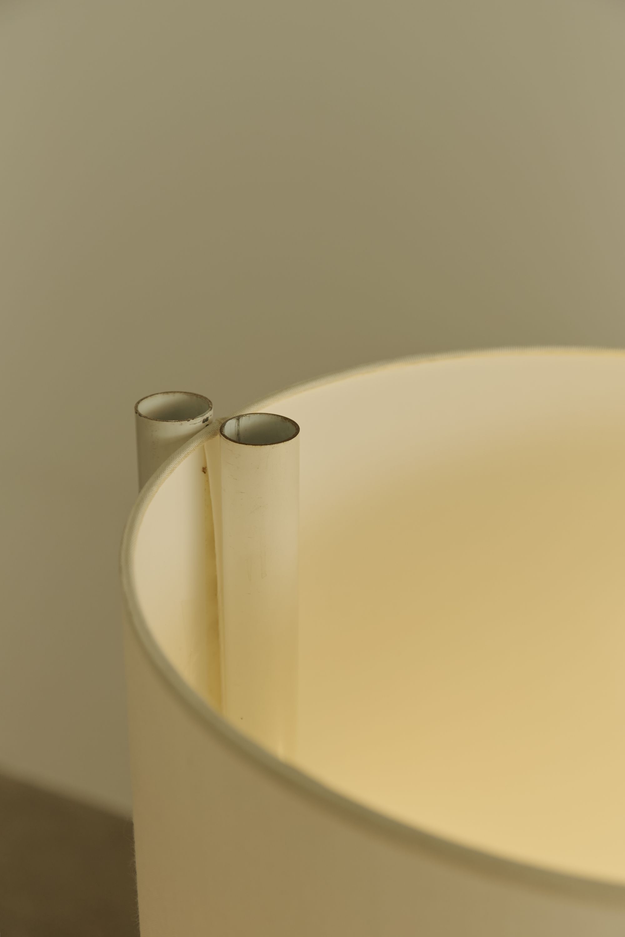A simple and elegant floorlamp designed by Giuliana Gramigna for Quattrifolio. The lamp is composed of two tubes, one sitting outside of the shade and the other inside hosting three bulbs for an evenly diffused ambient glow. Its round base and tubes are in white painted metal, the matched shade in a white coated fabric. The piece was produced in the 1970s and has some signs of use and is in good condition, its original EU plug and switch is intact and in working order.