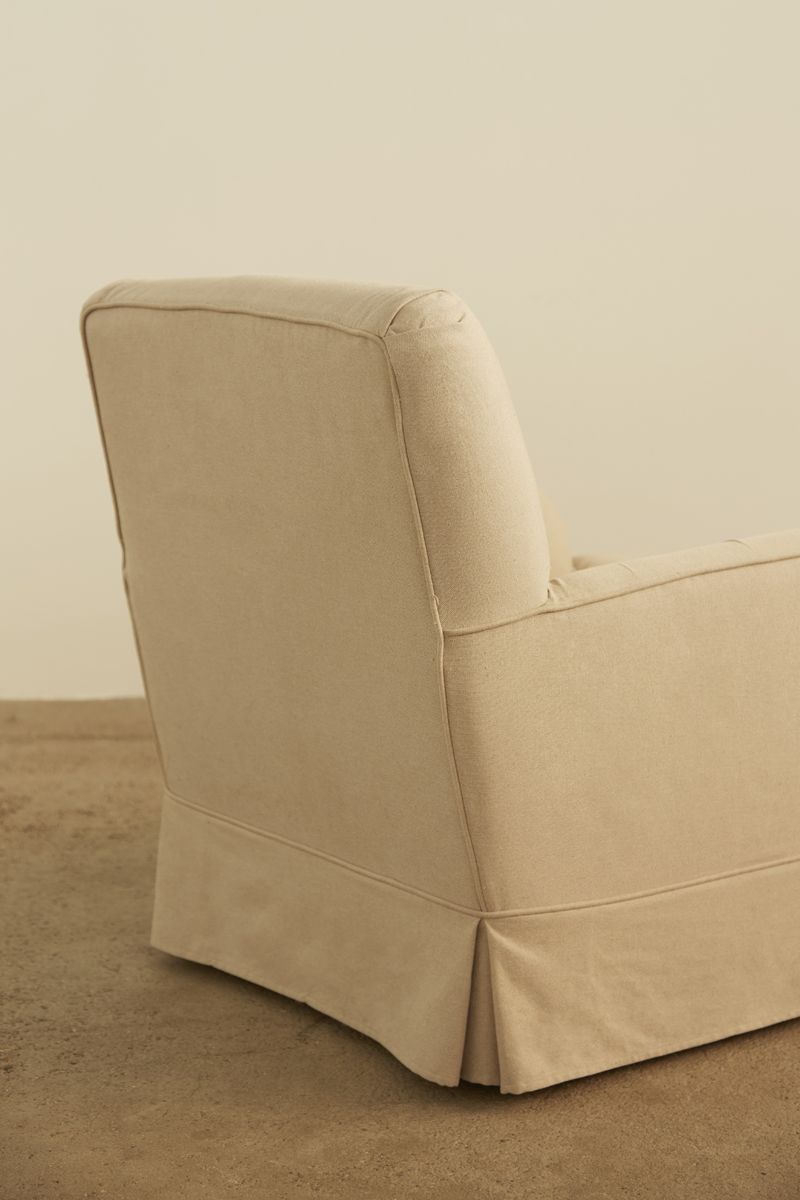 A pair of classic sand cotton slipcovered armchairs with a timeless silhouette. Featuring plush cushions and skirted bases, with beech feet, these chairs offer both comfort and elegance. Price is for the pair.
