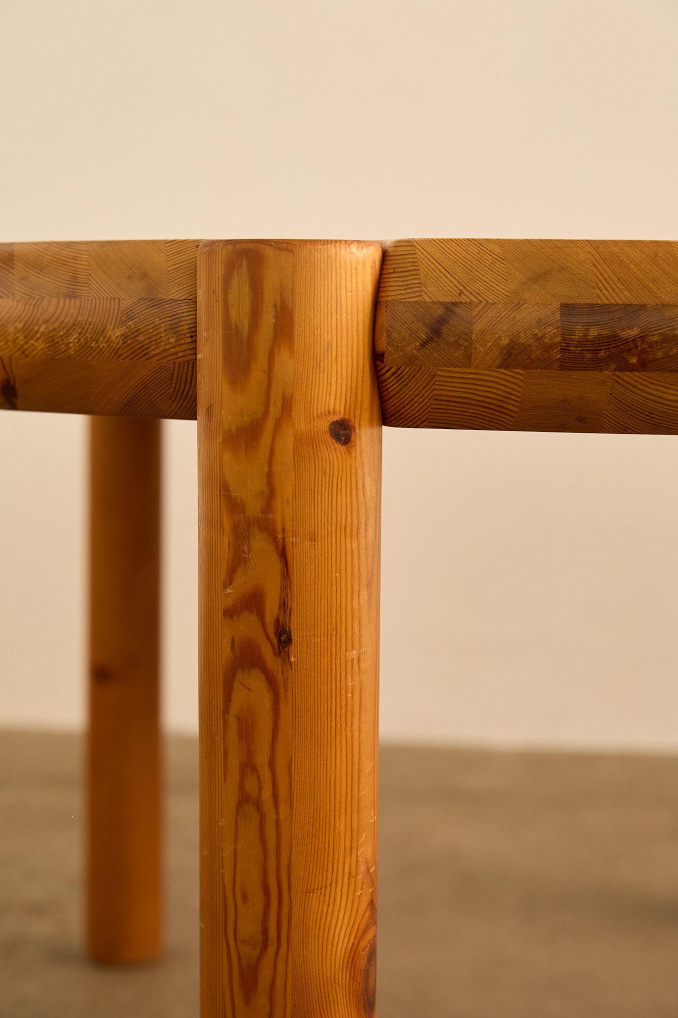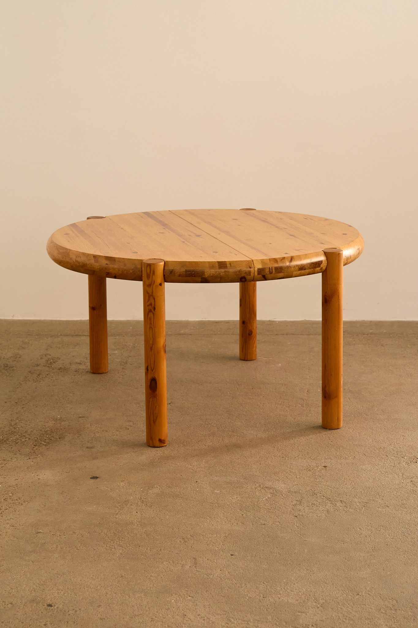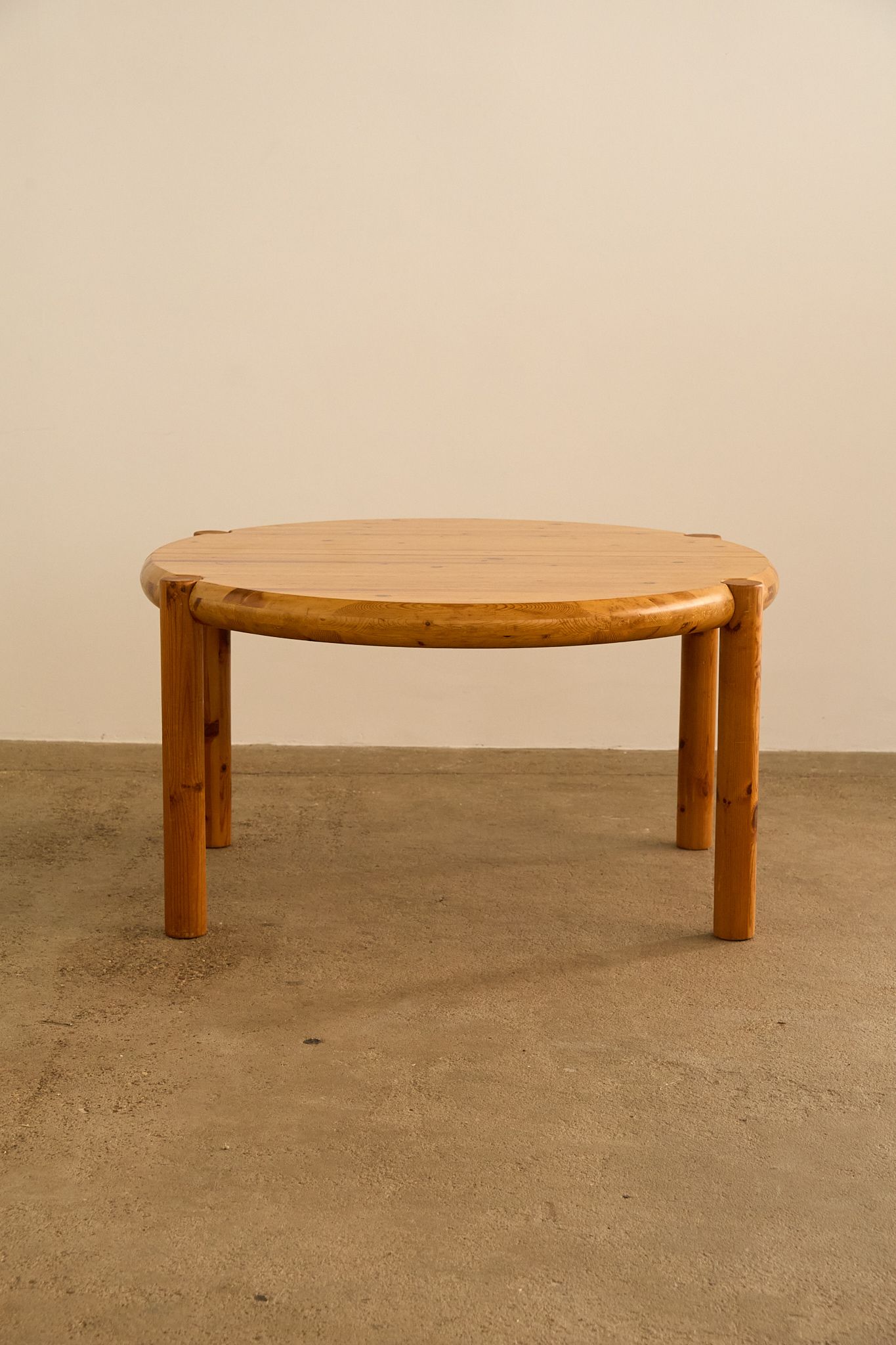 Round pine dining table by Rainer Daumiller, featuring a solid thick top with rounded edges and cylindrical legs that slot seamlessly into the tabletop. Daumiller’s work is celebrated for its sculptural simplicity and use of natural pine, highlighting the expressive grain of the wood while emphasizing durability and function.
