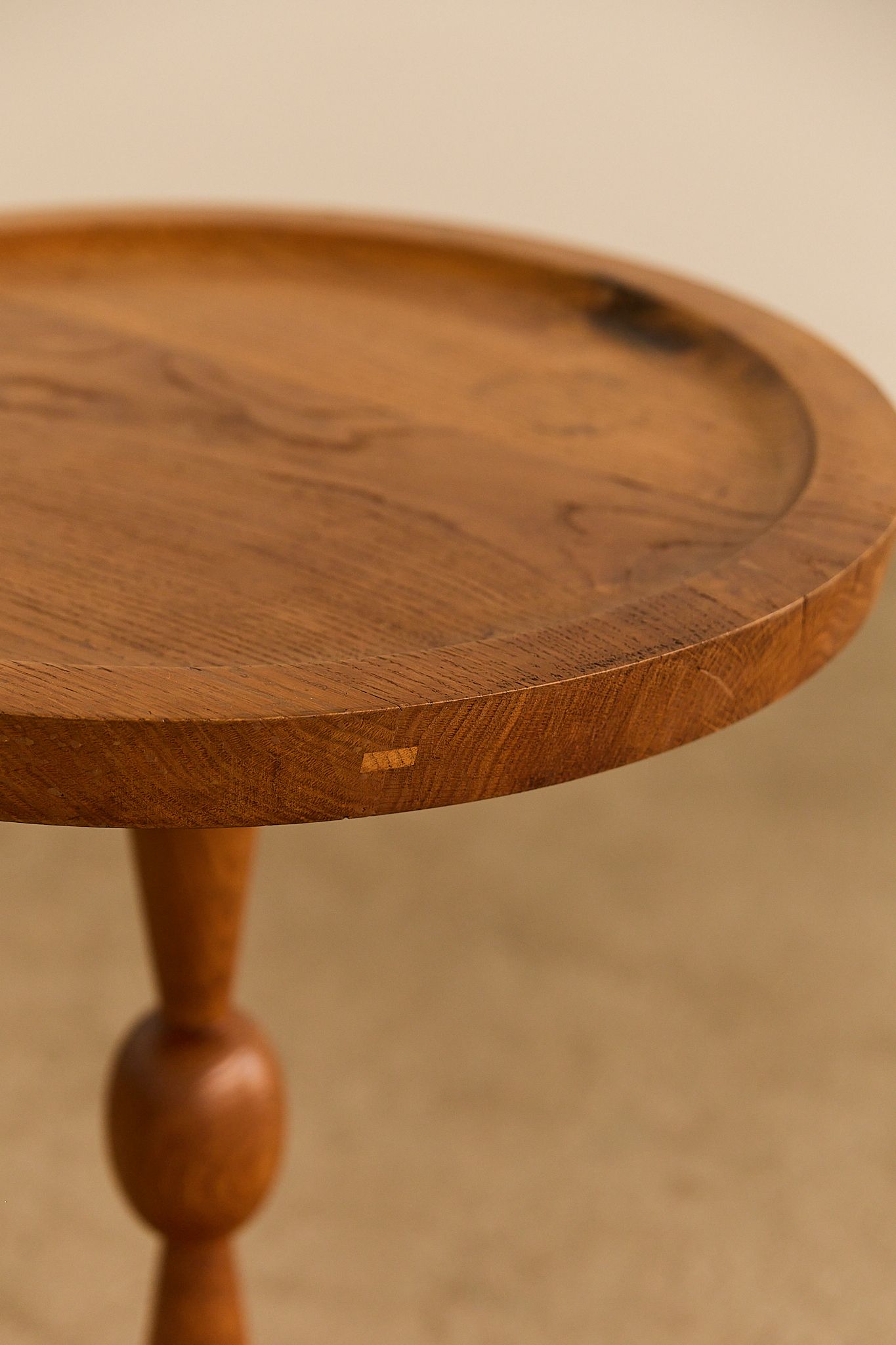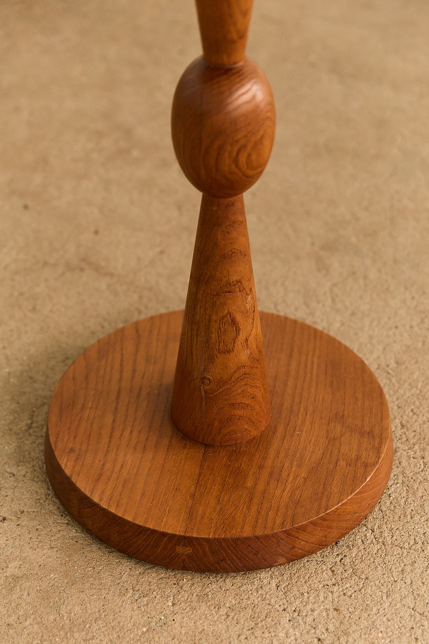 A beautifully crafted side table from the 1960s, made of solid wood with a warm, natural finish. The round tabletop features a subtle raised lip; Its sculptural base showcases refined turning work, balancing a tapering cone and rounded central detail on a circular plinth.