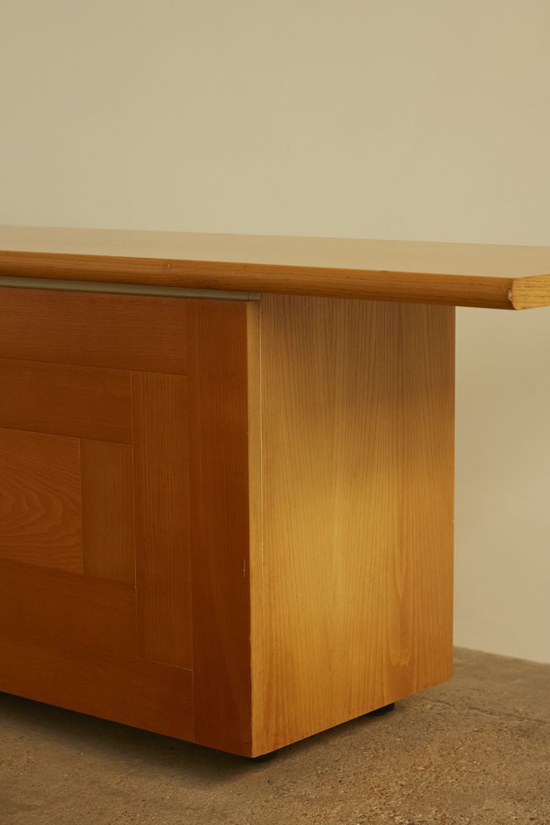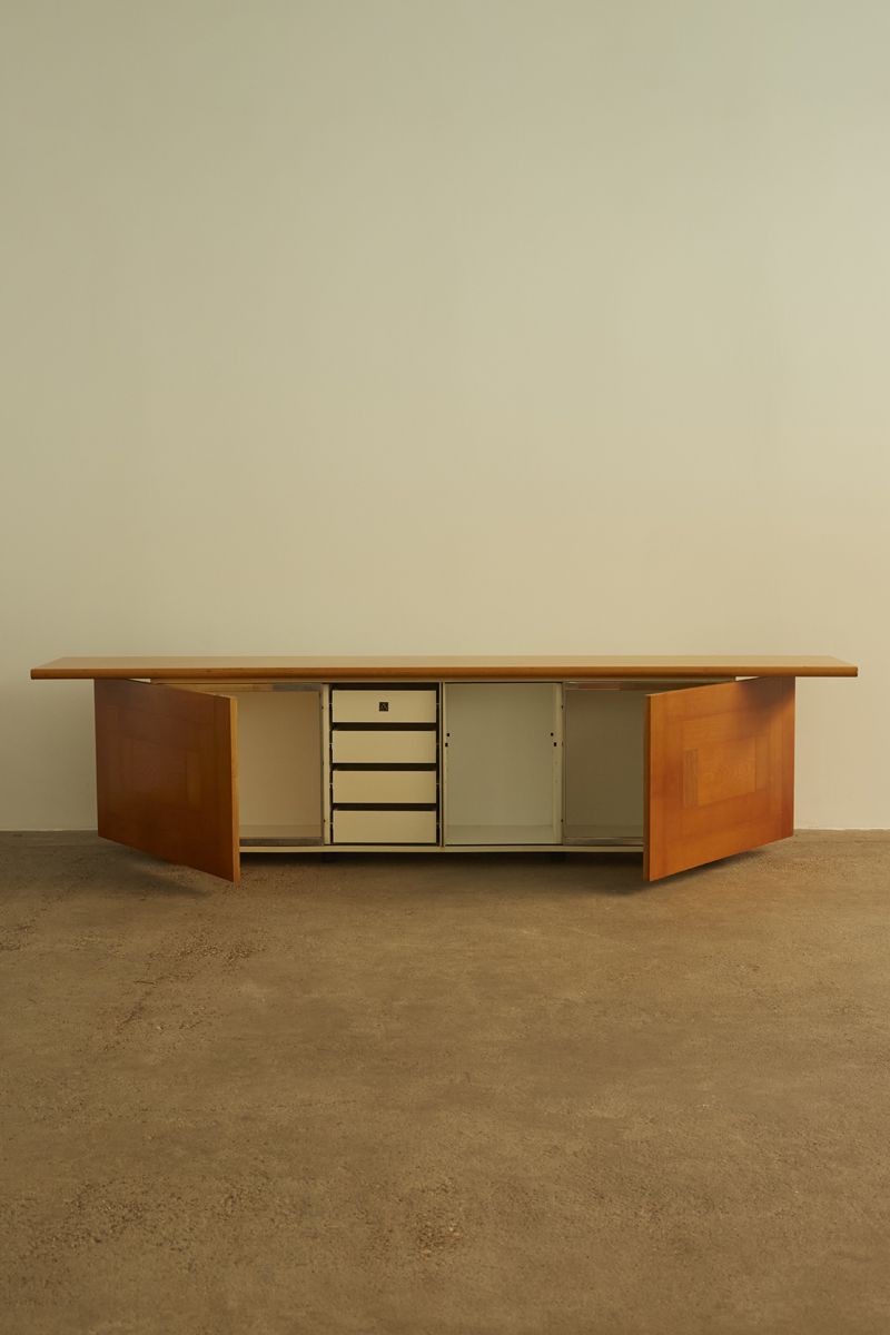 Sheraton Sideboard by Giotto Stoppino and Lodovico Acerbis for Acerbis, 1970s. This model, a winner of the prestigious Compasso d’Oro in 1979. In 1984, it was exhibited in Tokyo as part of the “Design Furniture from Italy” exhibition. The sideboard presented here is crafted in laminate and Tanganyika walnut-veneered wood, a rare version with exposed wood detailing. It features two sliding doors that reveal the central section, which houses four drawers. A distinctive design element lies in the doors: halfway through their movement, they transition from sliding to swinging open.